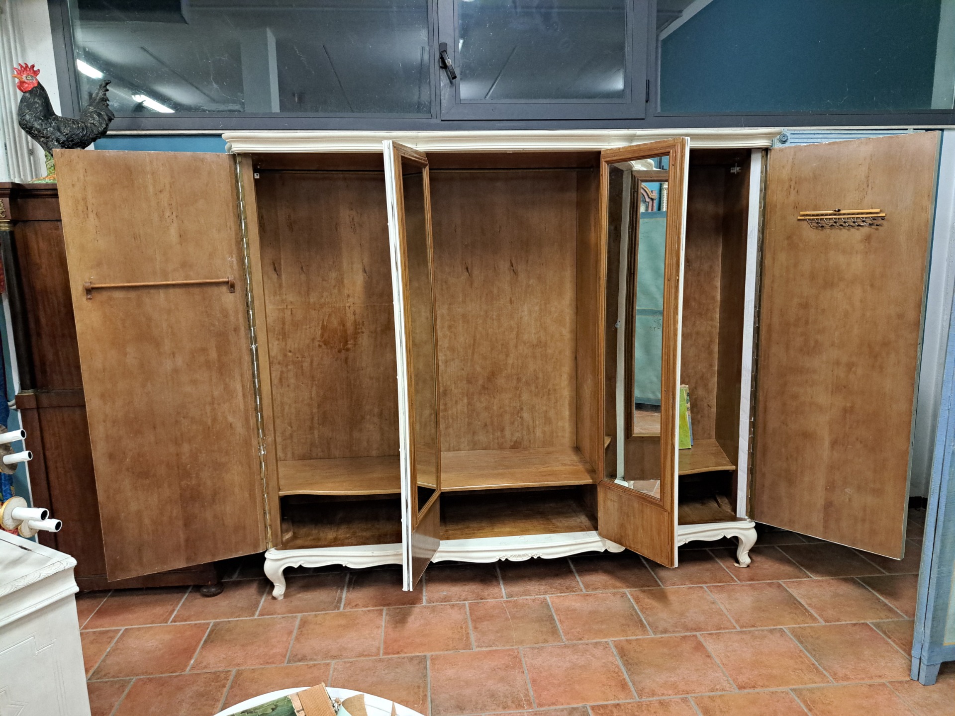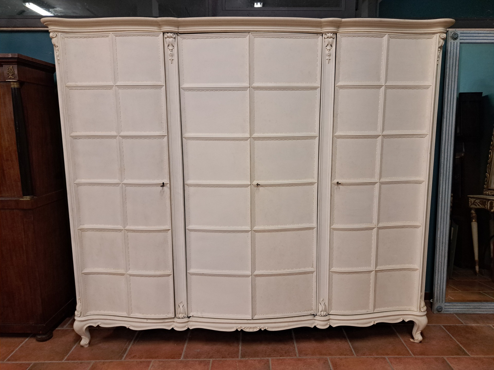 Delightful 20th-century 4-door wardrobe painted in an ivory tone. Entirely curved on the front and sides, 2 coeval mirrors internally mounted on the central doors, elegantly curved feet and apron. Completely demountable. Size: 232 x 56 h 190