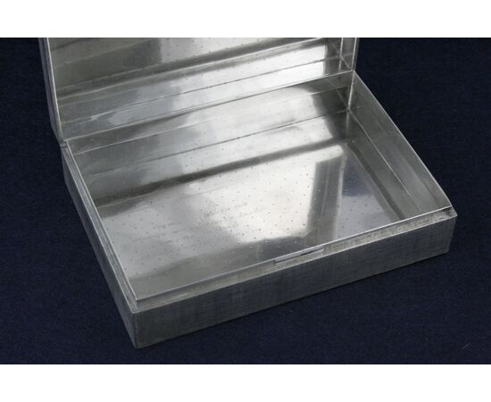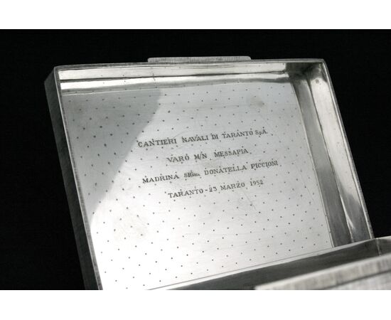 Scatola rettangolare in argento 800 ‰ sul coperchio è incisa una caravella, all’interno scritta commemorativa “ Cantieri Navali di Taranto spa, Varo motonave Massapia , Madrina sig.ra Donatella Piccioni Taranto 23 Marzo 1952 “ firmata Buccellati Roma Milano Firenze