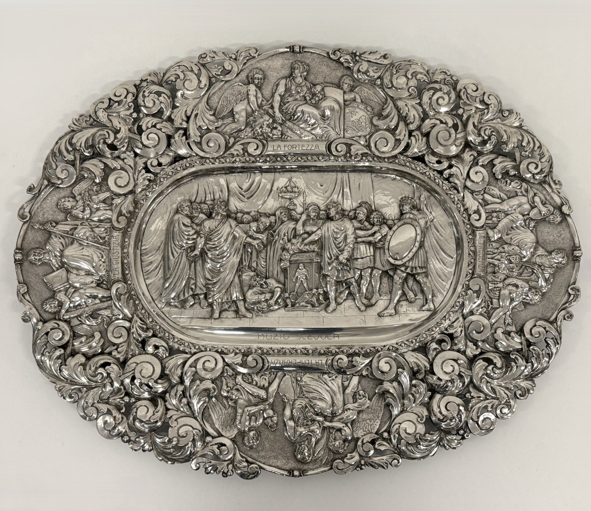 Large parade plate, Milan, 20th century, in embossed silver. In the center, the main scene depicts "The courage of Mucius Scaevola" after Appiani, the rim is decorated with allegories of the four cardinal virtues, interspersed with acanthus leaf scrolls, cm 78x100; gr. 5250; hallmark: Speronari 3 Milan and title 800