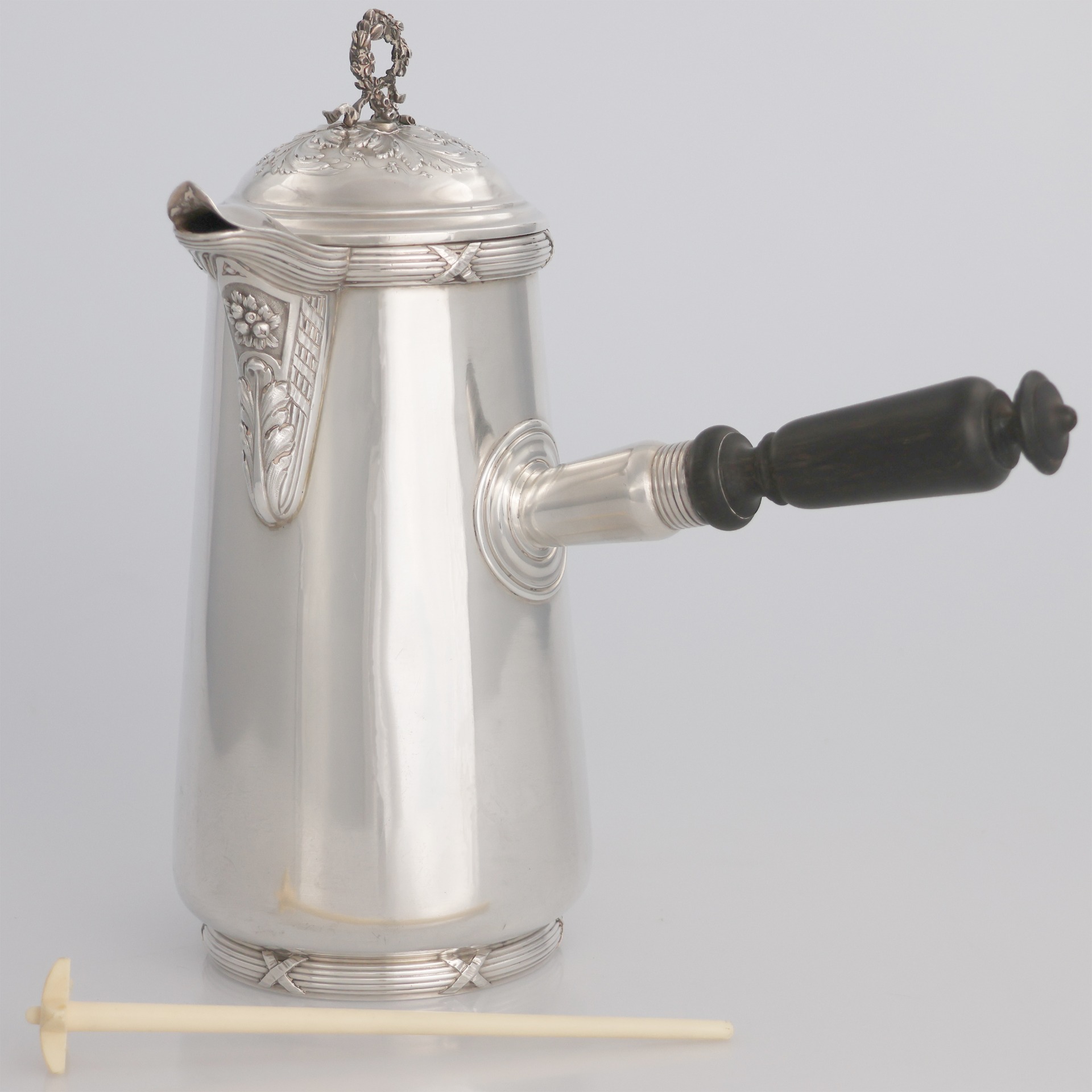 Slight signs of wear and superficial scratches. The manufacturer's hallmark is at the base of the chocolate pot. The head of Minerva is present on the side of the chocolate pot.