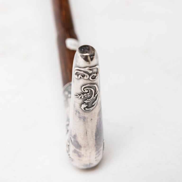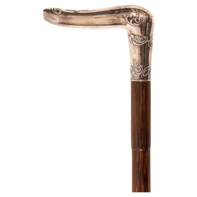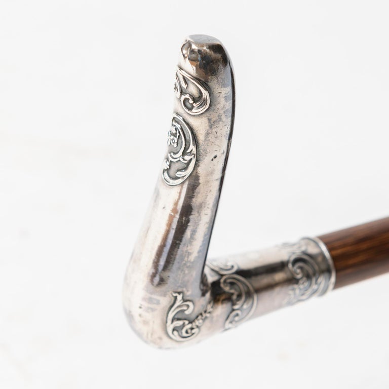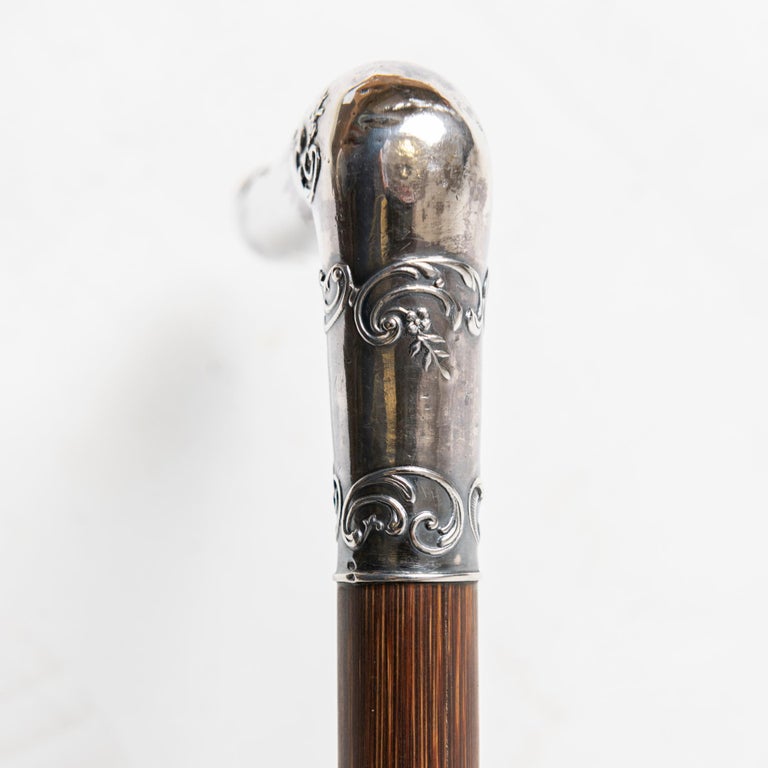 Antique walking stick, possibly French, 91.5 cm long (86 + 9.5 cm silver handle) x 6 cm. In perfect Art Nouveau style.