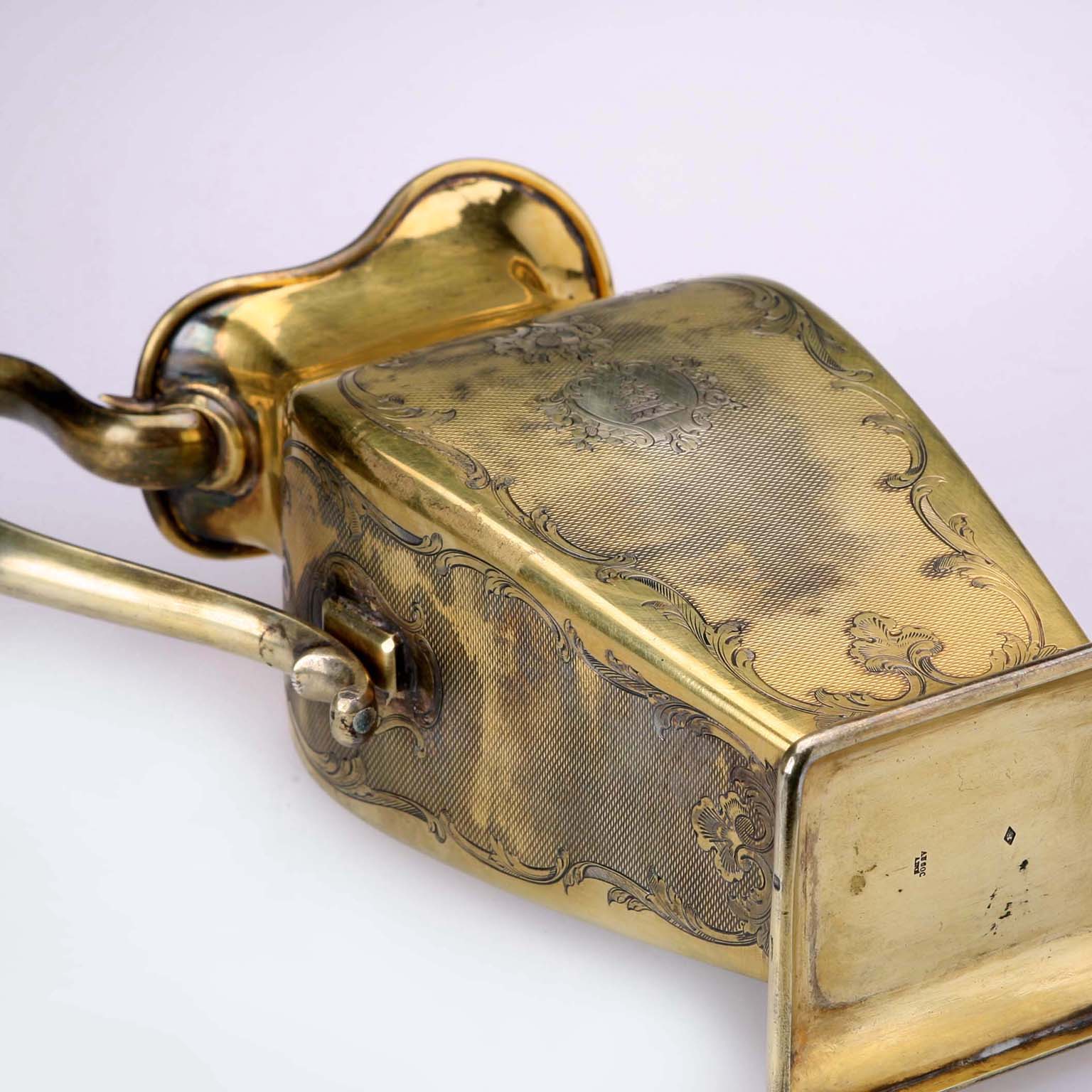 Brocca in argento vermeil finemente cesellato e lavorato a bulino. Nella riserva stemma araldico raffigurante testa di leone. Marchi dell'argento e dell'argentiere incussi sotto la base. Grammi 800.