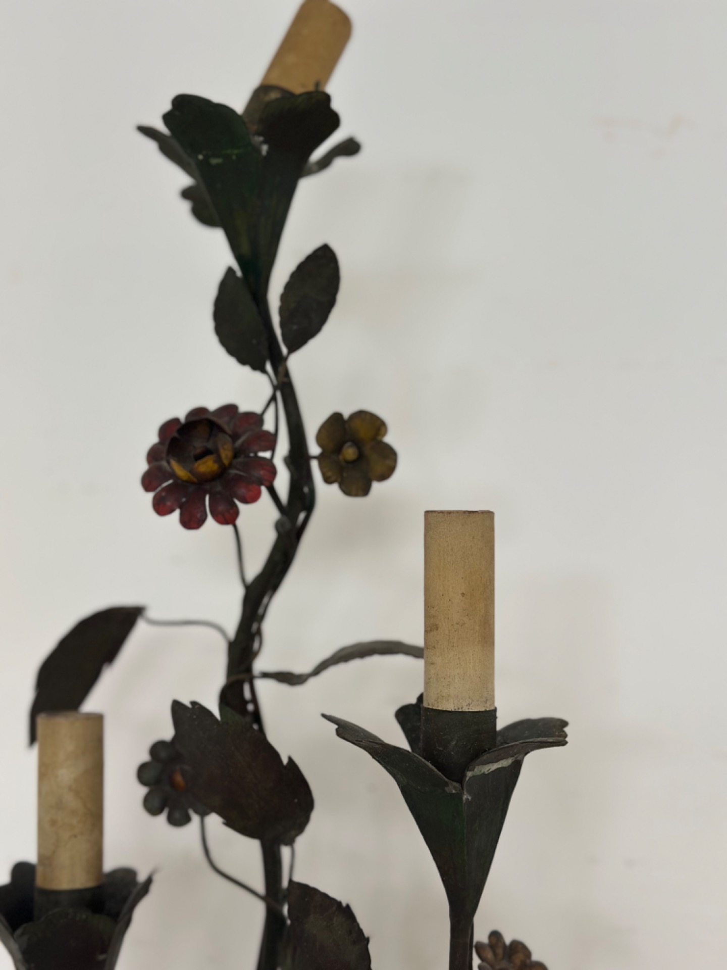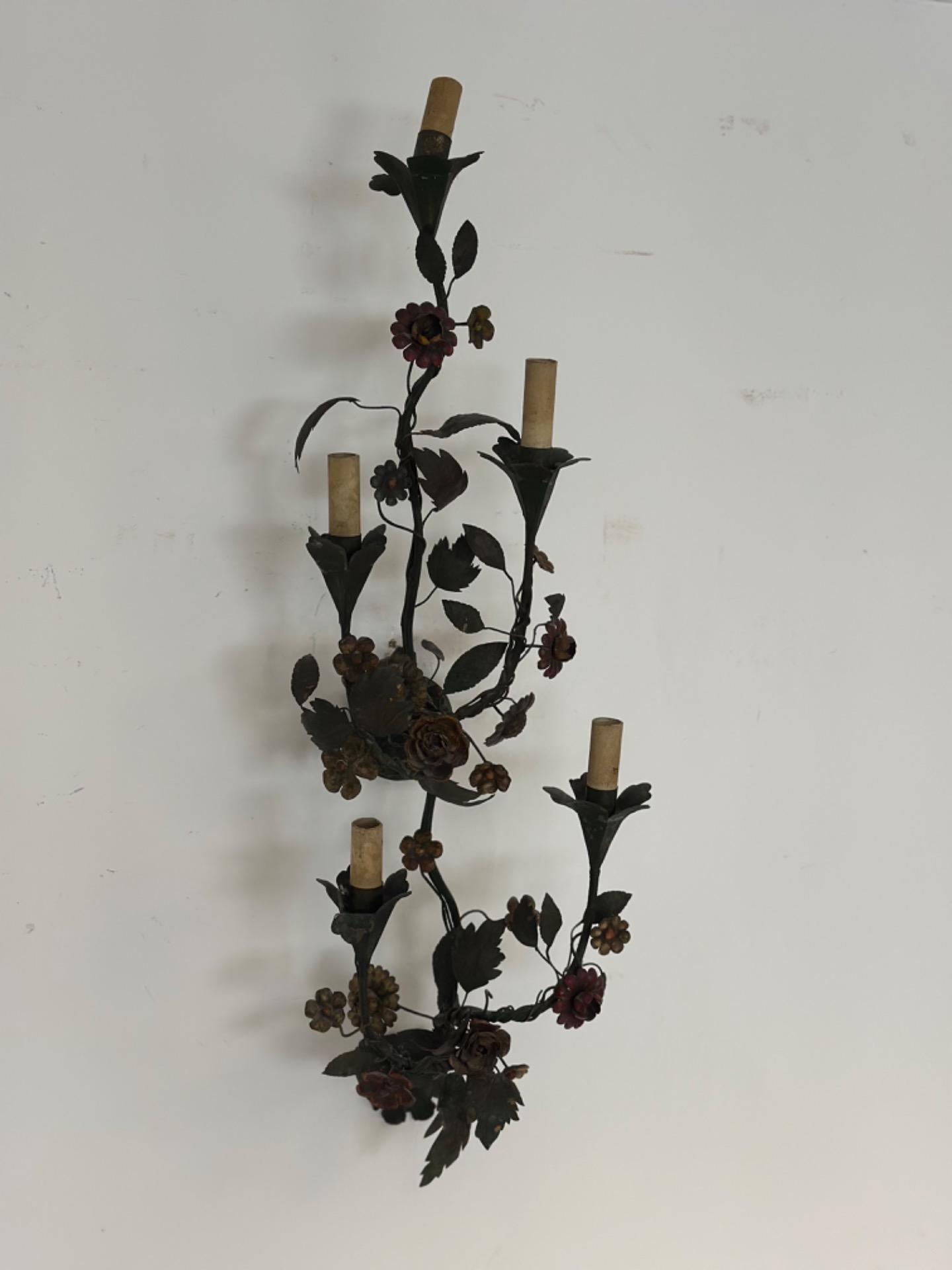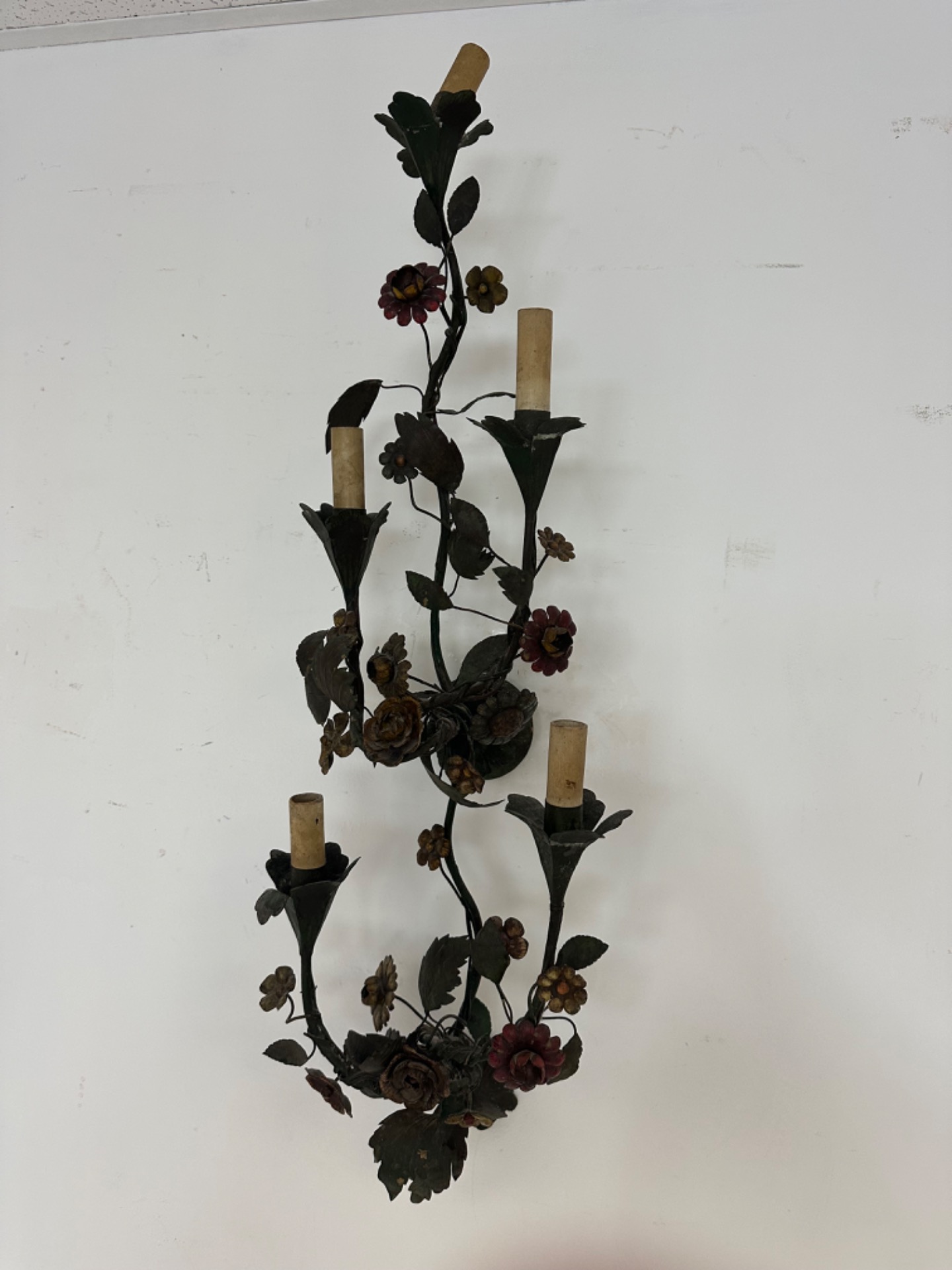 Applique Capodimonte con cinque luci epoca inizio 900 tutta in lamierino dipinto e lavorata a motivi floreali Capodimonte 900 misure : H 84 x 27 si certifica la sua autenticità si rilascia fattura di vendita spedizioni in tutta Europa non esitate a contattarci accettiamo pagamento pay pal visa Mastercard