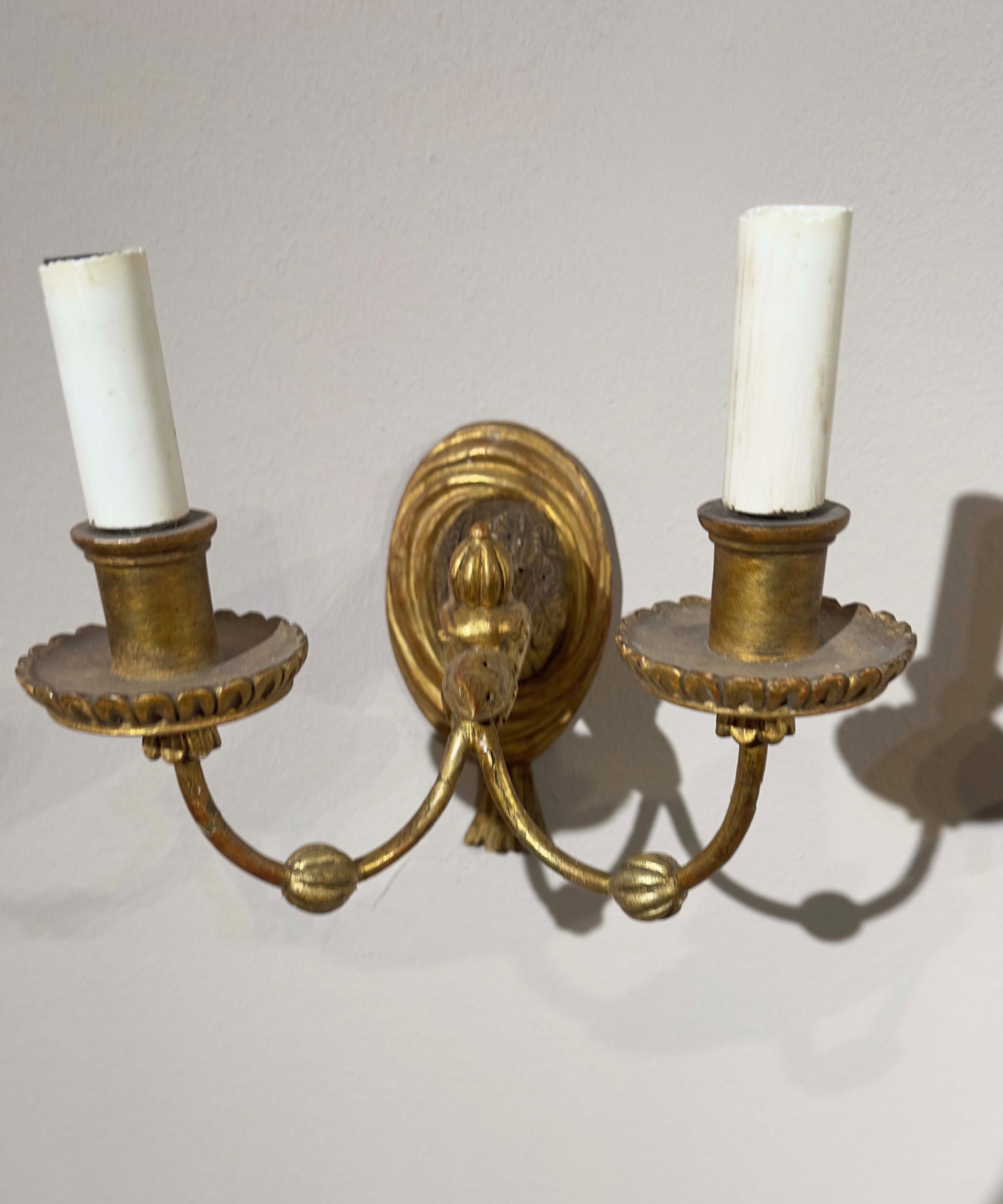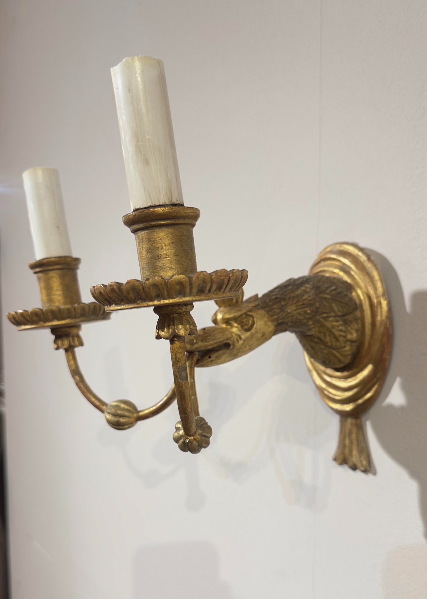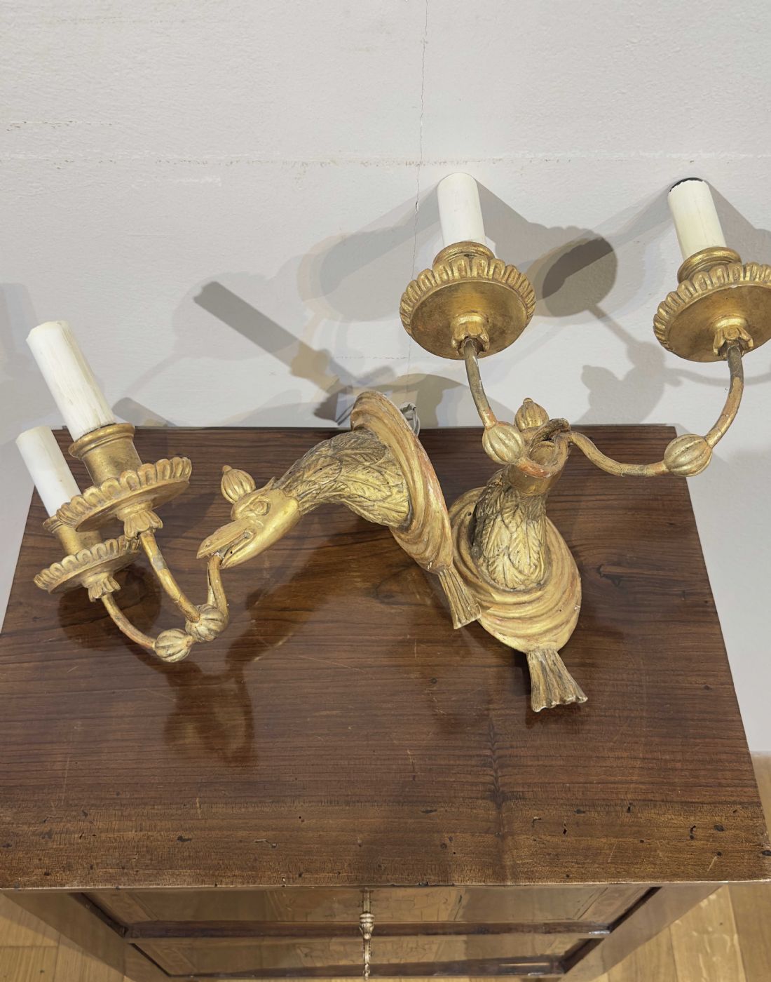 Elegant pair of carved and gilded wood sconces with pure gold leaf. These refined sconces are equipped with two lights each and are electrified. Their peculiarity lies in the art of carving: at the center of the sconces are carved delicate faces of imaginary birds, finely worked, from whose beaks branch out the two arms that support the lights. The arms have a curved shape and are embellished with geometric decorations, giving them an elegant and sophisticated appearance. This pair of sconces represents an object of great taste and refinement, capable of enriching any environment with style and class. Italian manufacture, from the Napoleon III period, around the second half of the 19th century.