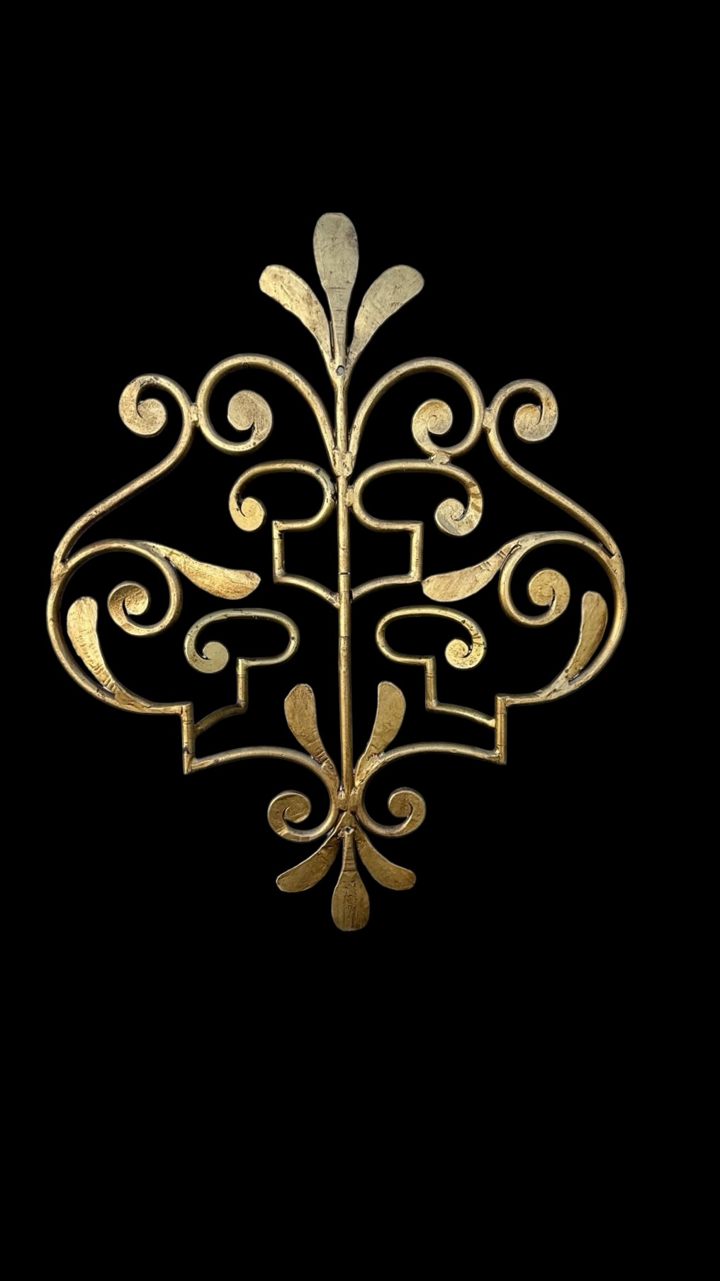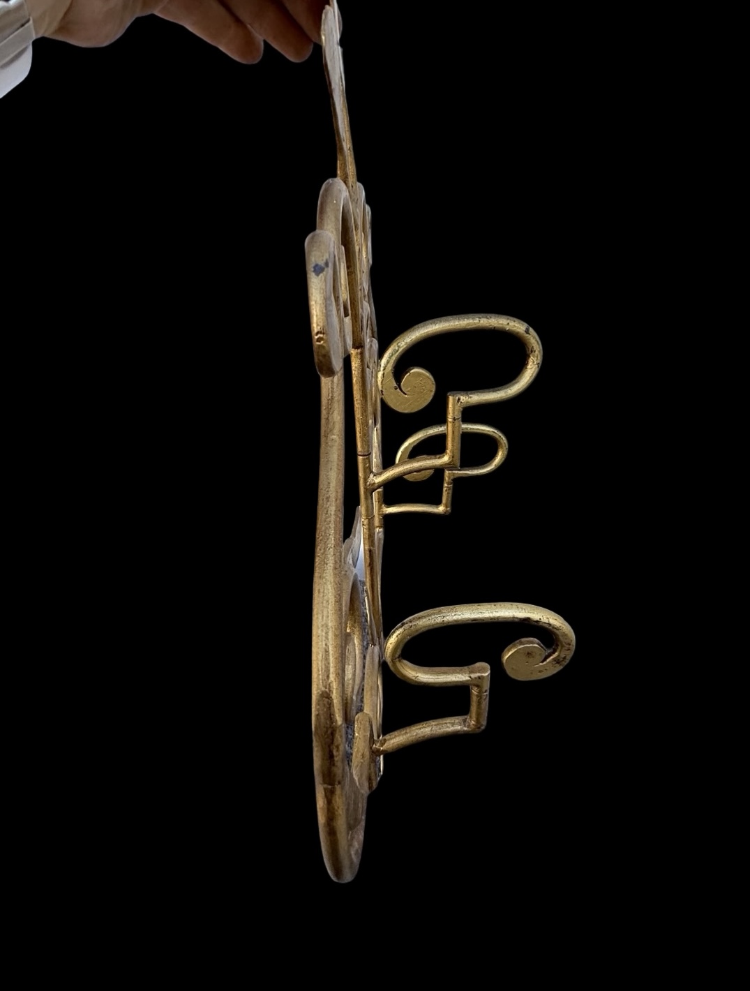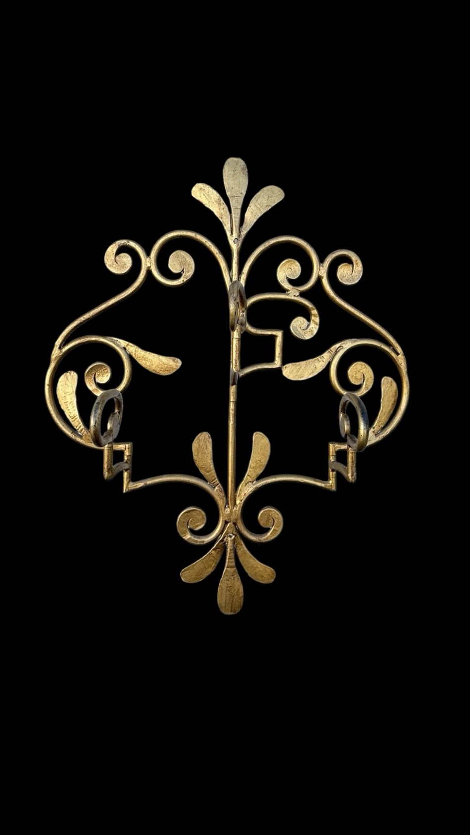 Wrought iron and gilded coat rack wall light with stylized vegetal motifs and three rotating parts. Cm 58x47. Depth of open rotating parts: cm 13.