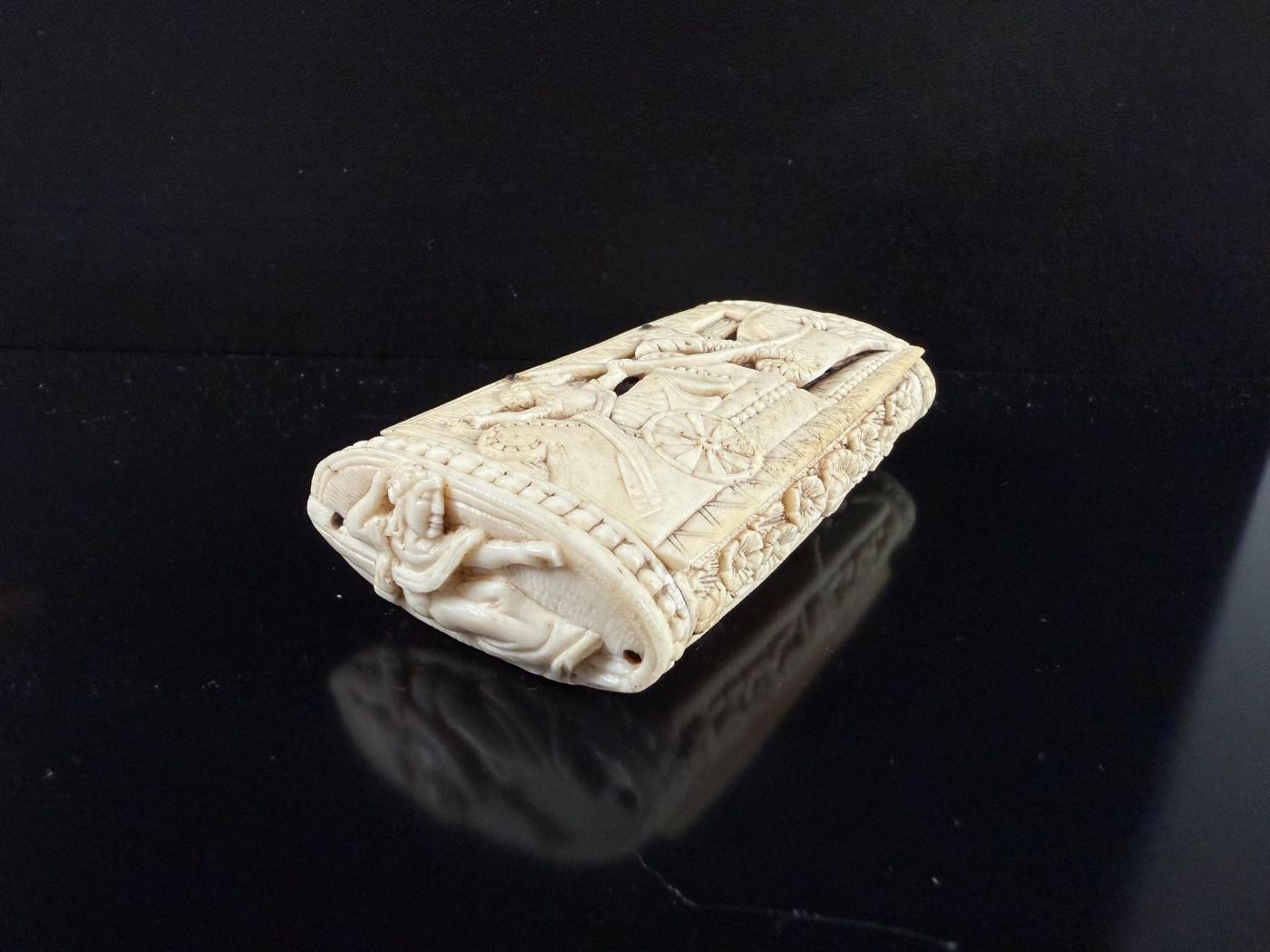 Beautiful bone snuffbox carved in bas-relief: on the lid, an emperor on a chariot pulled by tritons; on the back, a group of figures worshiping waders nesting on a temple guarded by a dog; the sides are decorated with figures in ancient style wearing togas.France, 18th century