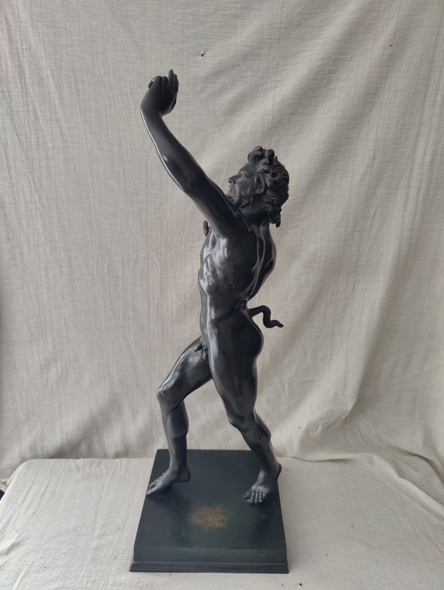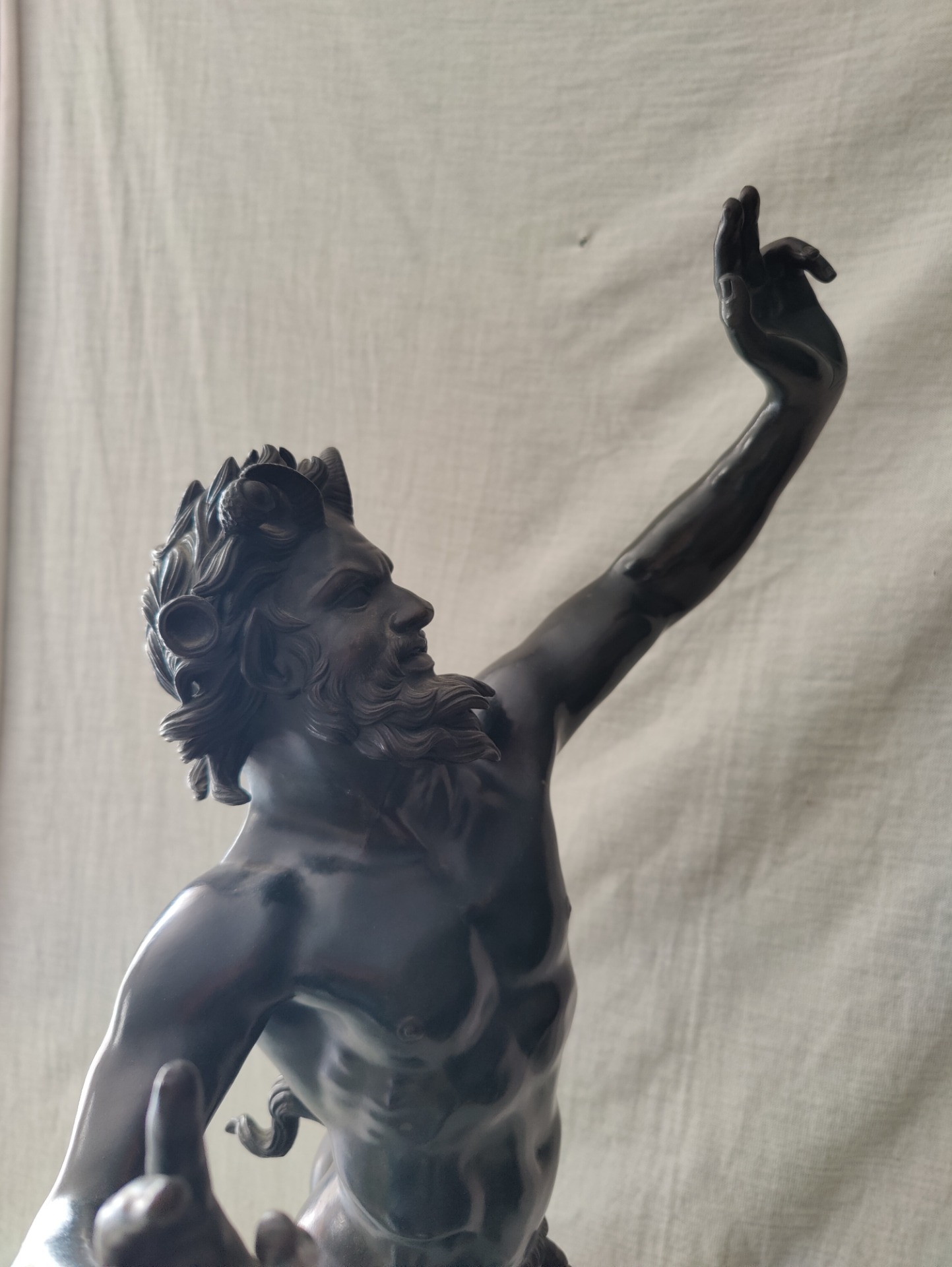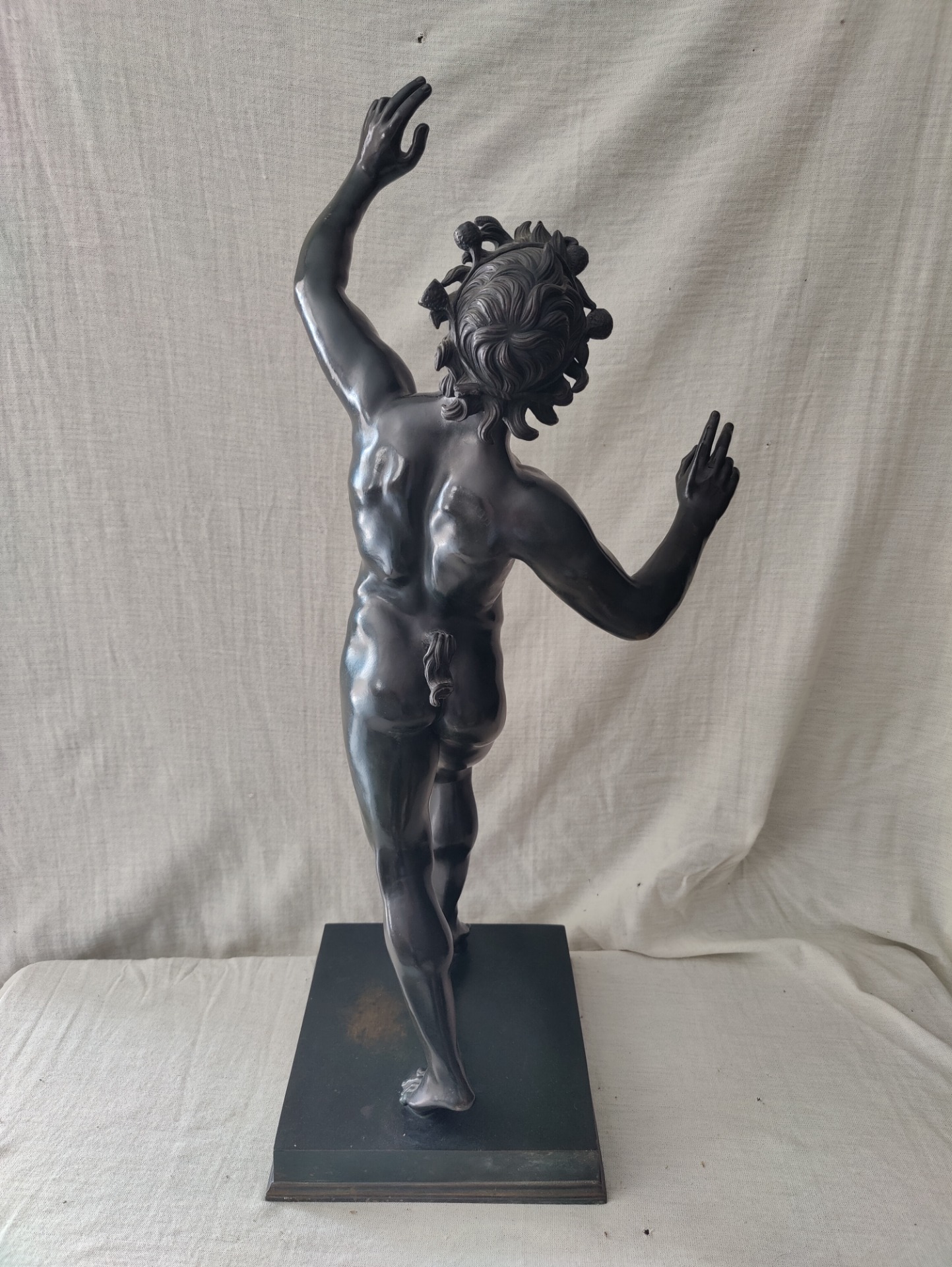 Bellissima scultura in bronzo raffigurante un Fauno danzante. Opera proveniente da una collezione privata, Italia. Il fauno nella mitologia romana è una divinità della natura, dei boschi e della campagna. La scultura lo rappresenta in un'attitudine dinamica, come se stesse danzando. Dalle generose dimensioni, proporzionata e dal peso opportuno. Perfetta come complemento d'arredo, presenta una patina deliziosa. Bella la cura e la precisione dei particolati anatomici. Lotto integro ed in ottime condizioni generali. Sarà spedito con cassa di legno e con adeguato ed opportuno imballaggio. Spedizioni economiche, sicure e tracciabili in tutto il Mondo. Disponibile anche il ritiro presso il nostro magazzino. Misure: - H 80 cm - Base 27 x 27 cm