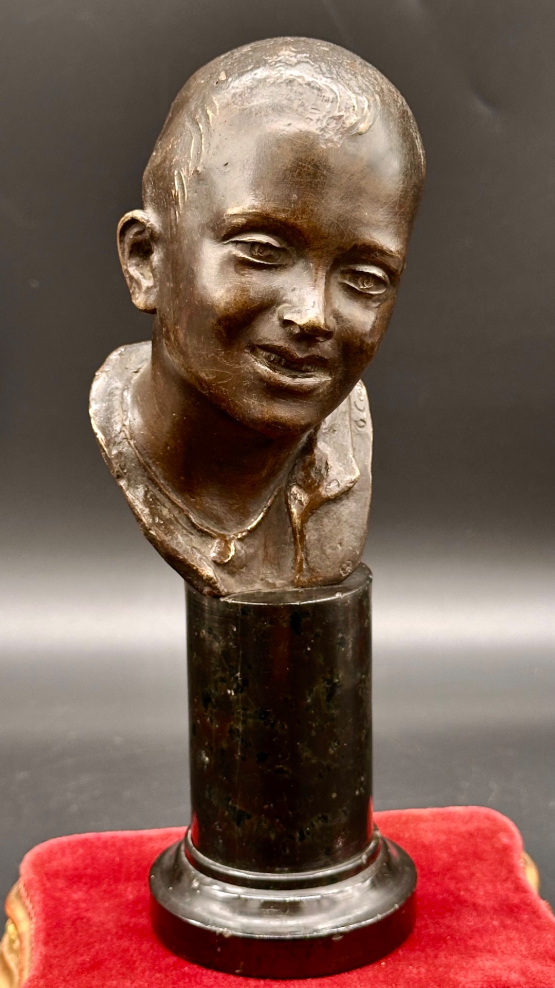 Elegant bronze bust depicting a young man with a smiling and natural expression, modeled with remarkable sensitivity in rendering the features of the face, the delicacy of the gaze, and the light dynamism of the head's inclination.