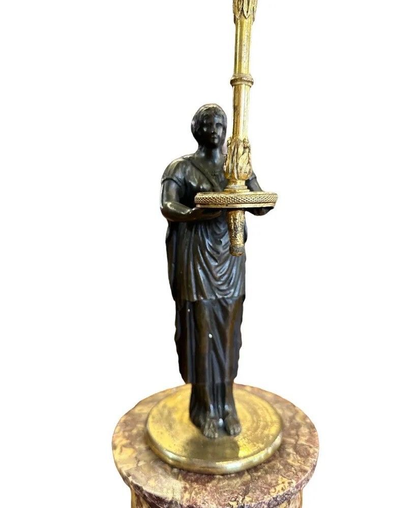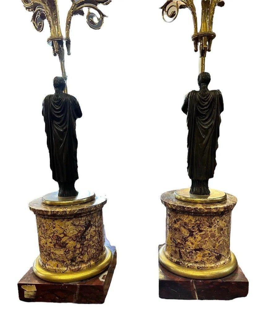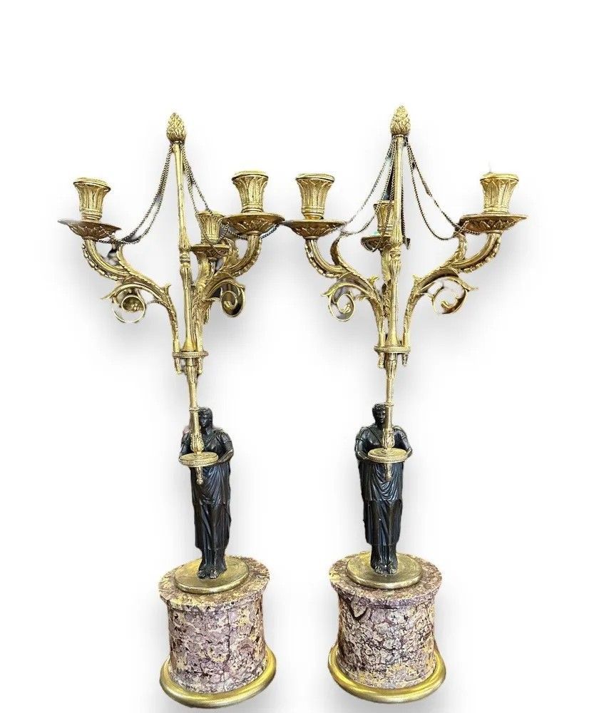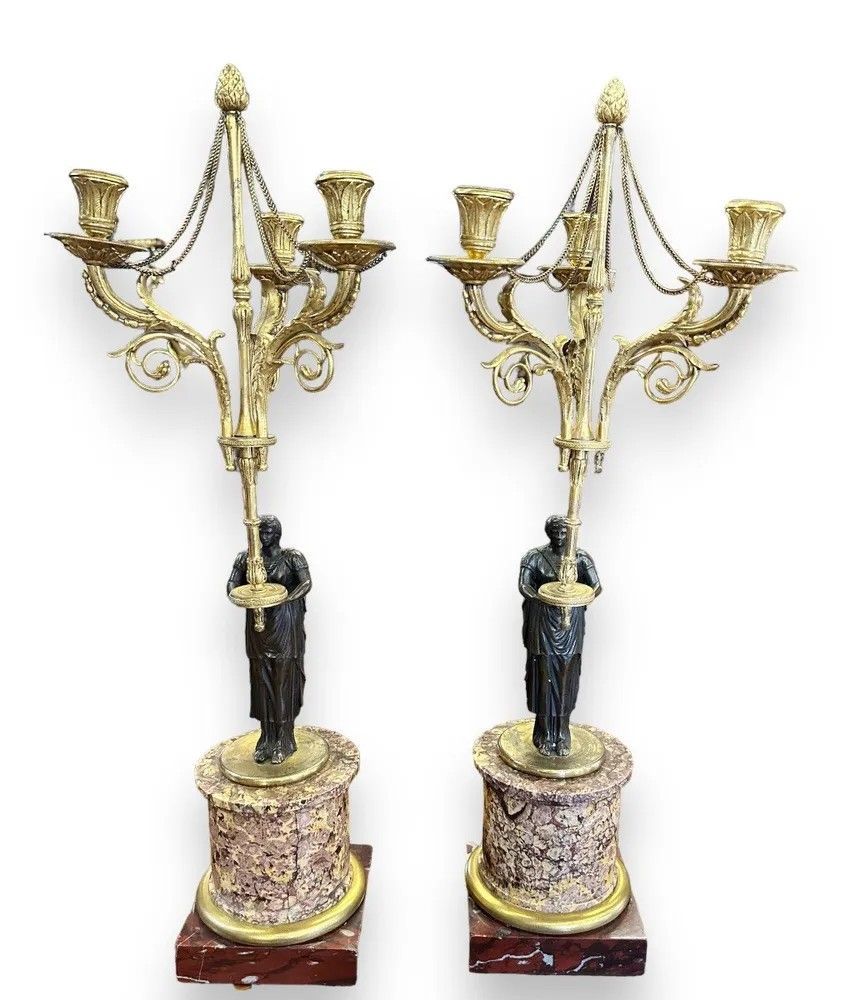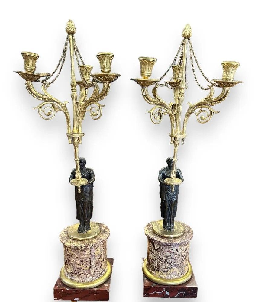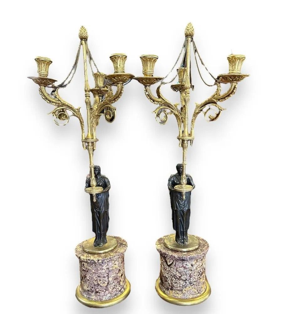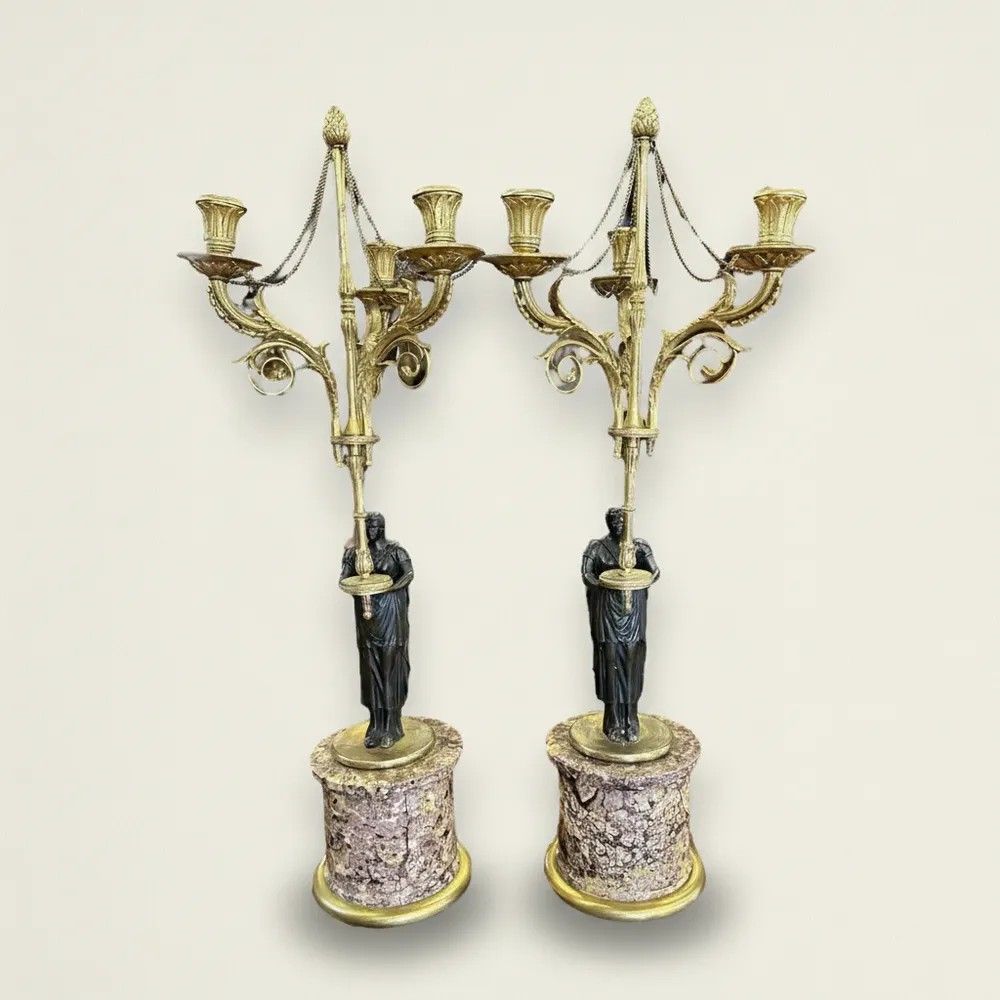 Coppia di Candelabri Impero in Bronzo Patinato e Dorato
