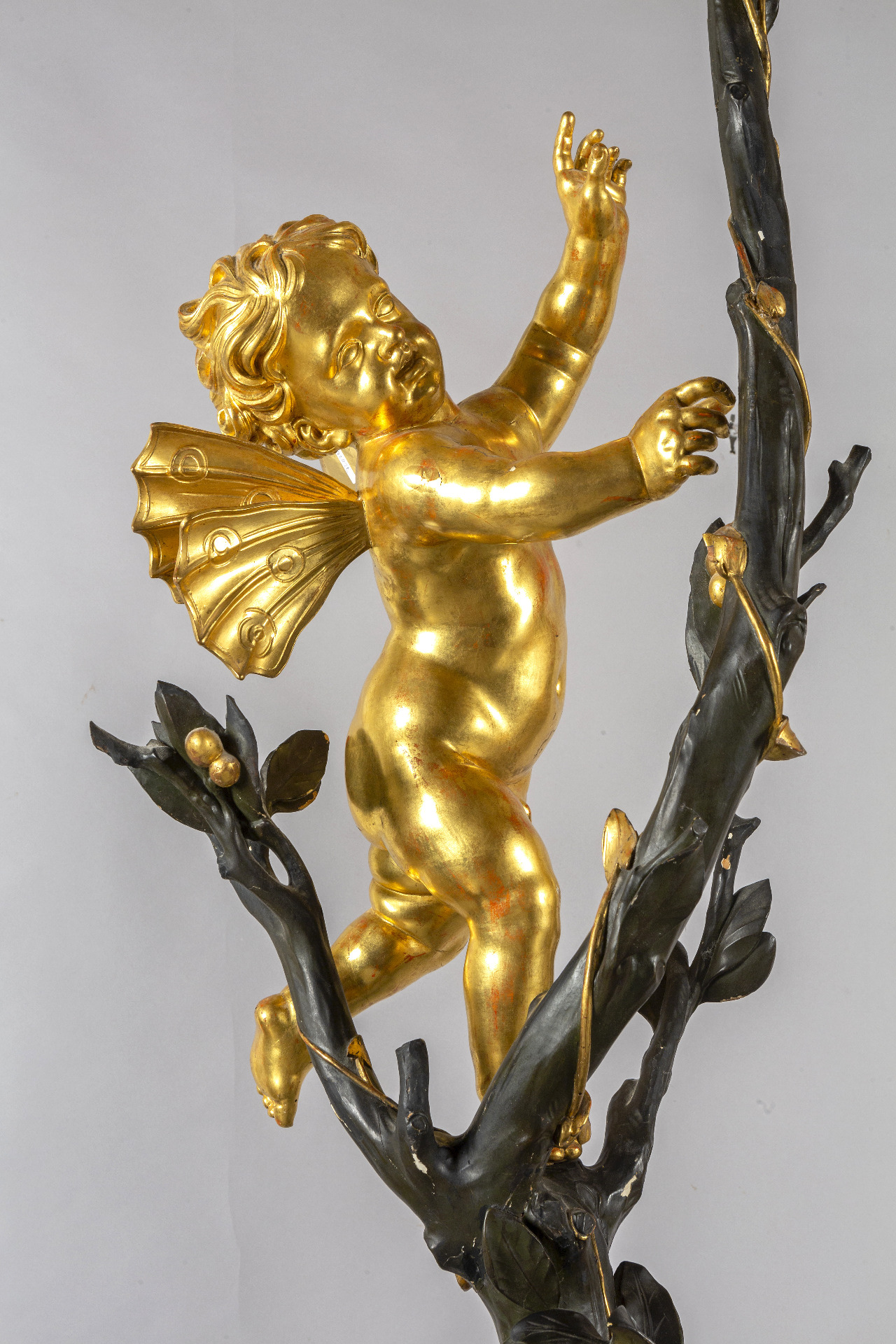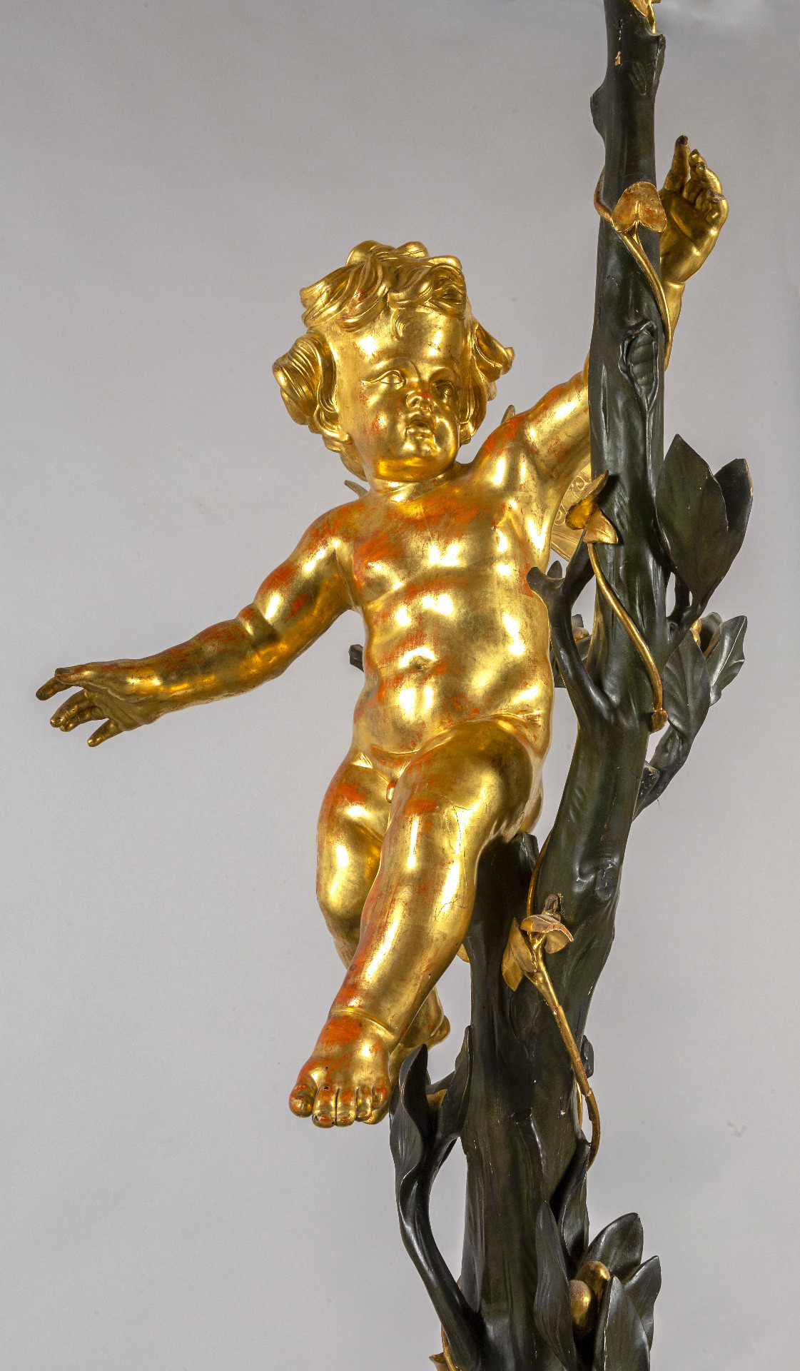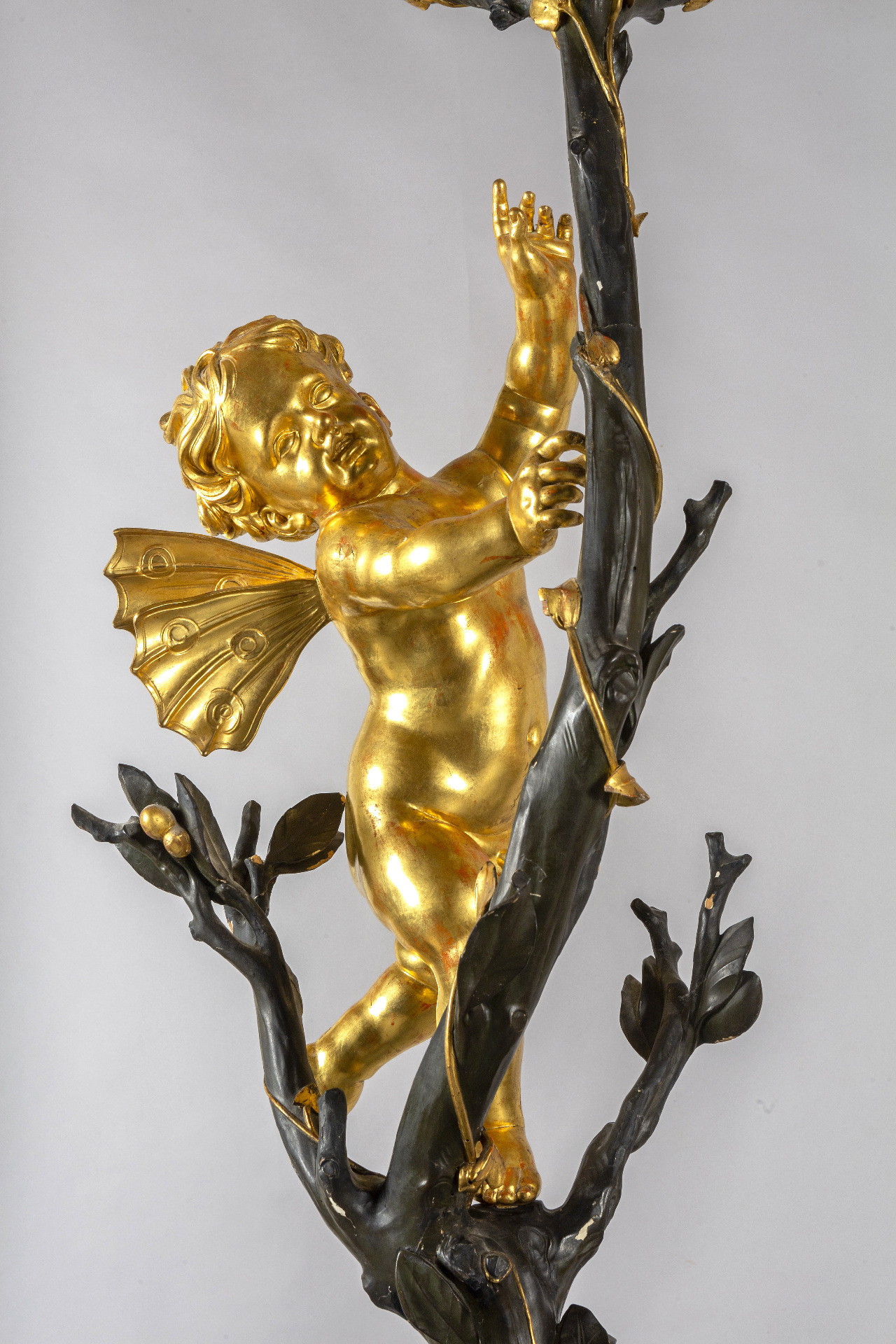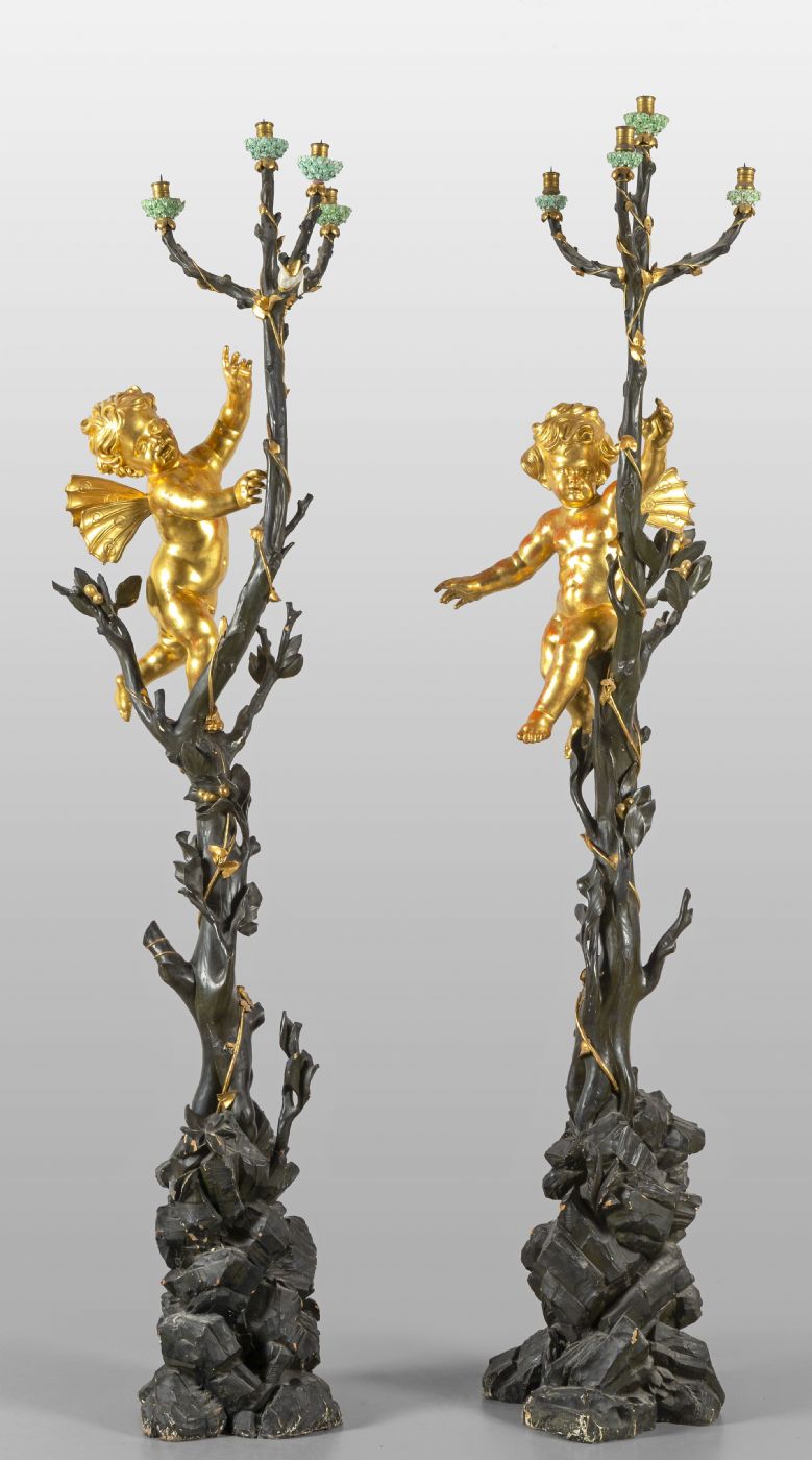 The carved bases depict stylized rocks, lacquered in faux burnished bronze, from which tree trunks with branches and some leaves arise. One of the branches ends with a further ramification into four arms culminating in glazed porcelain bobeches and gilded bronze candle holders. A gilded wood-carved ivy branch wraps around the entire trunk of the tree, illuminating and embellishing the ensemble. Two delightful winged putti, in gilded wood and different in posture, climb delicately.