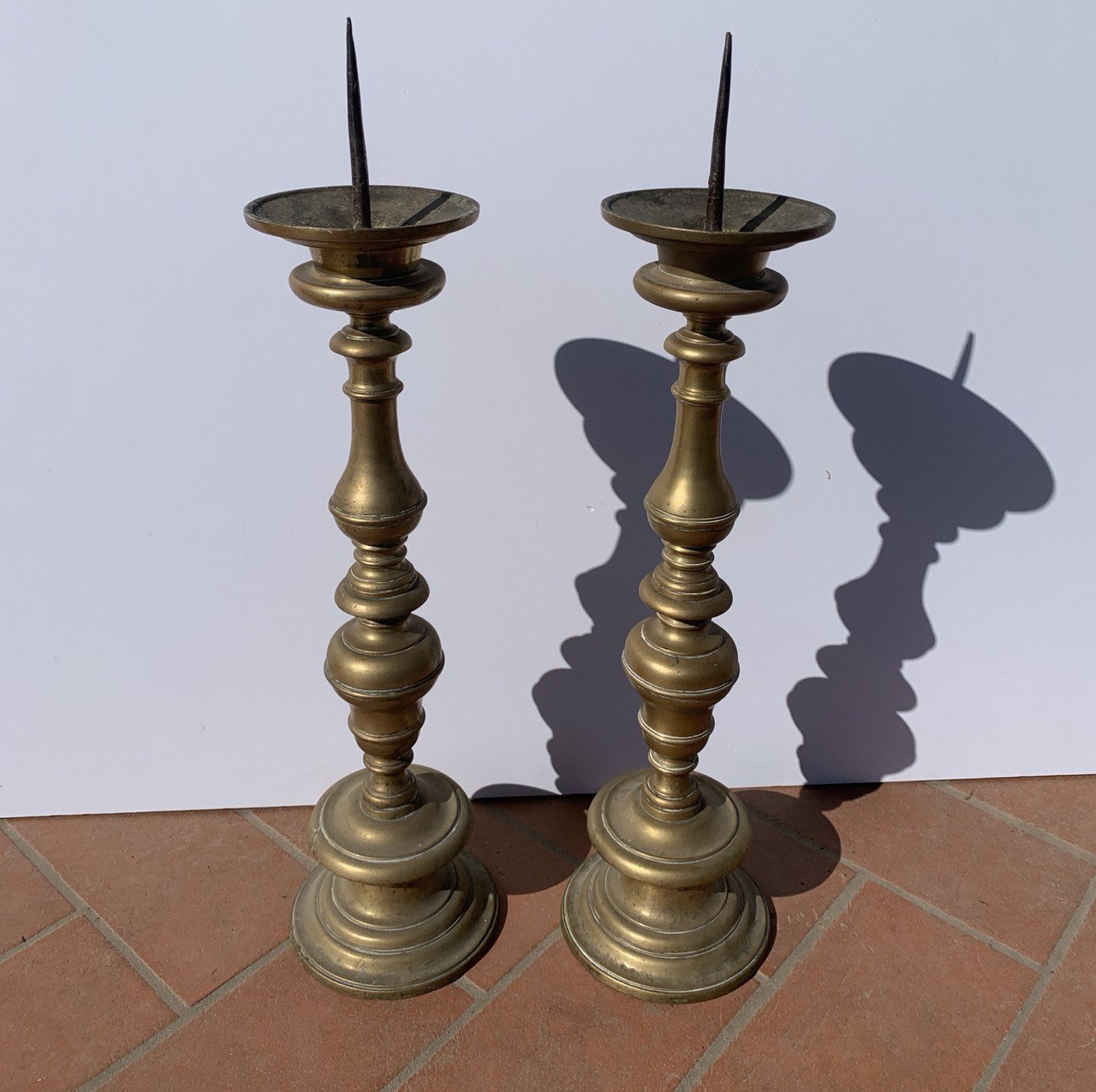 Pair of gilded bronze ecclesiastical candlesticks. Italy, 17th century.