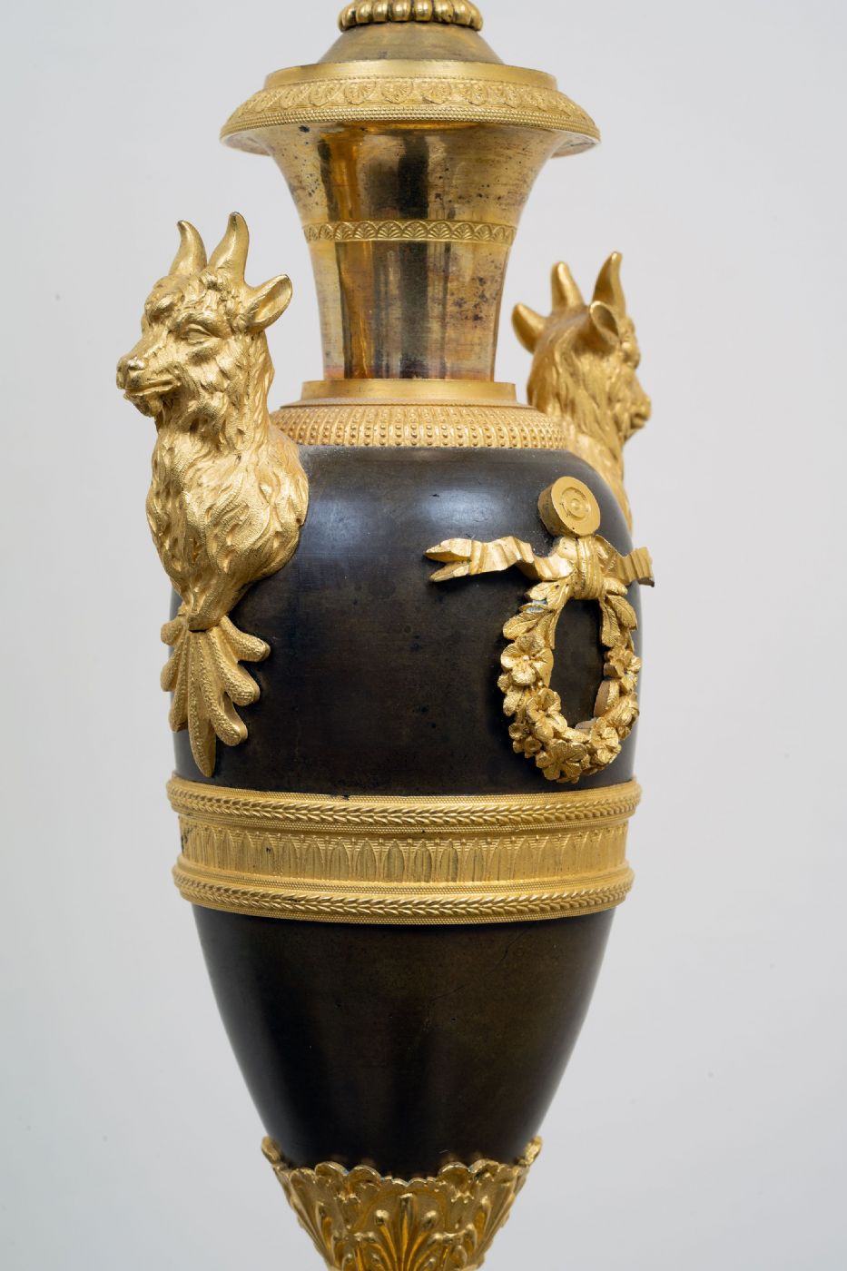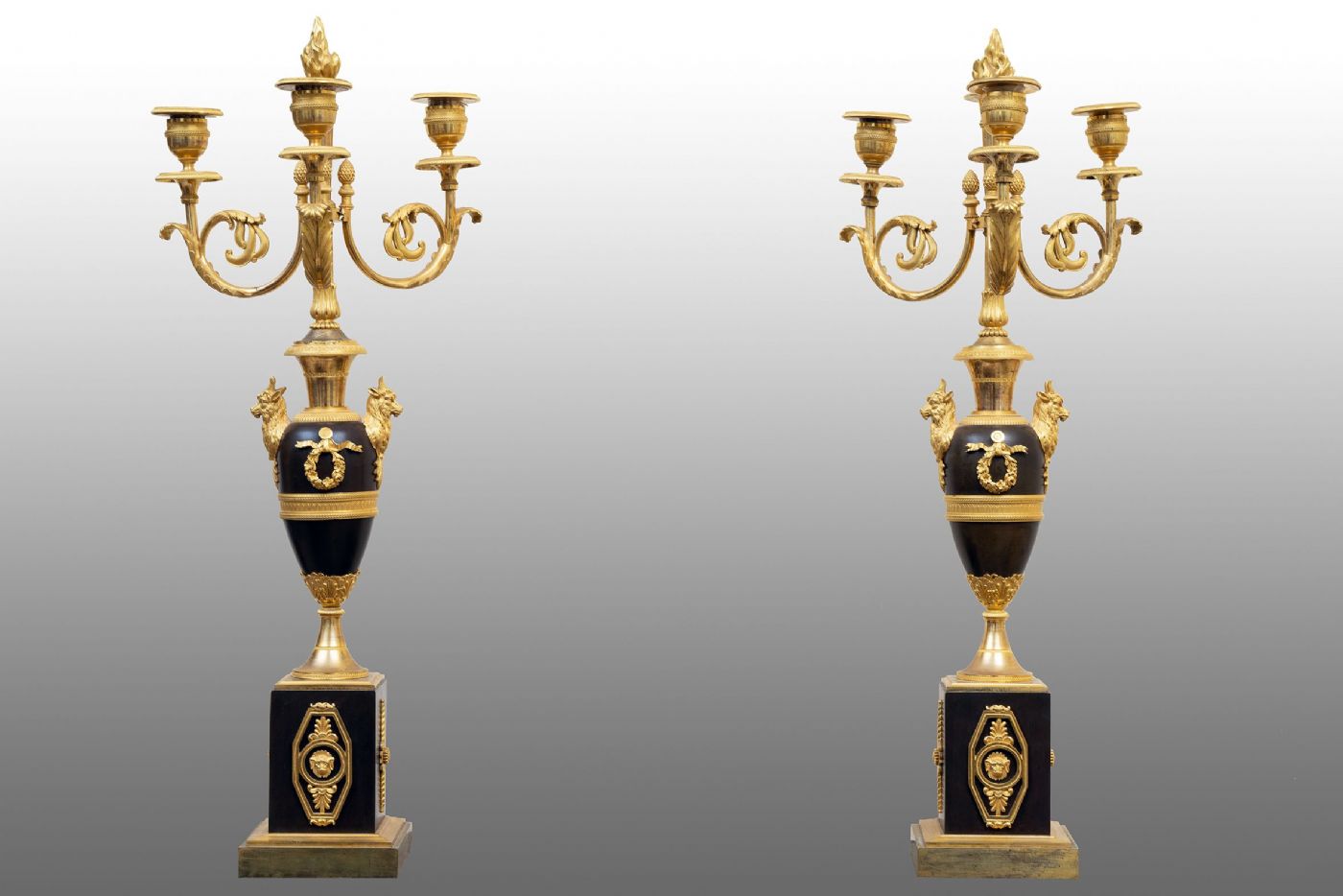 PAIR OF FOUR-LIGHT CANDELABRA FINELY CHISELED IN PATINATED AND GILT BRONZE. THE CENTRAL PART IN THE SHAPE OF A VASE RESTING ON A SQUARE BASE.