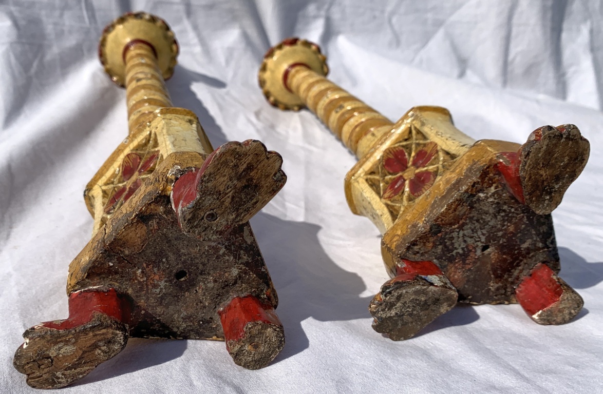 Pair of lacquered and painted wooden candlesticks. Venice, 18th/19th century. 10 x 9 x h 39 cm. Made entirely of carved, lacquered and painted wood. Red Louis XIV-style decorations on a yellow background and bestial feet. - All shipments to the EU are free and professionally packaged. - Each item is sold with a certificate of authenticity with legal validity. - Further information on the condition report is available upon request. - Viezzi Arte guarantees quality and professionalism at competitive prices, contact us at info@viezziarte.it or via WhatsApp at +39 3402841279. *Message to non-Italian buyers: Please note that this work has not yet obtained the free export certificate from Italy from the Superintendency of Cultural Heritage. This document certifies that the work is not part of Italian cultural heritage. Normally, the release times for the certificates are 40 days from the date of the appointment: The new legislation in force from 2021 provides, for amounts declared less than €13,500, shorter times at the discretion of the expert commission. All costs for this operation are included.