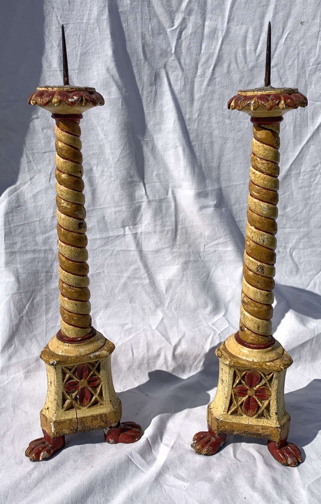 Pair of lacquered and painted wooden candlesticks. Venice, 18th/19th century. 10 x 9 x h 39 cm. Made entirely of carved, lacquered and painted wood. Red Louis XIV-style decorations on a yellow background and bestial feet. - All shipments to the EU are free and professionally packaged....