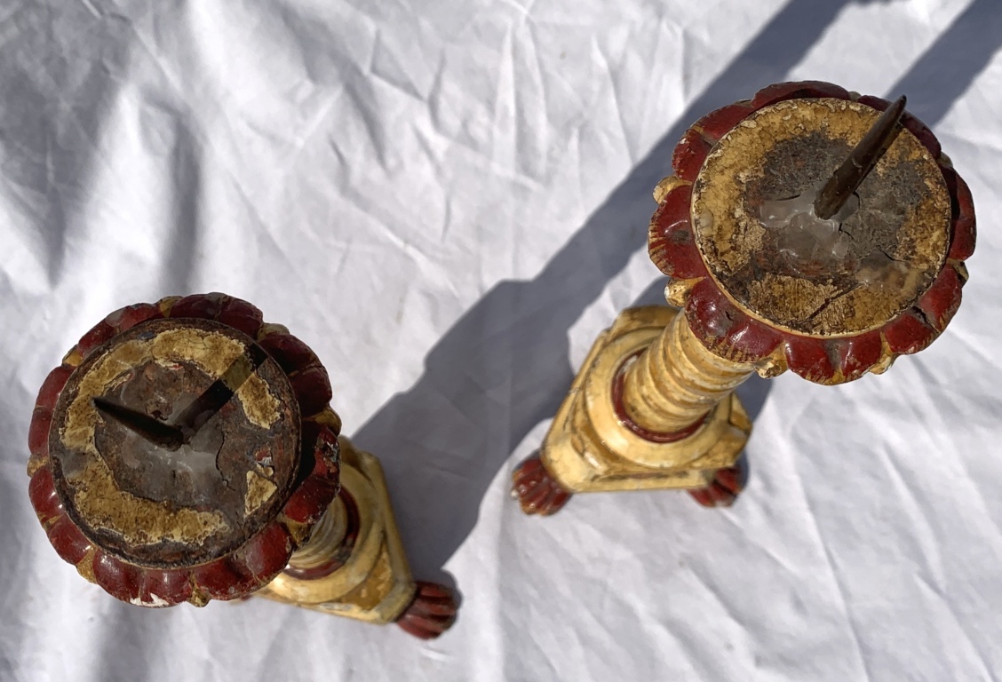 Pair of lacquered and painted wooden candlesticks. Venice, 18th/19th century.