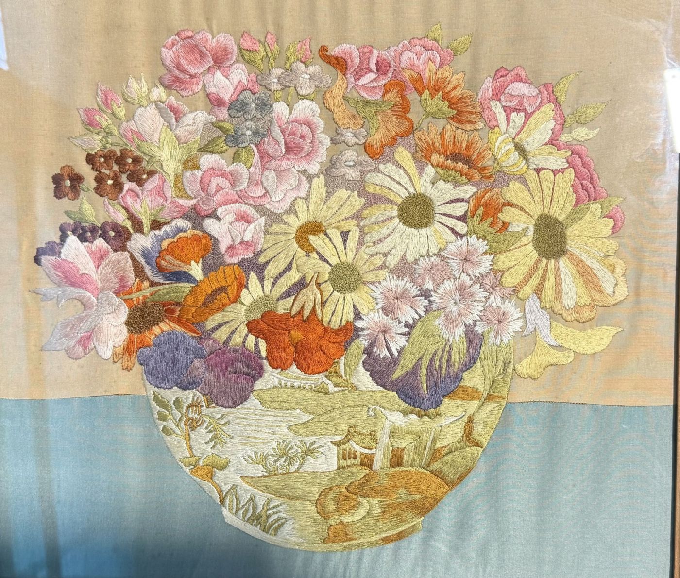 Framed panel with vase of flowers embroidered on fabric. Cm 46x42.