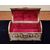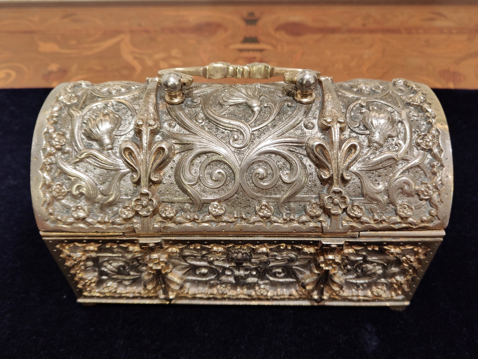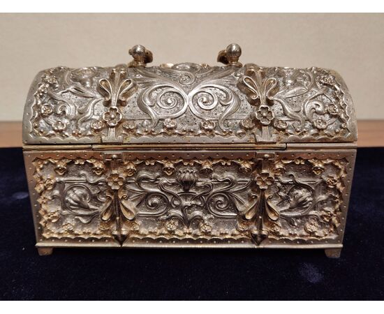 Bauletto in bronzo e ottone dorato e argentato con decori in stile liberty a soggetto floreale cesellati a sbalzo, coperchio ad arco con maniglia, interno rivestito in velluto rosso, sul fondo riporta logo aziendale