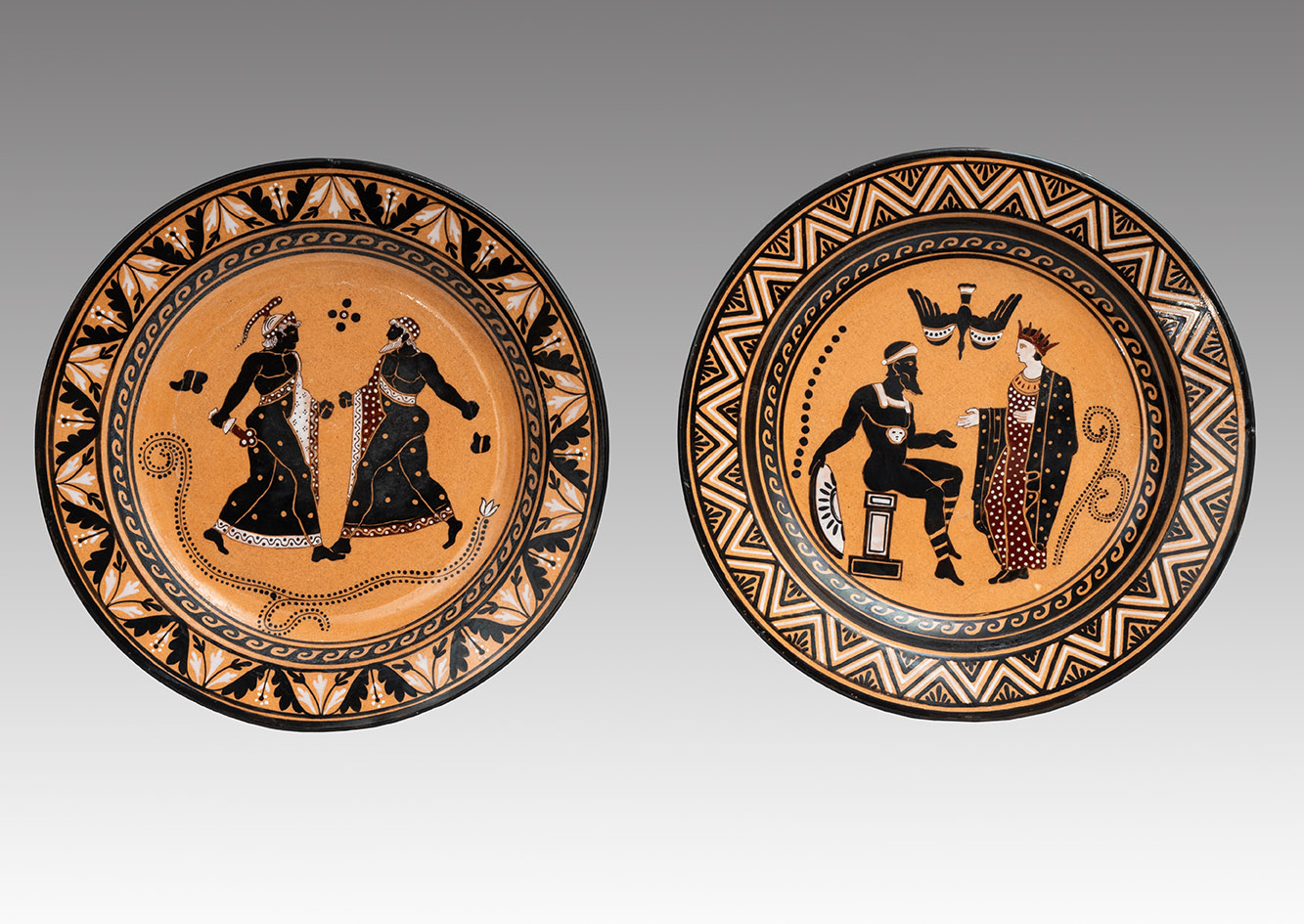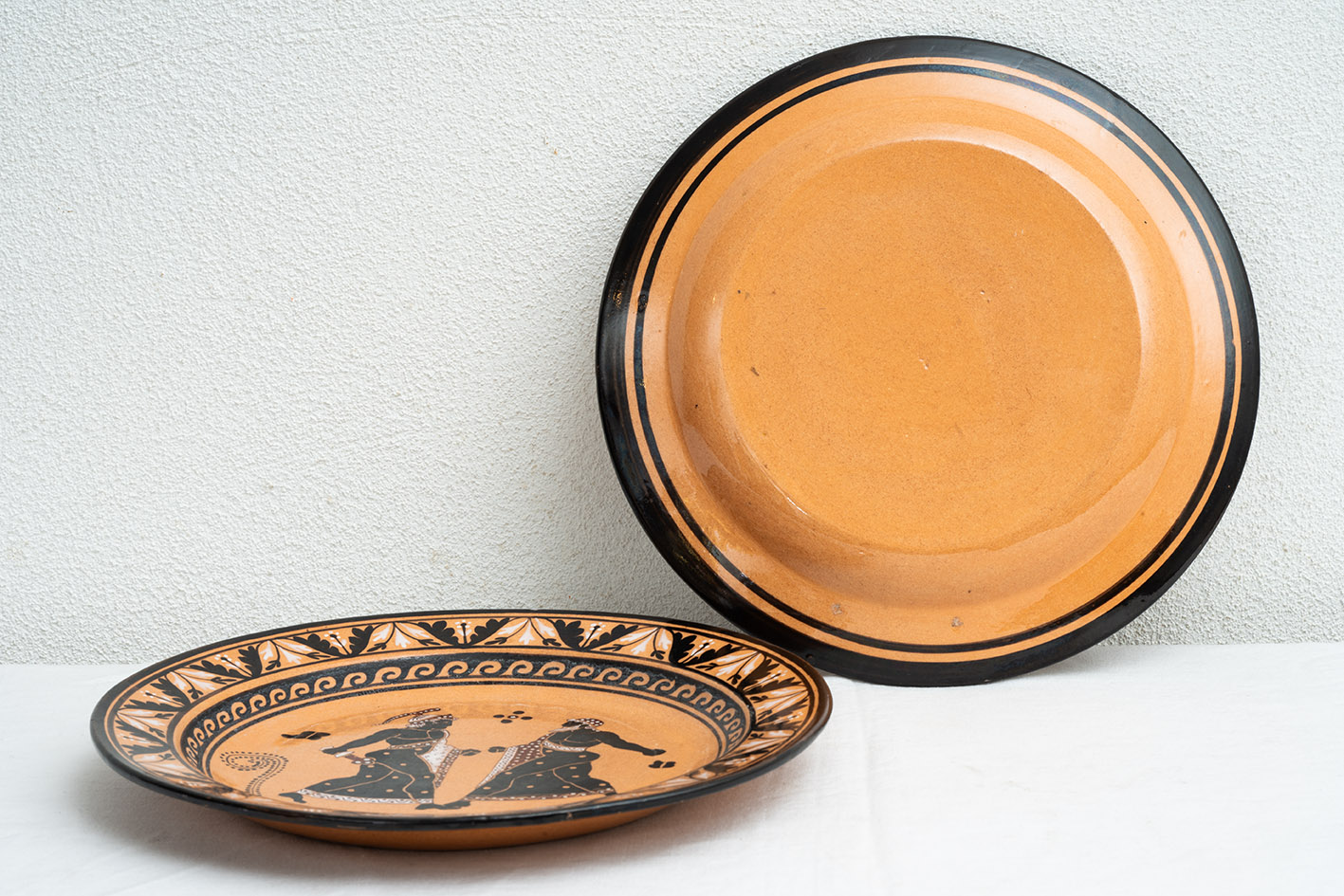 Descrizione: Coppia di piatti antichi in terraglia policroma firmati "Giustiniani" appartenente agli inizi del XIX secolo. Il piatto presenta figure nere su fondo color terracotta e decorazioni aggiuntive in bianco e porpora che imitano lo stile della pittura vascolare greca a figure nere. La...