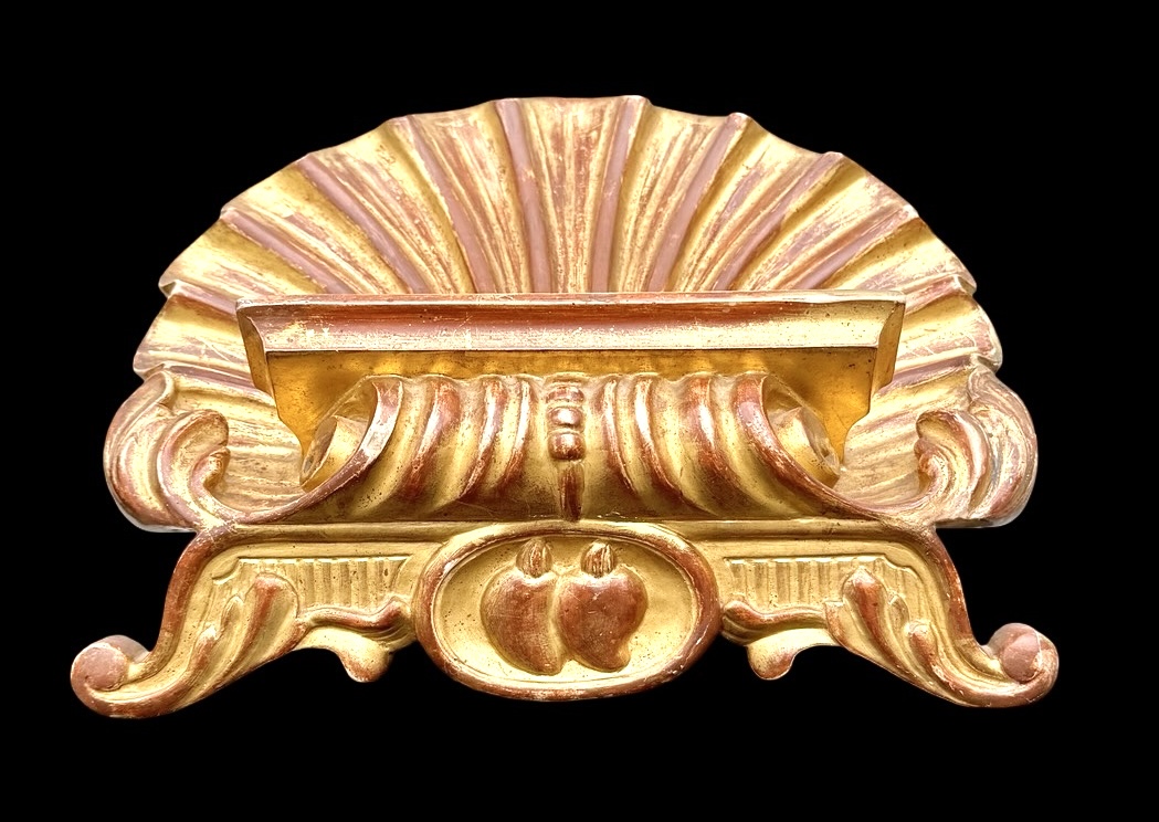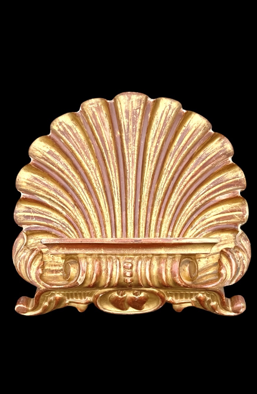 Lectern - book holder in carved wood and gold leaf in the shape of a shell with rocaille motifs. Directoire period. Cm 34x26x22.