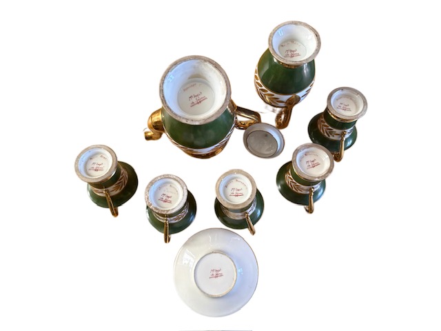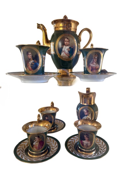 Servizio da caffè in porcellana di Sèvres composto da sette pezzi a fondo verde scuro e decorato in oro con miniature raffiguranti Napoleone Bonaparte e la sua famiglia.