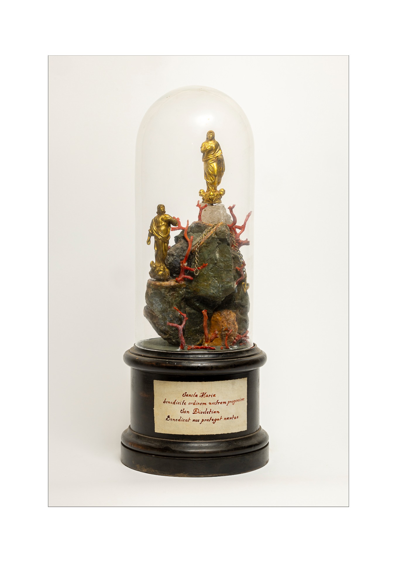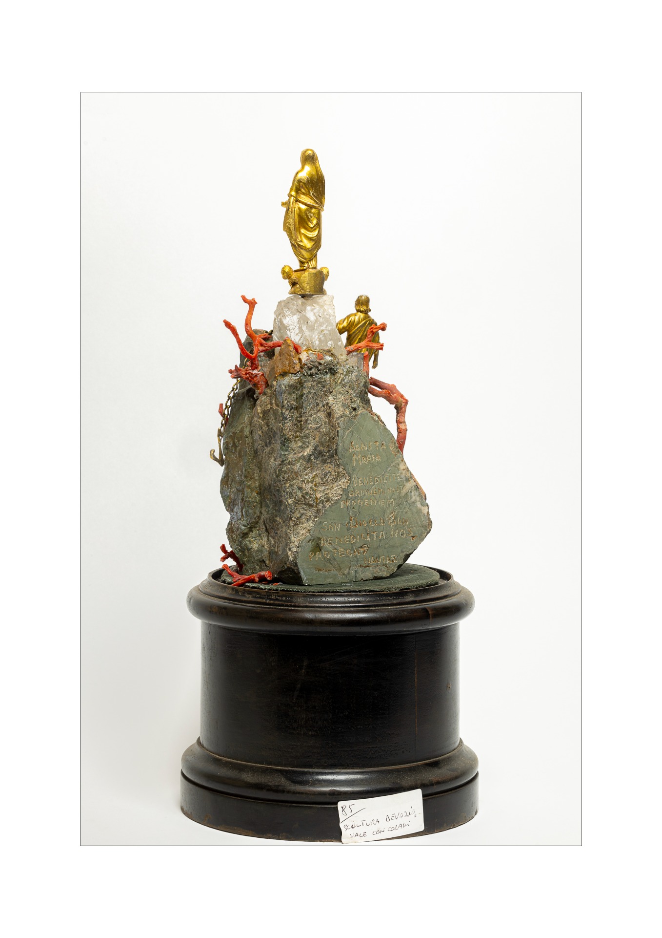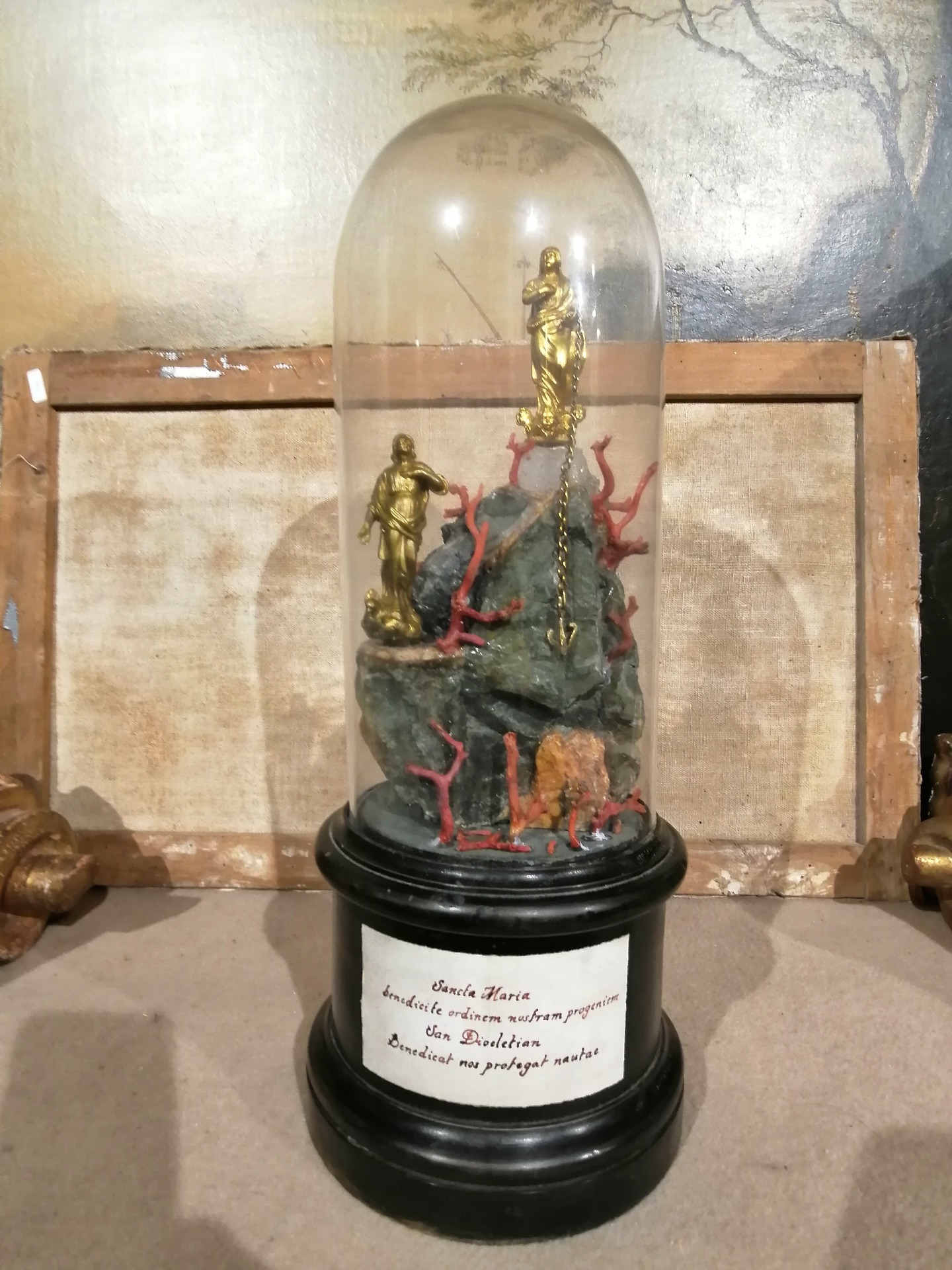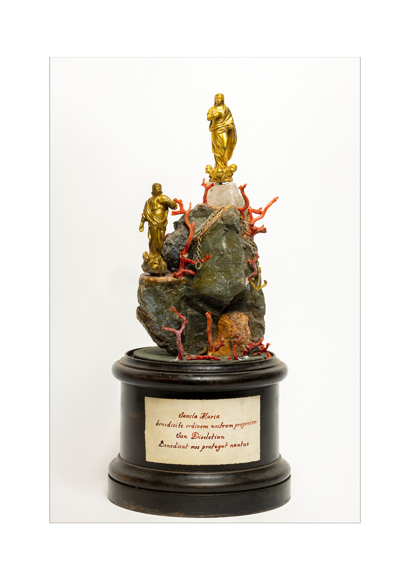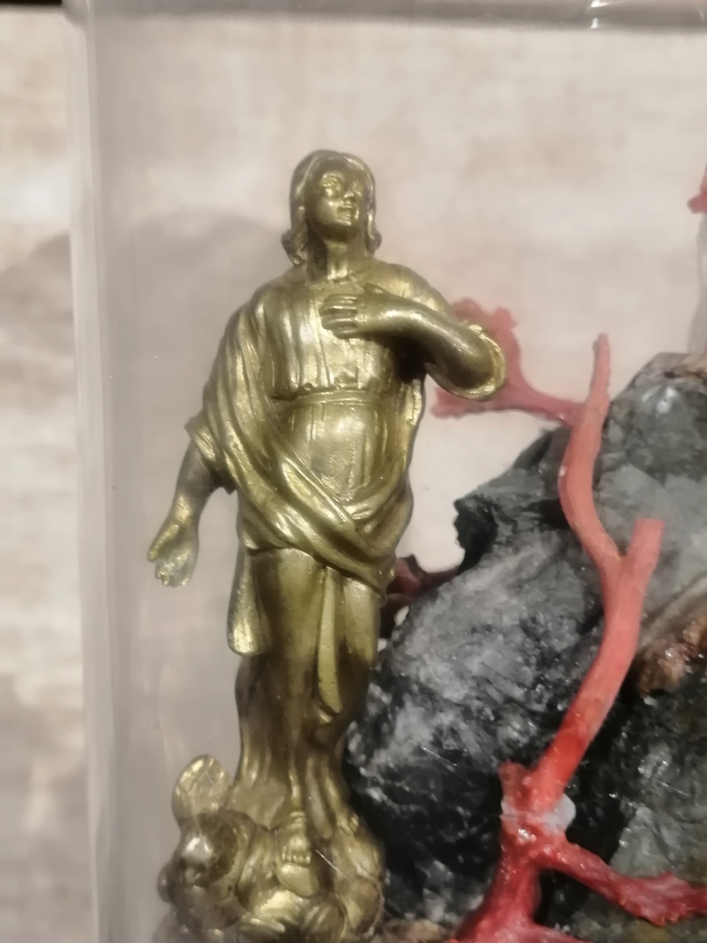 Theca with ex voto composition in stone with corals - Virgin and Saint Diocletian - Metal, Stone, Glass