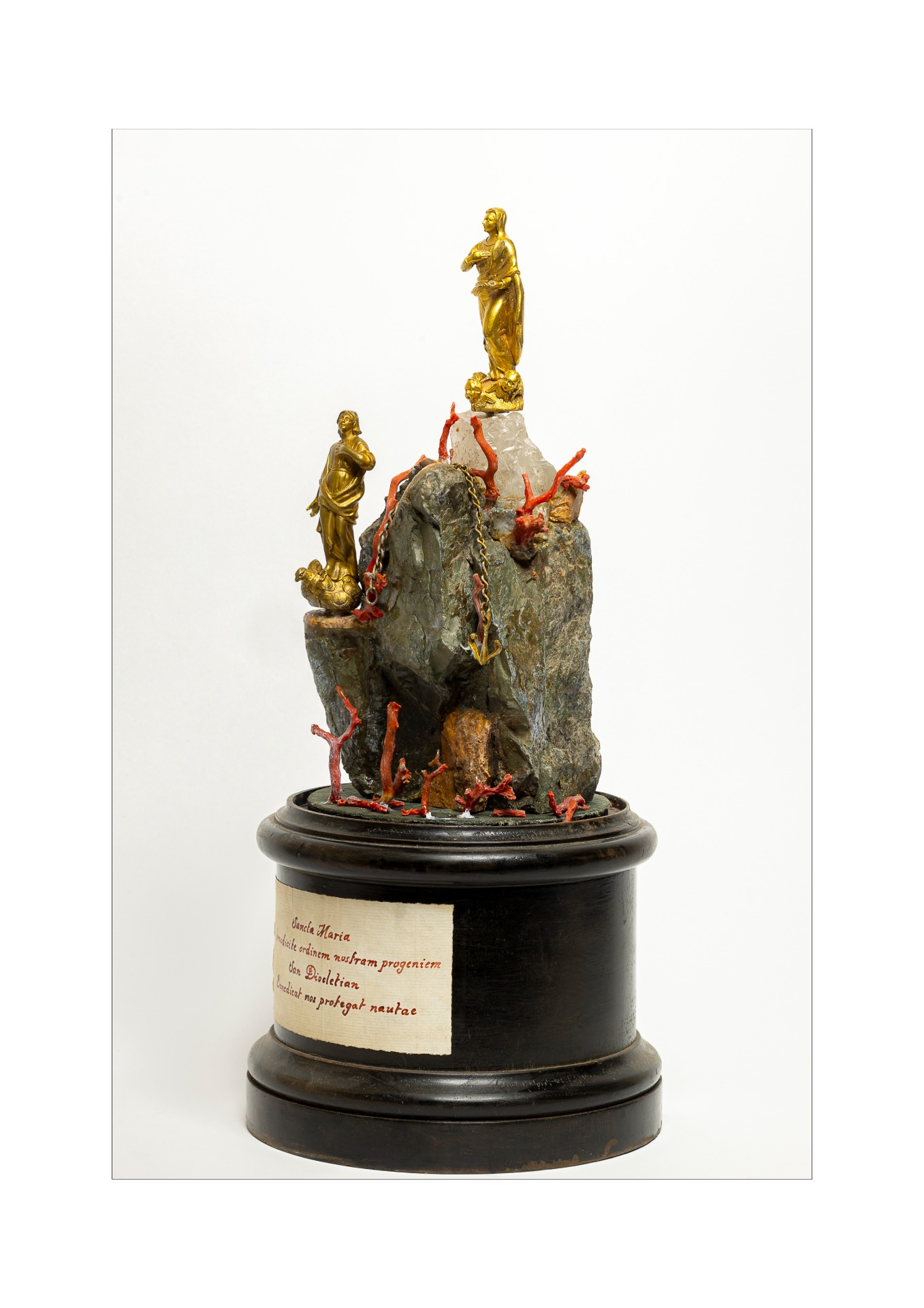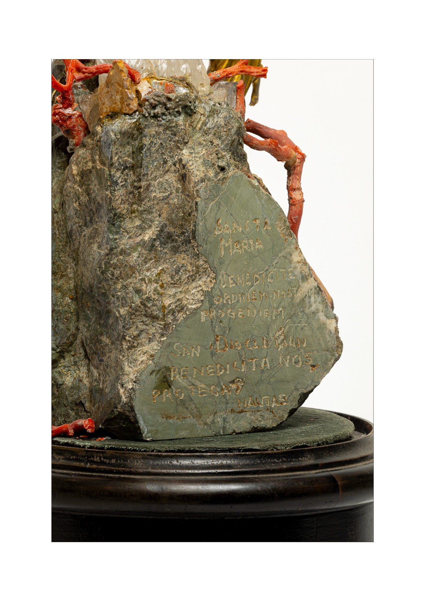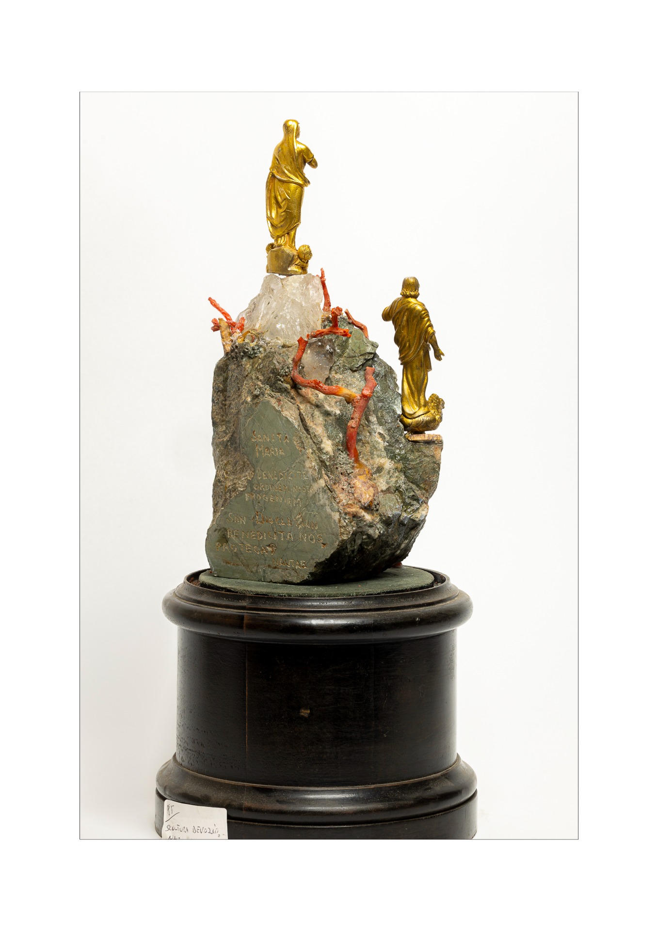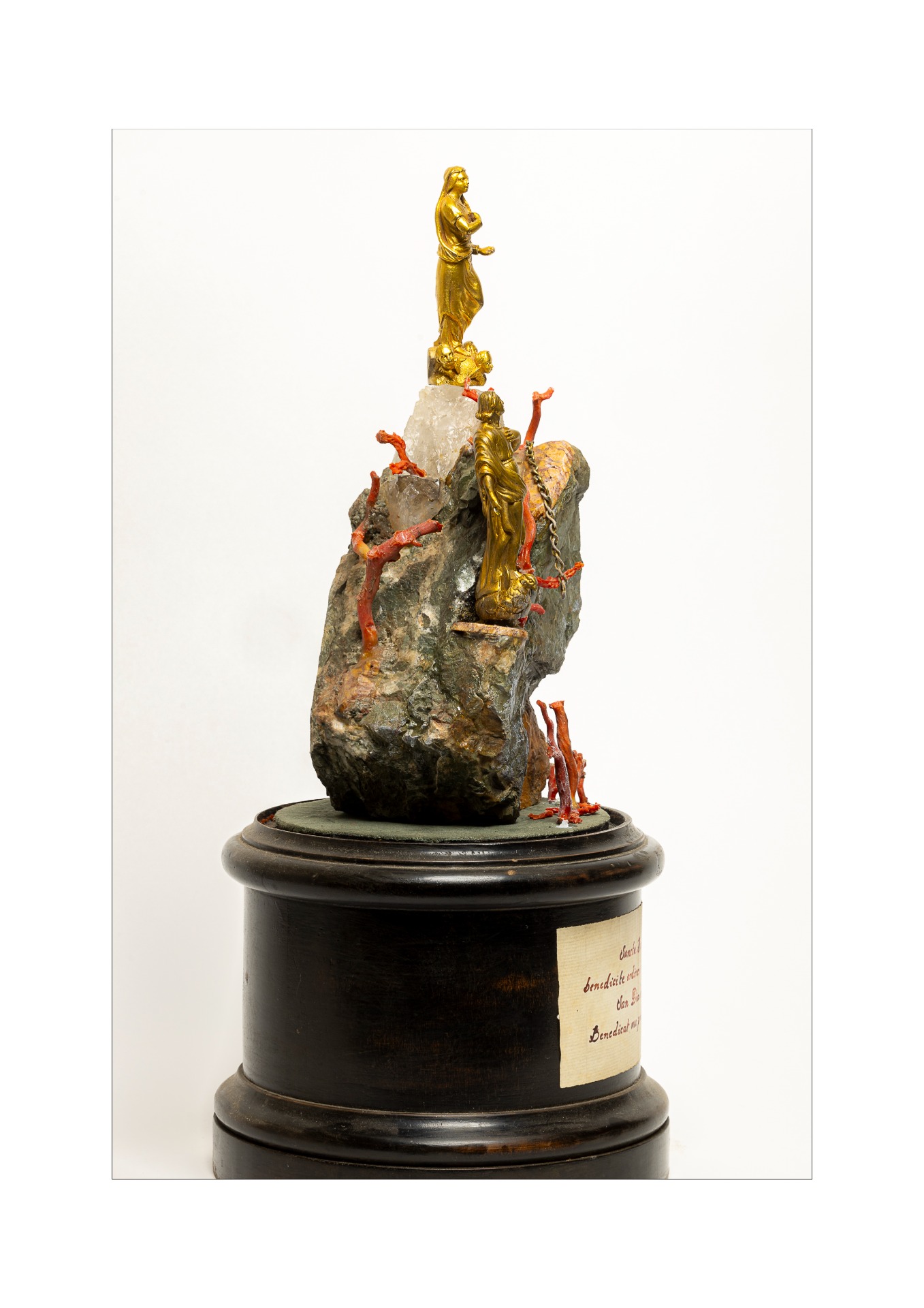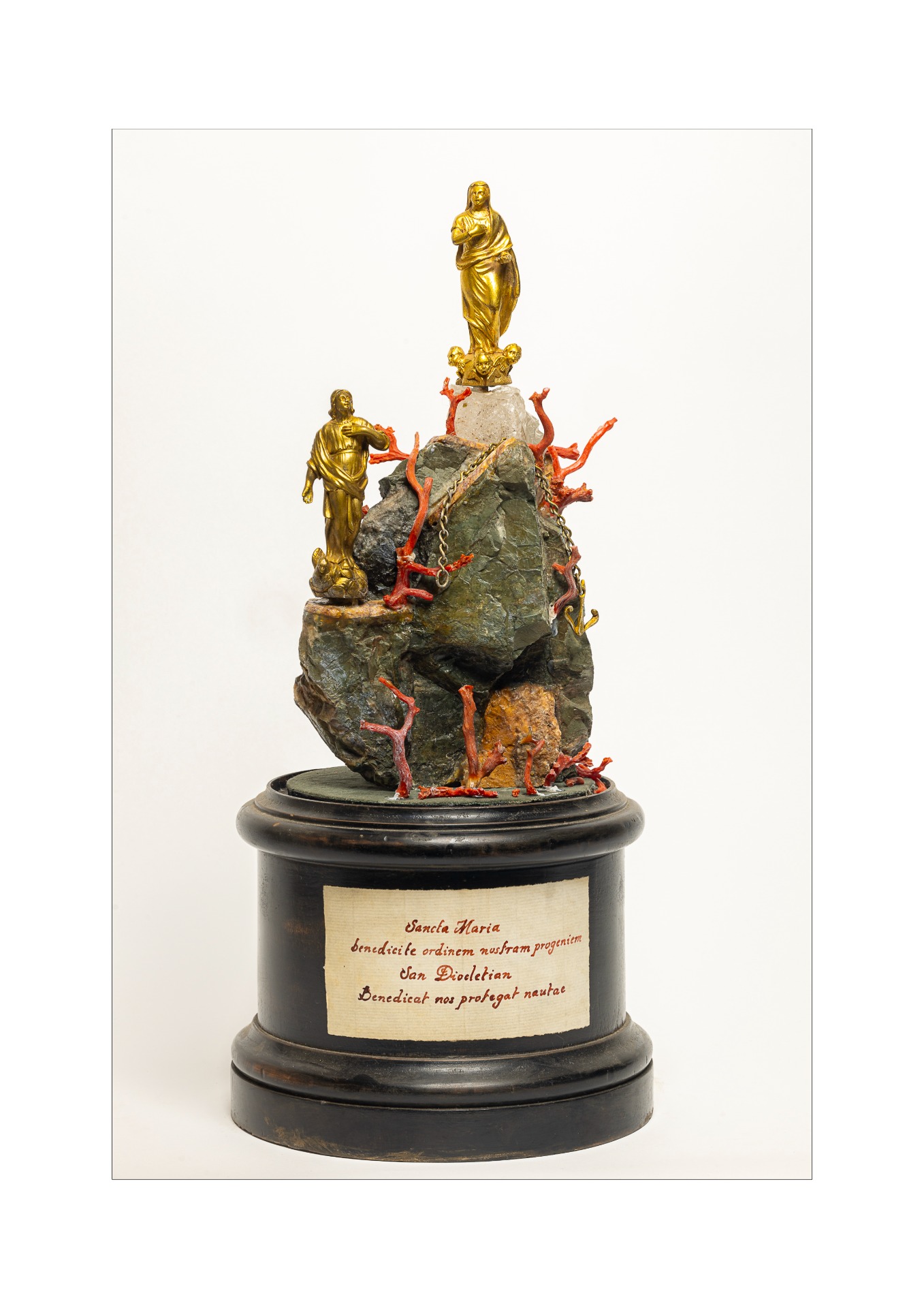 Theca with ex voto composition in stone with corals - Virgin and Saint Diocletian - Metal, Stone, Glass