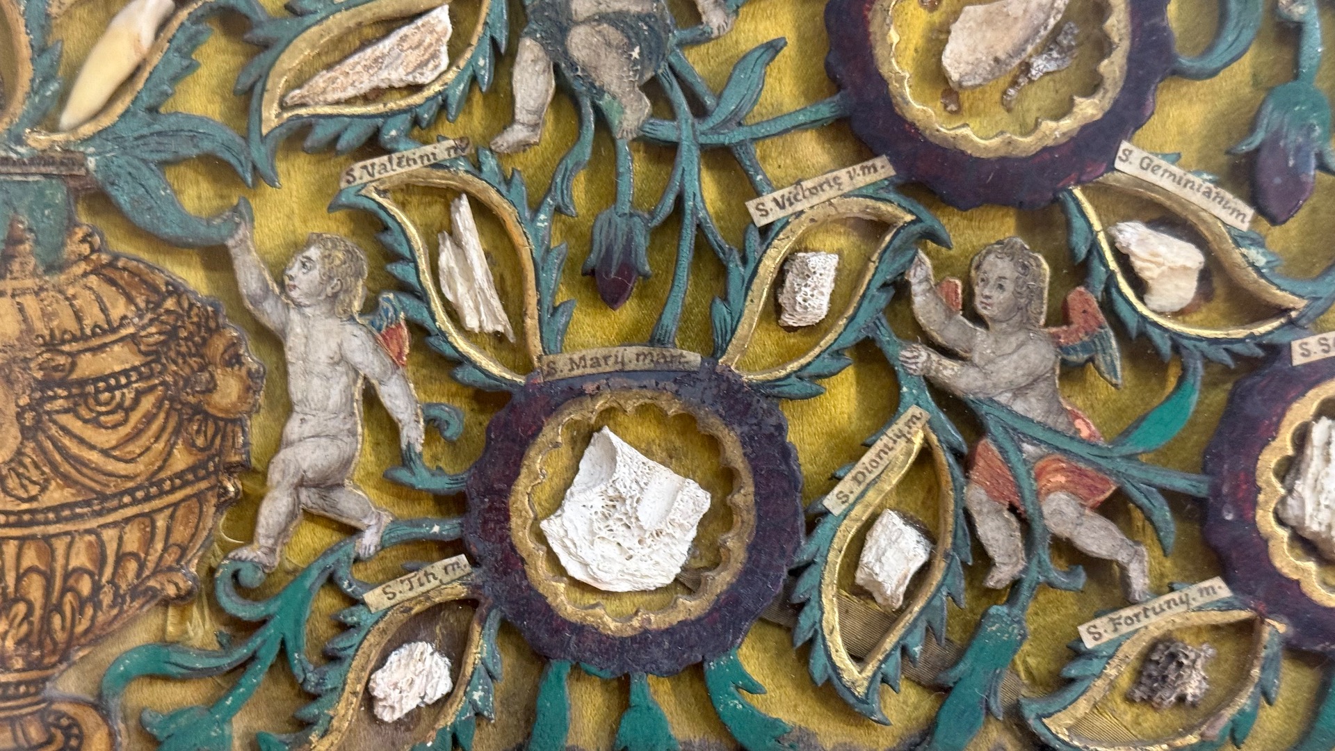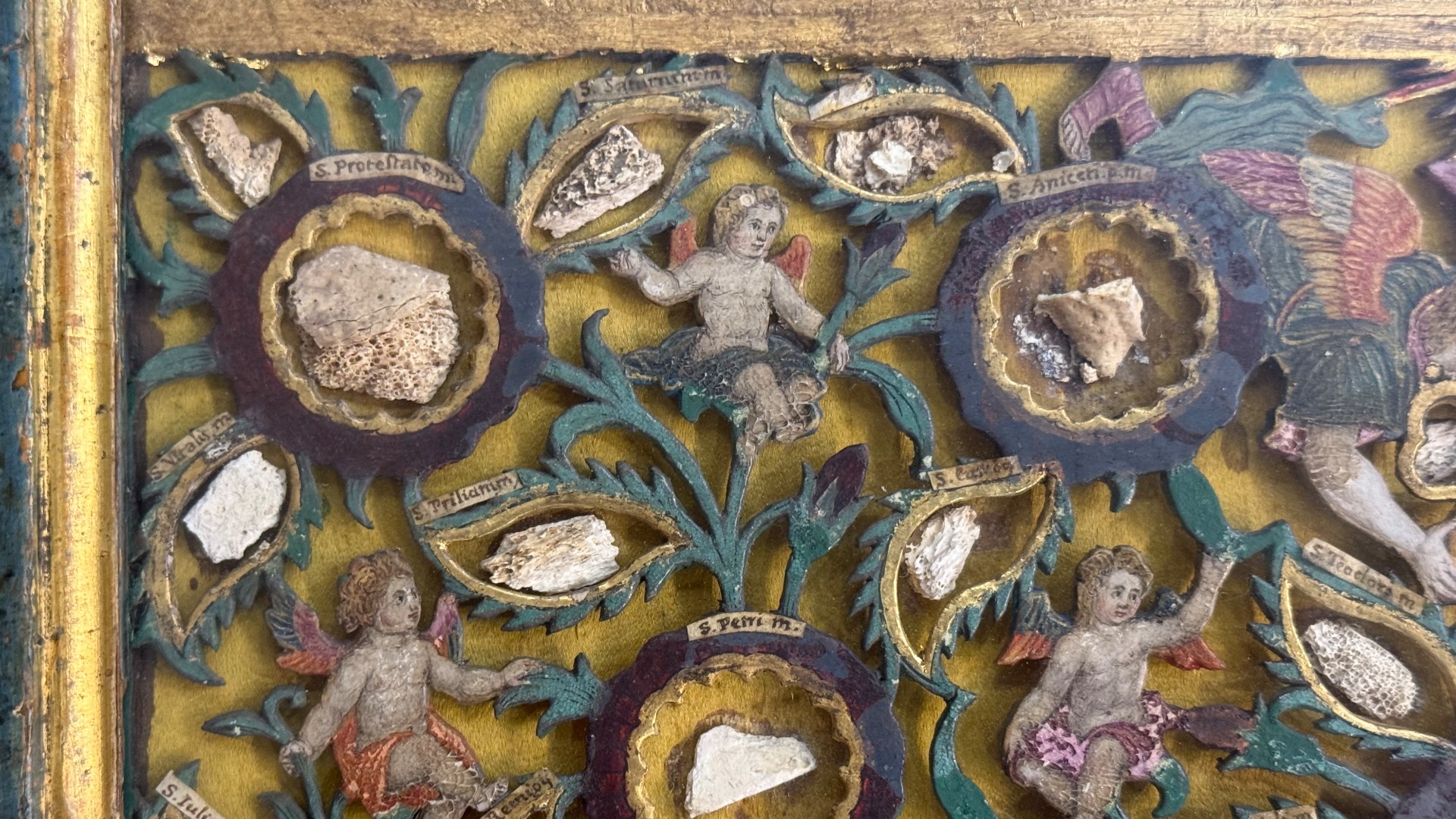 Reliquary painting with openwork wood composition in relief with putti and vegetal motifs.