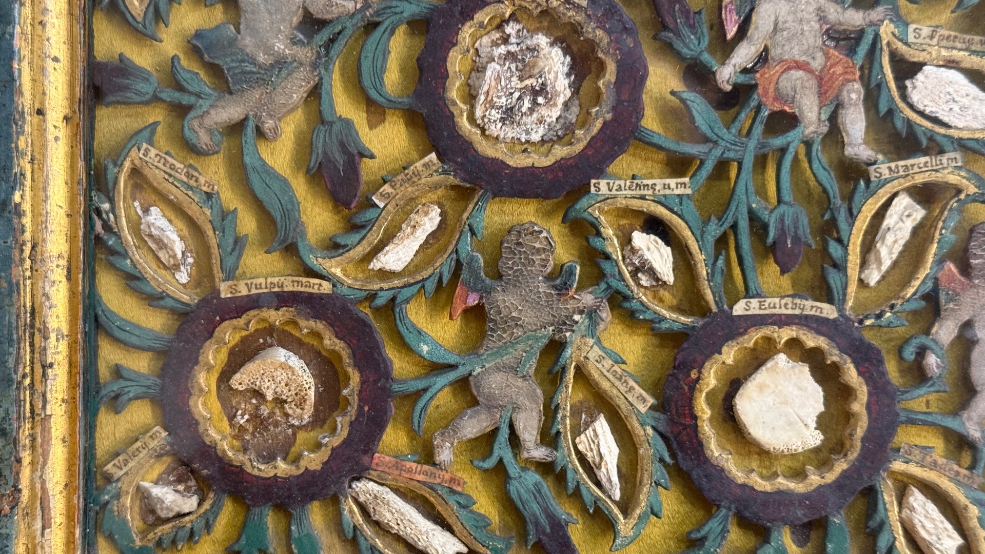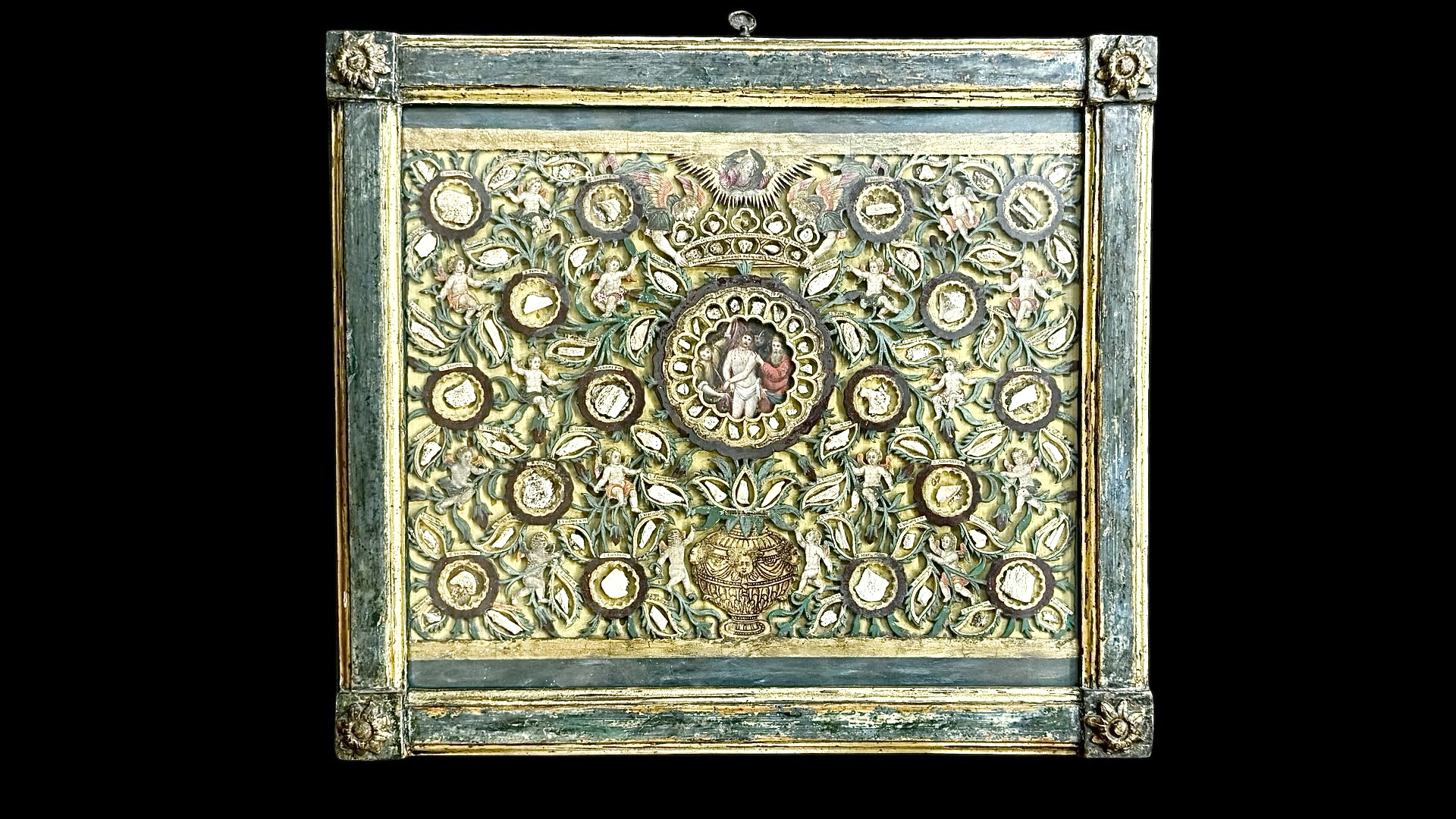 Reliquary painting with openwork wood composition in relief with putti and vegetal motifs.