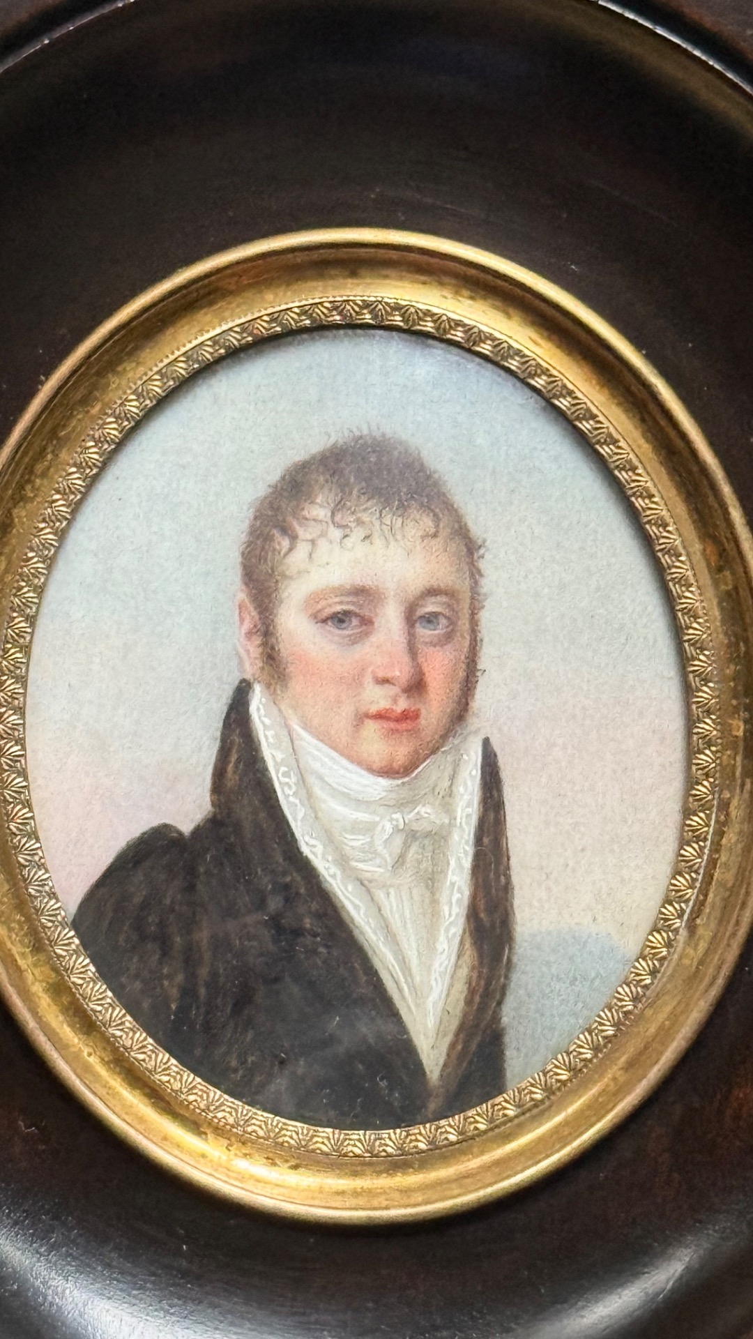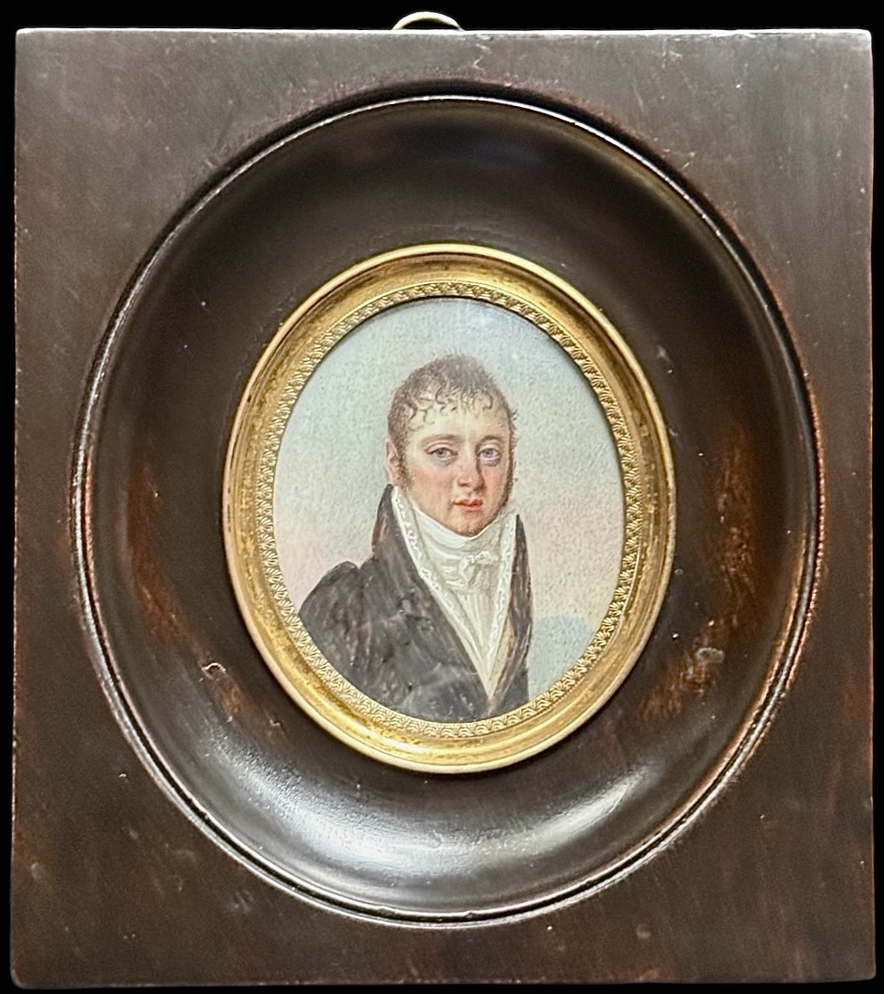 Ivory miniature depicting a male figure. Frame dimensions: 11.5x10.5 cm. Oval: 6.5x5.5 cm.