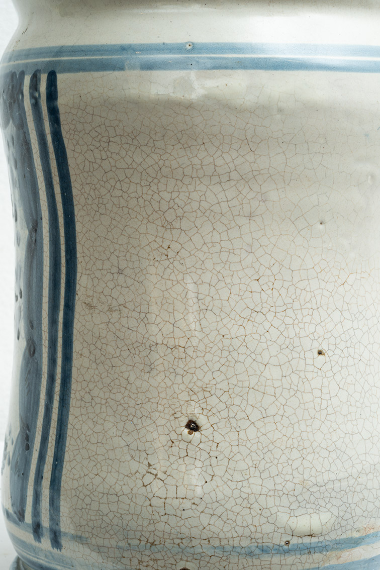 Descrizione: Albarello/Vaso antico in maiolica policroma smaltata di provenienza napoletana appartenente alla metà del XVIII secolo. Il vaso di grande dimensione ha una forma cilindrica rastremata al centro ed è decorato in monocromia blu cobalto tipico della tradizione napoletana....