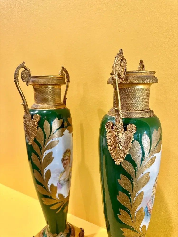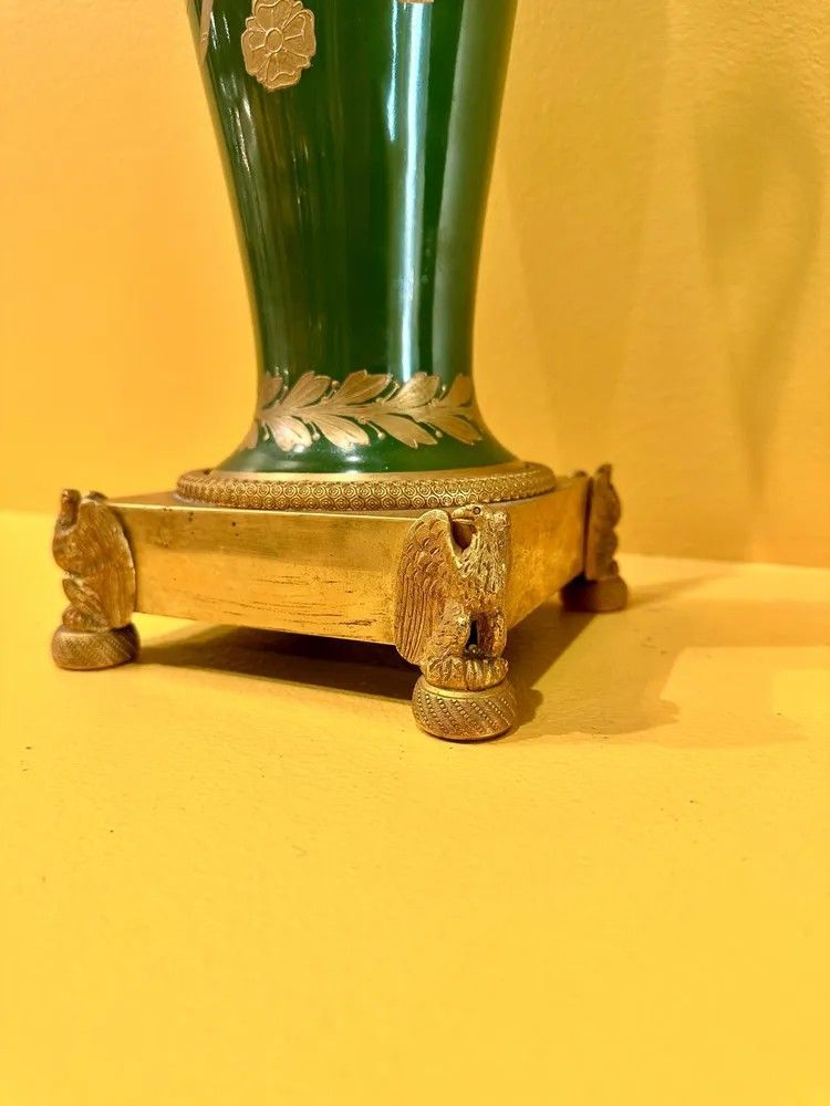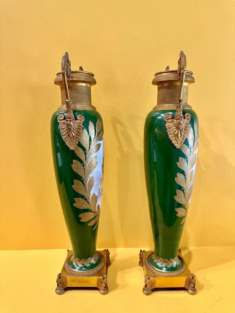 Coppia di vasi Direttorio in porcellana verde e bronzo dorato