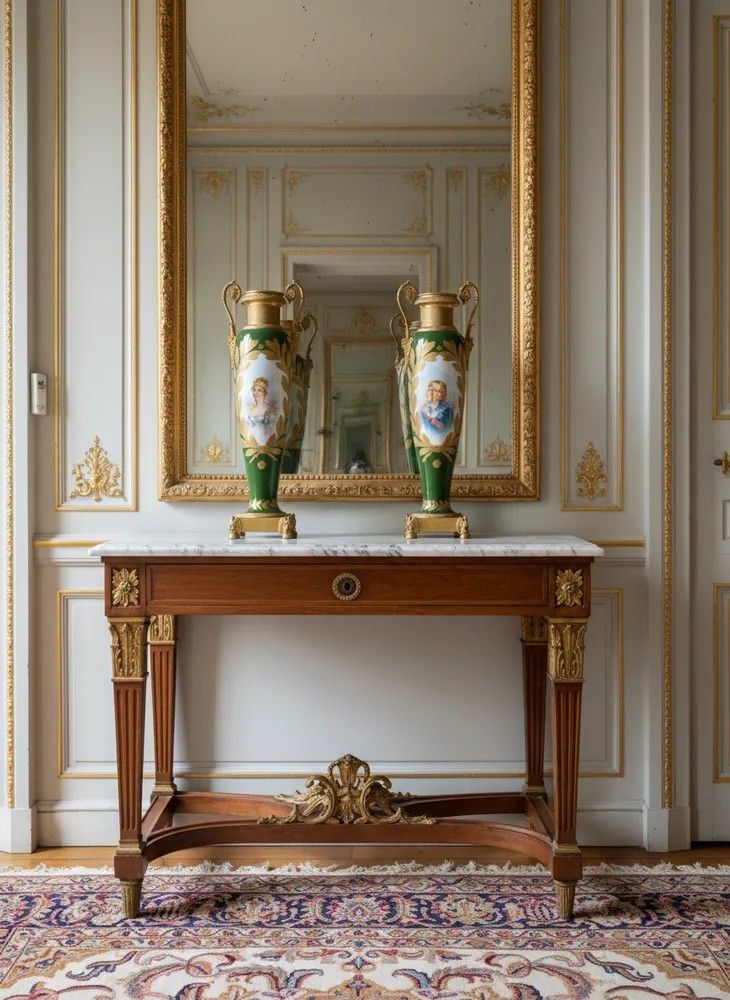 Questa preziosa coppia di vasi Direttorio testimonia l’altissima qualità raggiunta dalle manifatture parigine alla fine del XVIII secolo, nel passaggio dal gusto Luigi XVI al nascente Stile Impero. I corpi, in porcellana dura francese, presentano un intenso fondo verde "vert Empire" sul quale spiccano ampie riserve ovali con ritratti femminili a smalti policromi di raffinata fattura: le acconciature alla greca e i drappeggi all’antica rimandano all’ideale di virtù repubblicana tipico dell’epoca.Le riserve sono incorniciate da ghirlande di alloro dorato culminanti nella stella a cinque punte, emblema del potere consolare. Il collo è avvolto da una fascia in bronzo dorato a mercurio con fitti motivi guilloché, mentre le anse a voluta terminano in una rosetta e si innestano sul vaso tramite mascheroni bacchici – probabile allusione a Pan – finemente cesellati.Porcellana smaltata, manifattura francese, c. 1795-1800Montature in bronzo dorato, tecnica amati & bruniDecoro a foglie di alloro, stella consolare e piccoli fiori a rilievoBasi quadrangolari in bronzo con aquile imperiali scolpite agli angoliPalette cromatica: verde bottiglia, oro zecchino, pastelli delicatiStato di conservazione eccellente; dorature originaliL’insieme esprime il rigore neoclassico del Direttorio unito alla solennità simbolica che prelude all’Impero napoleonico. Oggetti rari, ideali per arricchire saloni, console o biblioteche di gusto storico. La qualità delle montature suggerisce l’intervento di importanti bronzieri parigini quali Claude Galle o Pierre-Philippe Thomire, in dialogo con officine di porcellana come Sèvres o Darlot & Honoré. Un capolavoro di arti decorative francesi da collezione.Stile: Impero Materiale: PorcellanaAltezza (cm): 68Larghezza (cm): 21Profondità (cm): 15Epoca: XVIII Secolo - 1700