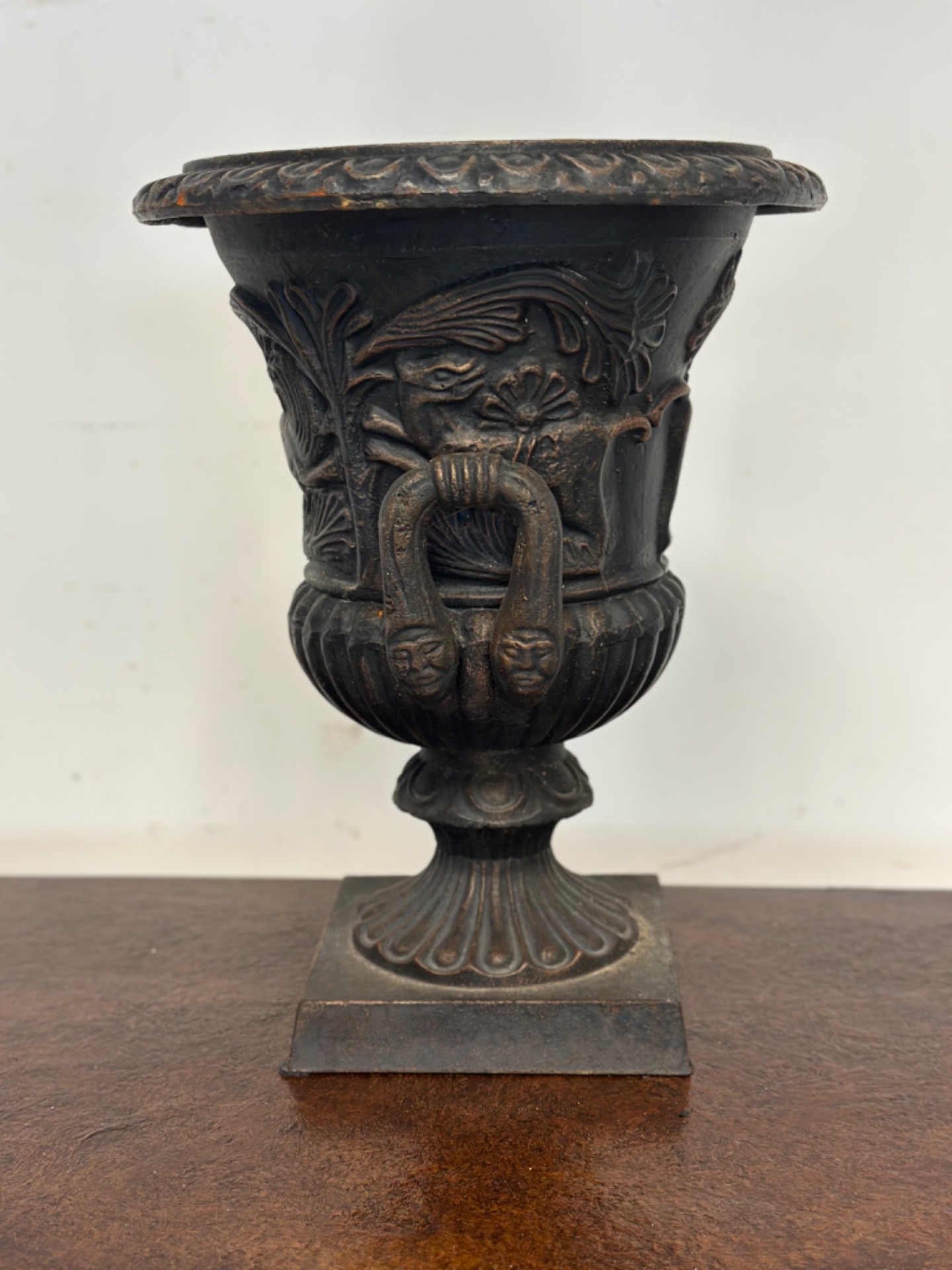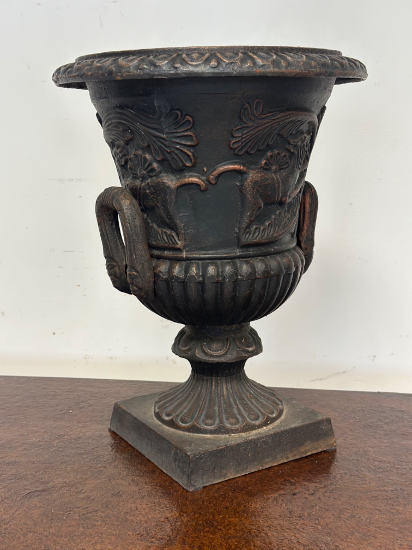 Cast iron Empire vase with lateral handles, ribbed bowl, late 1800s period.