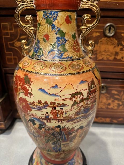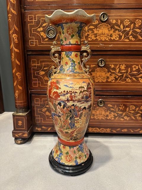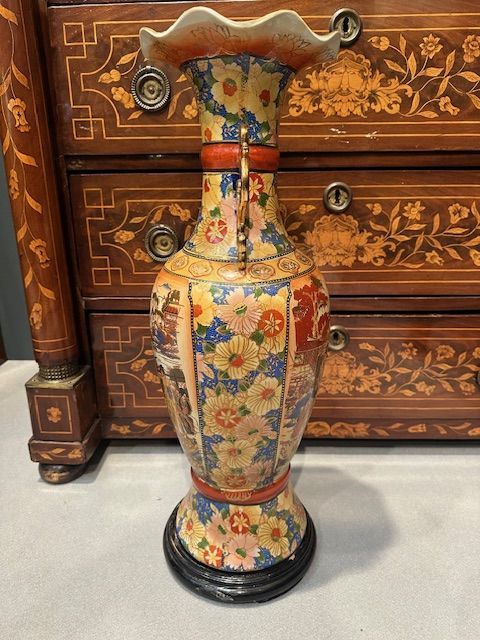 Porcelain vase painted and gilded in Satsuma style. Japan, known for its thick enamels with floral and various character decorations, resting on a circular ebonized wooden base.