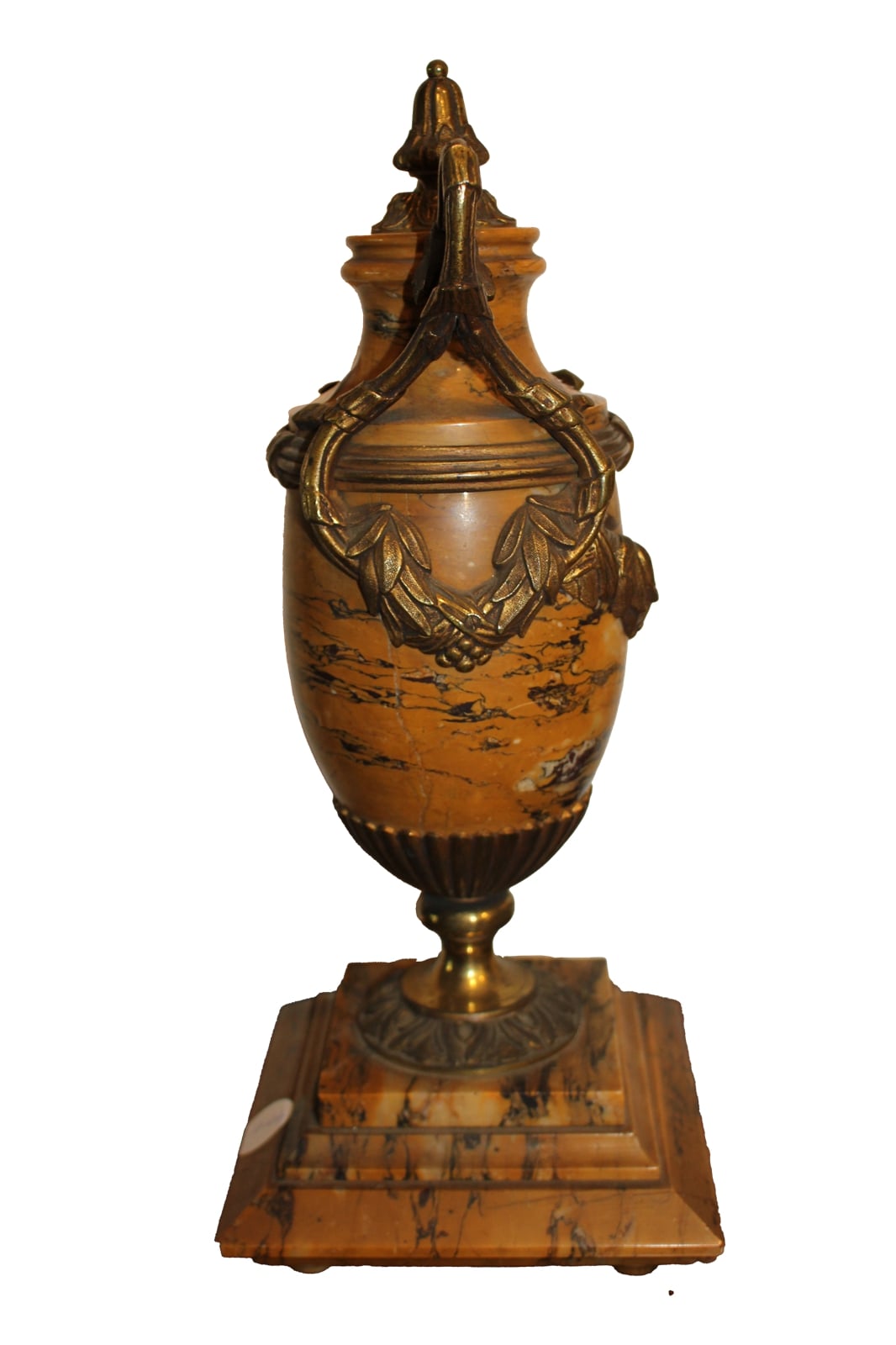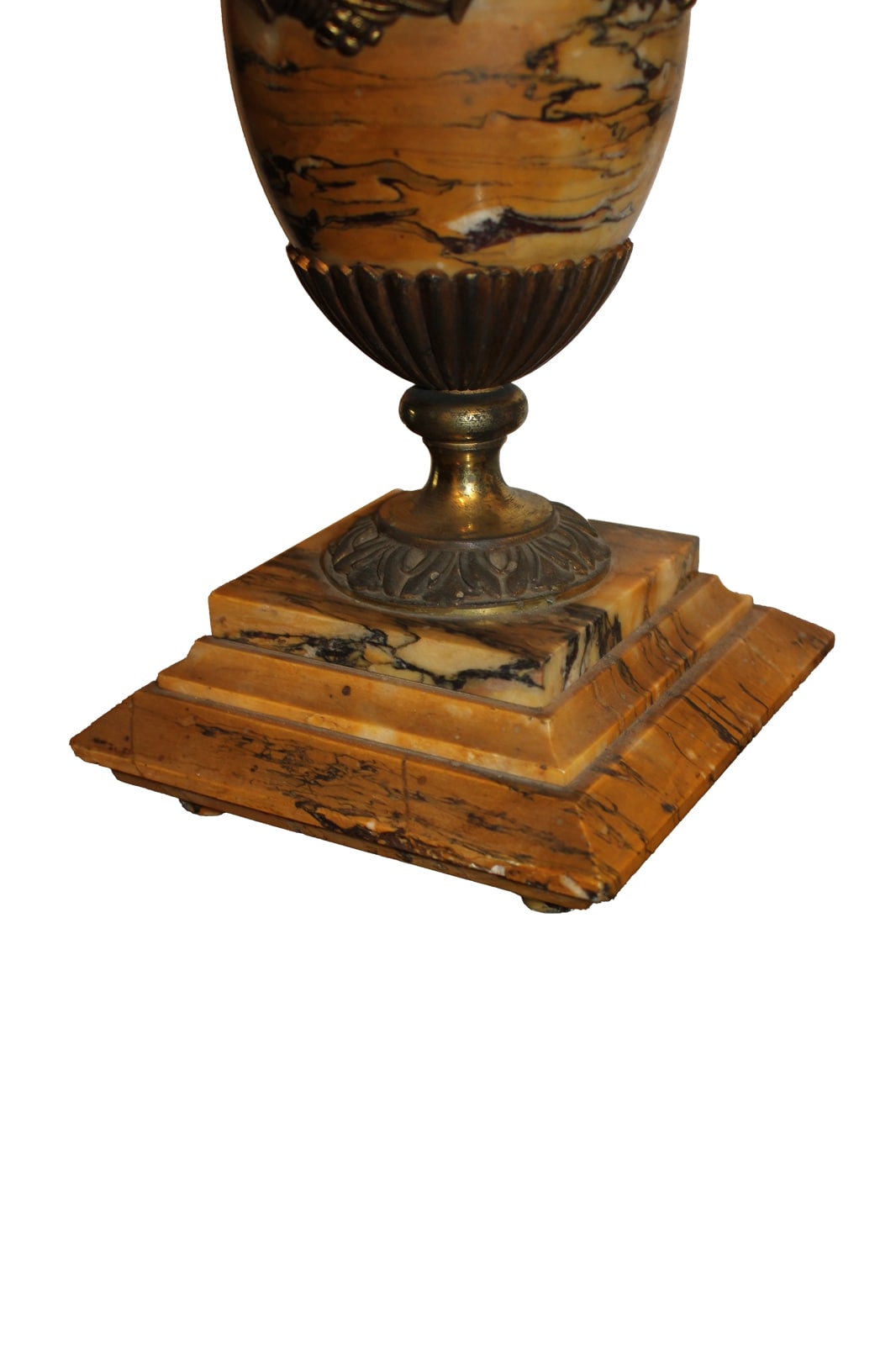 Pair of Empire style vases made of yellow Siena marble with rich gilded bronze applications from the late 19th century. Origin: France Period: late 19th century Dimensions: 17x17 h. 41