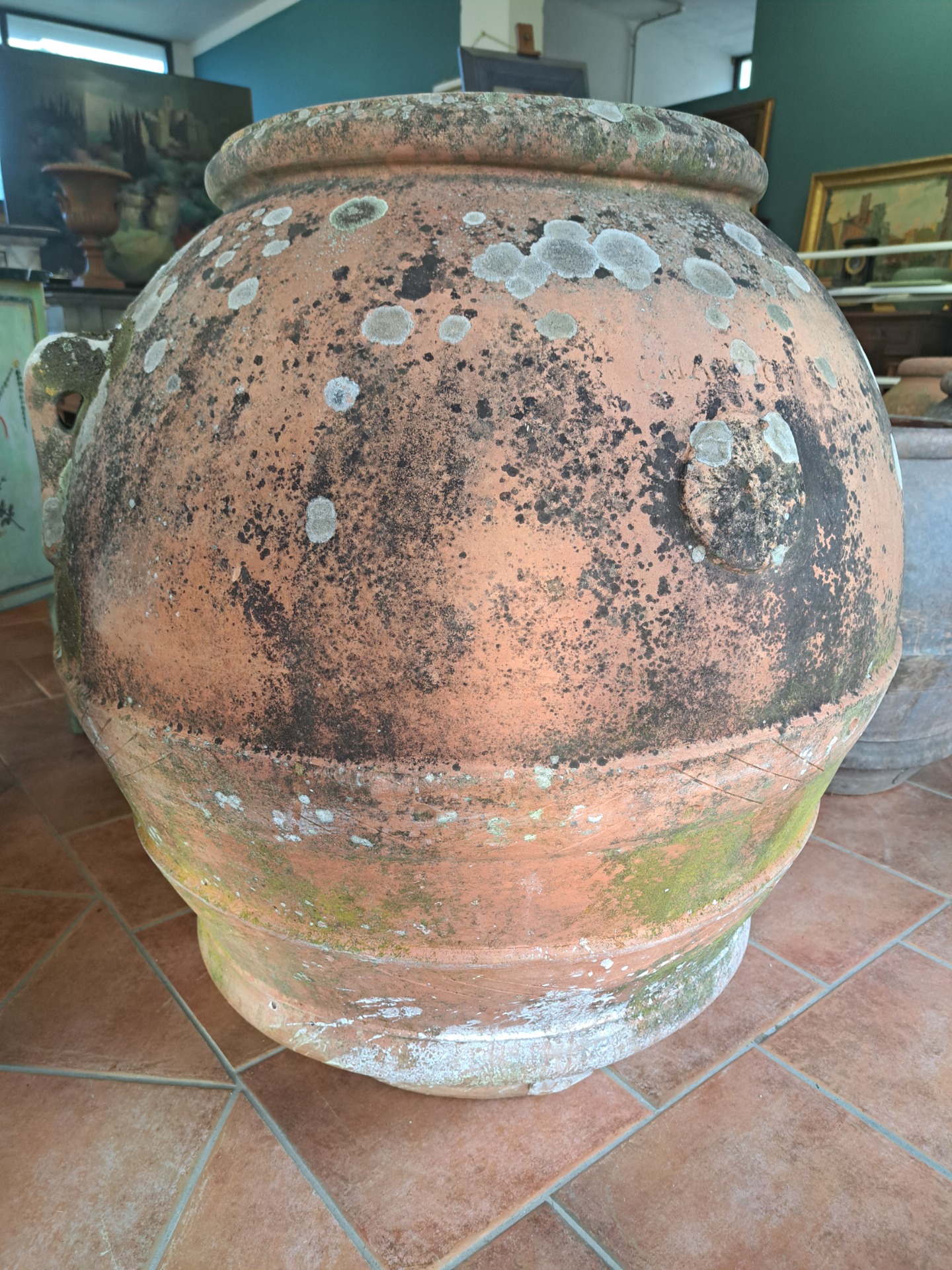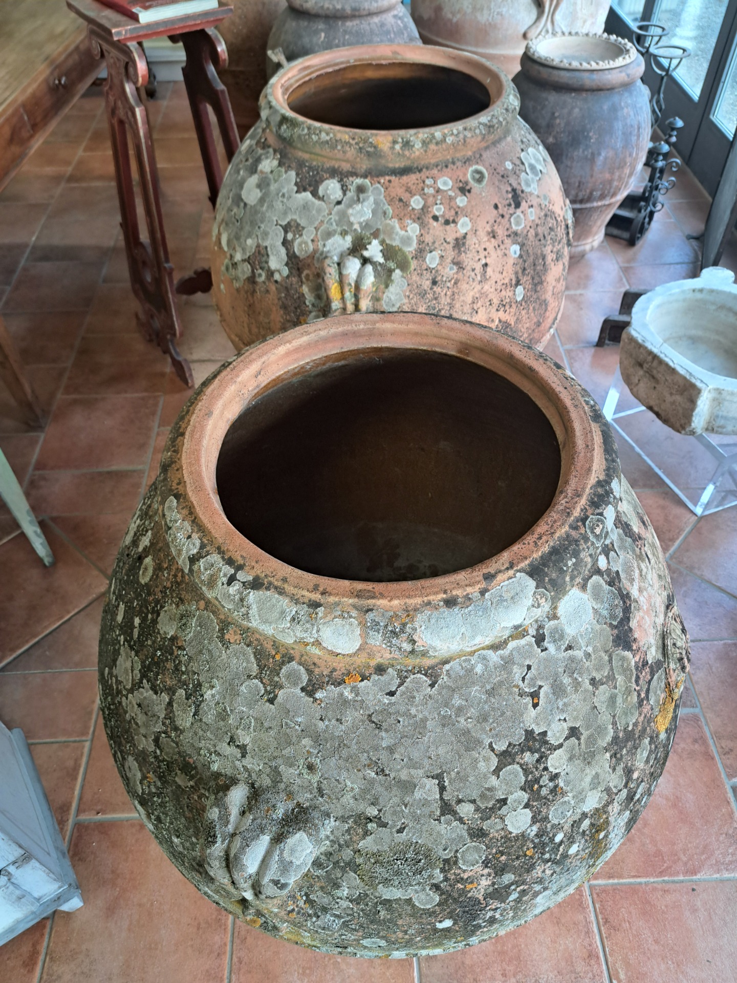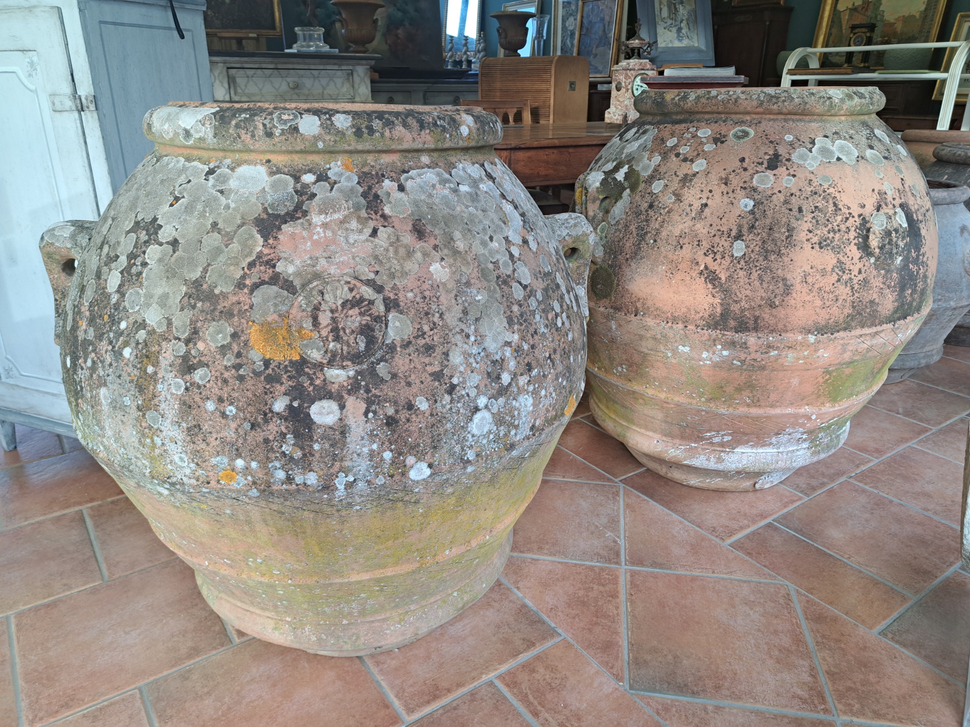 Wonderful pair of Impruneta terracotta jars, 19th century, almost identical in size and workmanship. Height approximately 1 meter, diameter 92 cm. Wonderful patina.