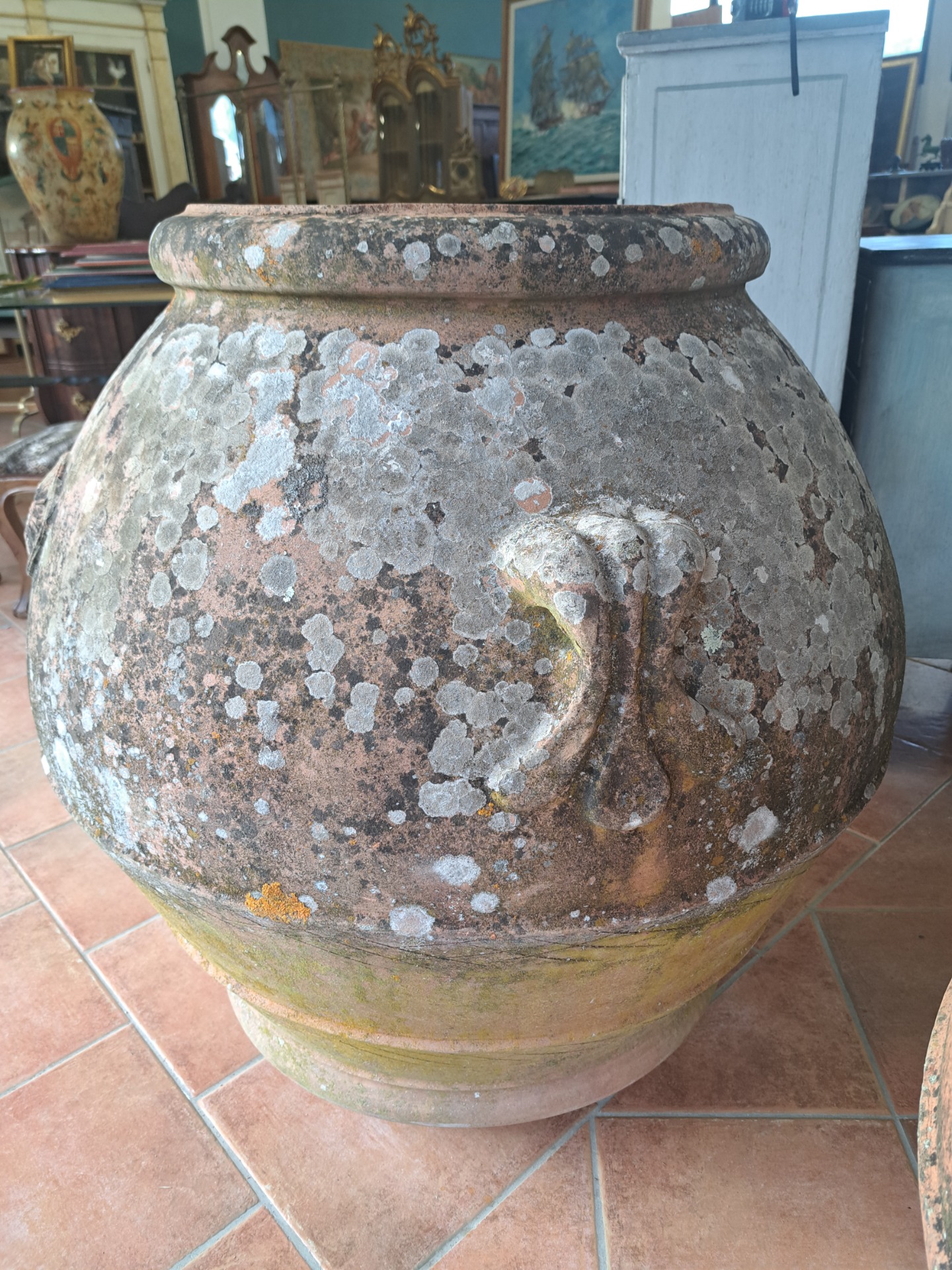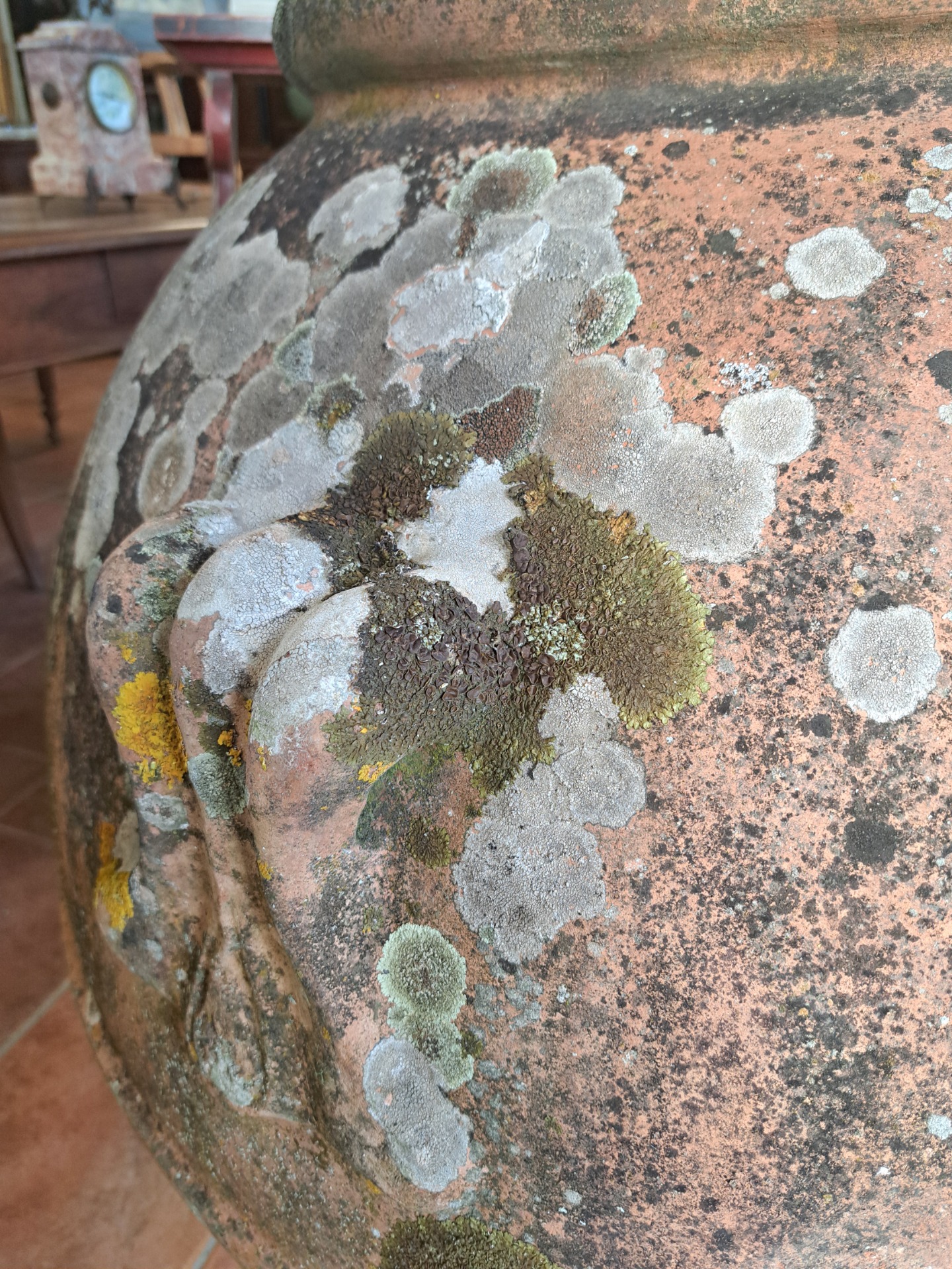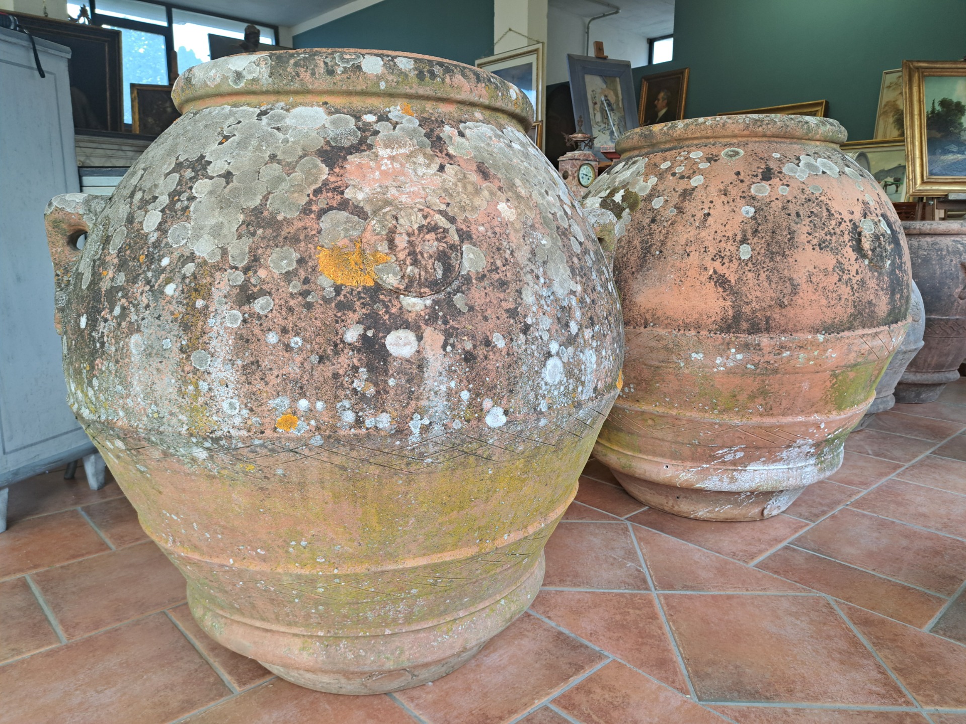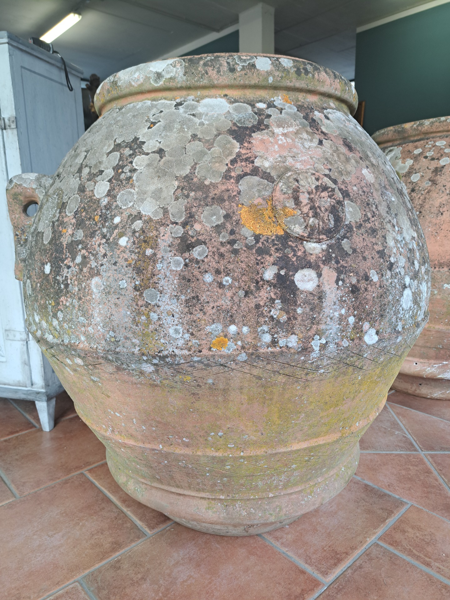 Wonderful pair of Impruneta terracotta jars, 19th century, almost identical in size and workmanship. Height approximately 1 meter, diameter 92 cm. Wonderful patina.