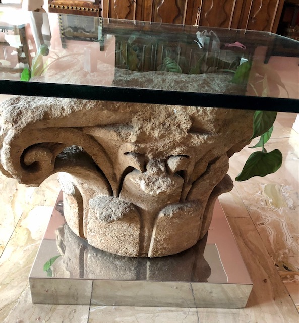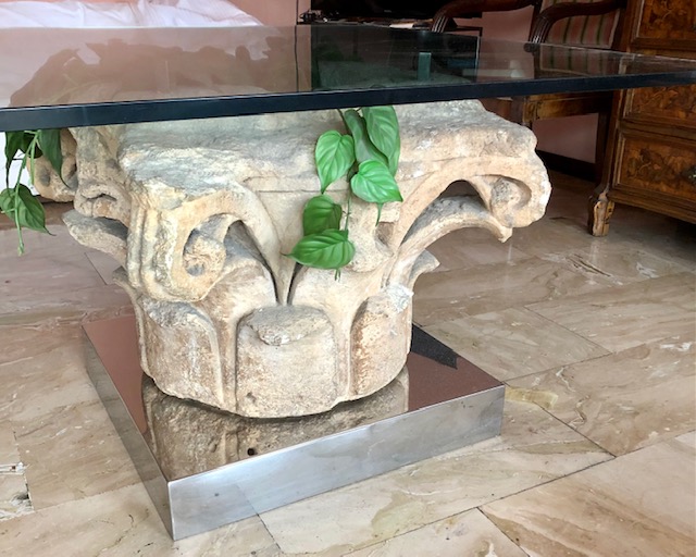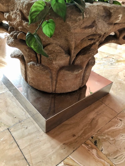Capitello romanico d'ordine corinzio in pietra scolpita a foglie vegetali