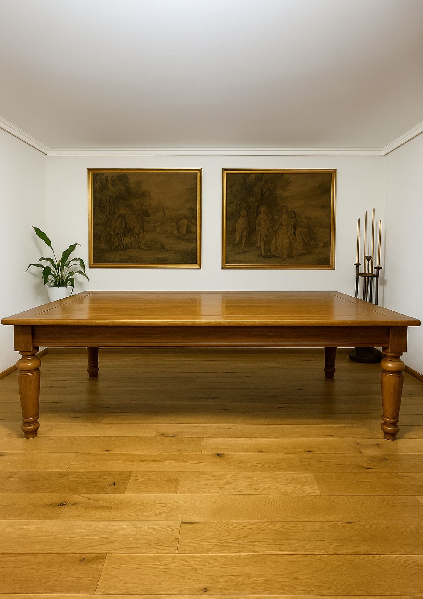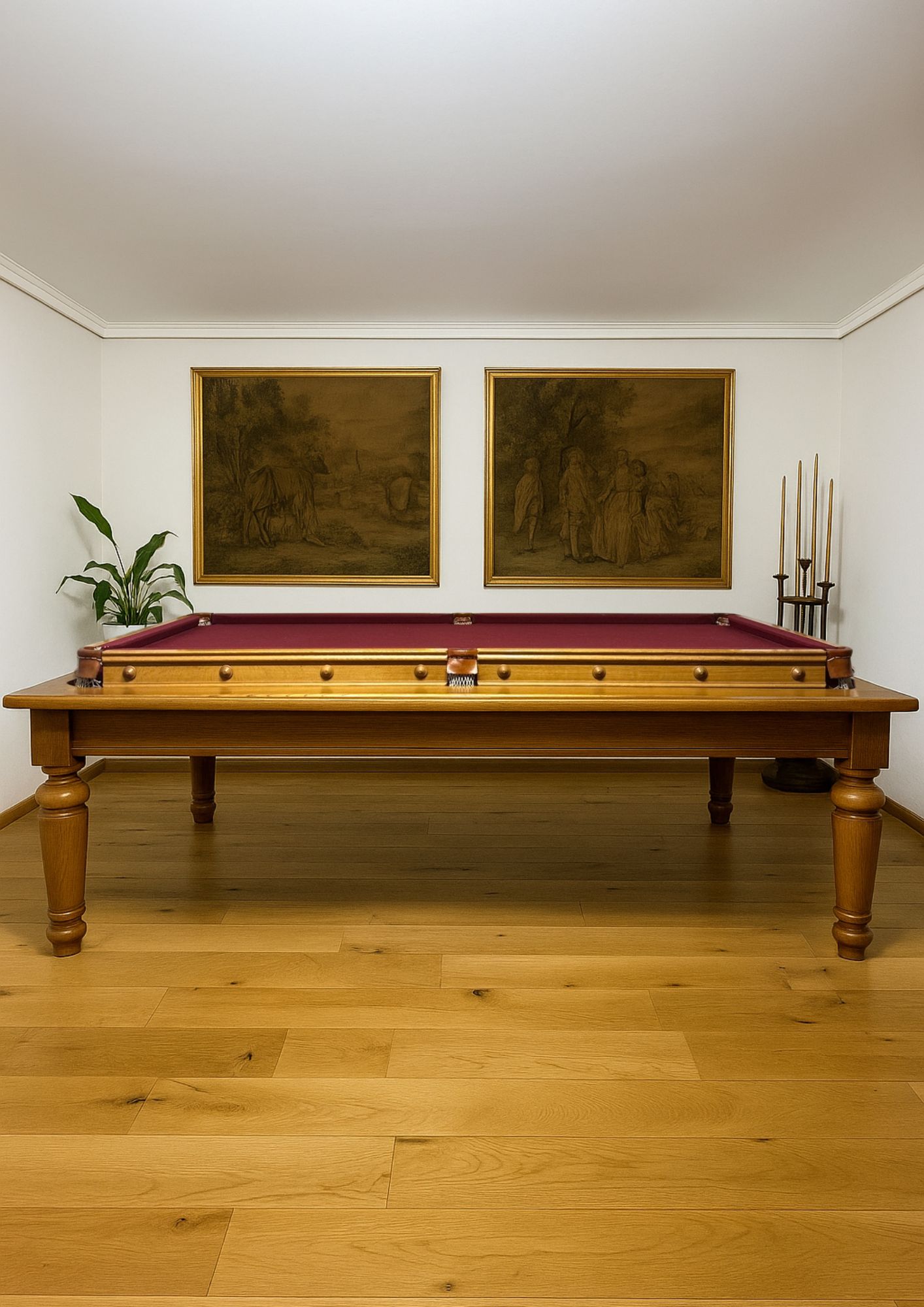 Antico biliardo in rovere ed ebano con meccanismo trasformabile “Rollover” (con piano girevole). Il piano, finemente intarsiato in ebano, gira su se stesso rivelando all’occorrenza un delizioso tavolo da pranzo in legno massello oppure un bellissimo piano da biliardo. Il piano da gioco è costituito da un’unica lastra in ardesia coperta da un panno in lana professionale, garantendo un gioco di altissima qualità.