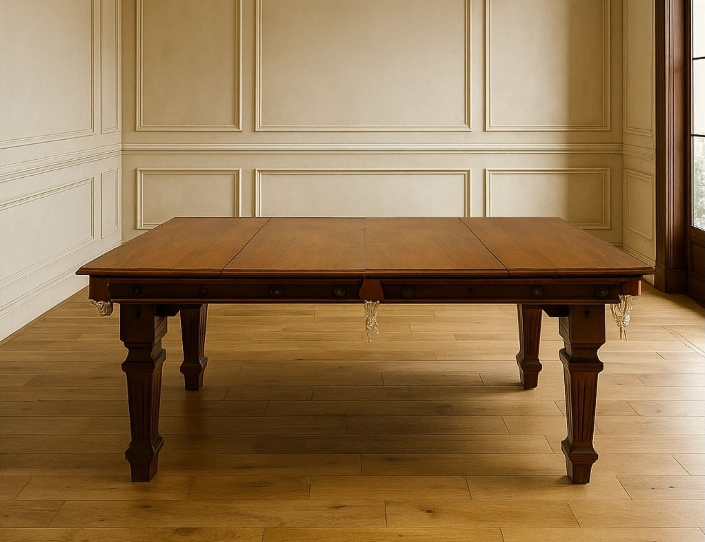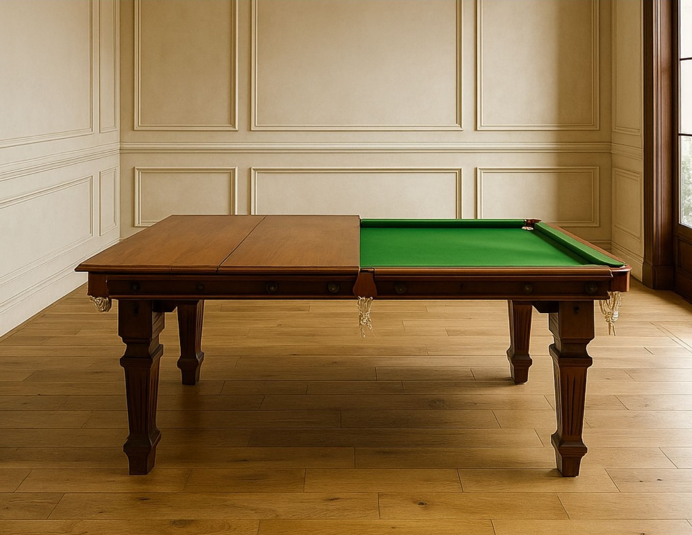 Biliardo in mogano trasformabile in tavolo da pranzo, con coperture originali. Tramite l’aggiunta di coperture originali in legno sul piano di gioco, potrete trasformare il biliardo in un raffinatissimo tavolo da pranzo. Il tavolo è dotato di un meccanismo che permette di regolarlo per raggiungere l’altezza ideale per il gioco (più alta rispetto alla classica altezza da pranzo). È dotato di piedini regolabili che favoriscono la messa in bolla del piano da gioco. Il piano da gioco è costituito da un’unica lastra in ardesia rivestita con un panno professionale in lana, per garantire un alta qualità di gioco.