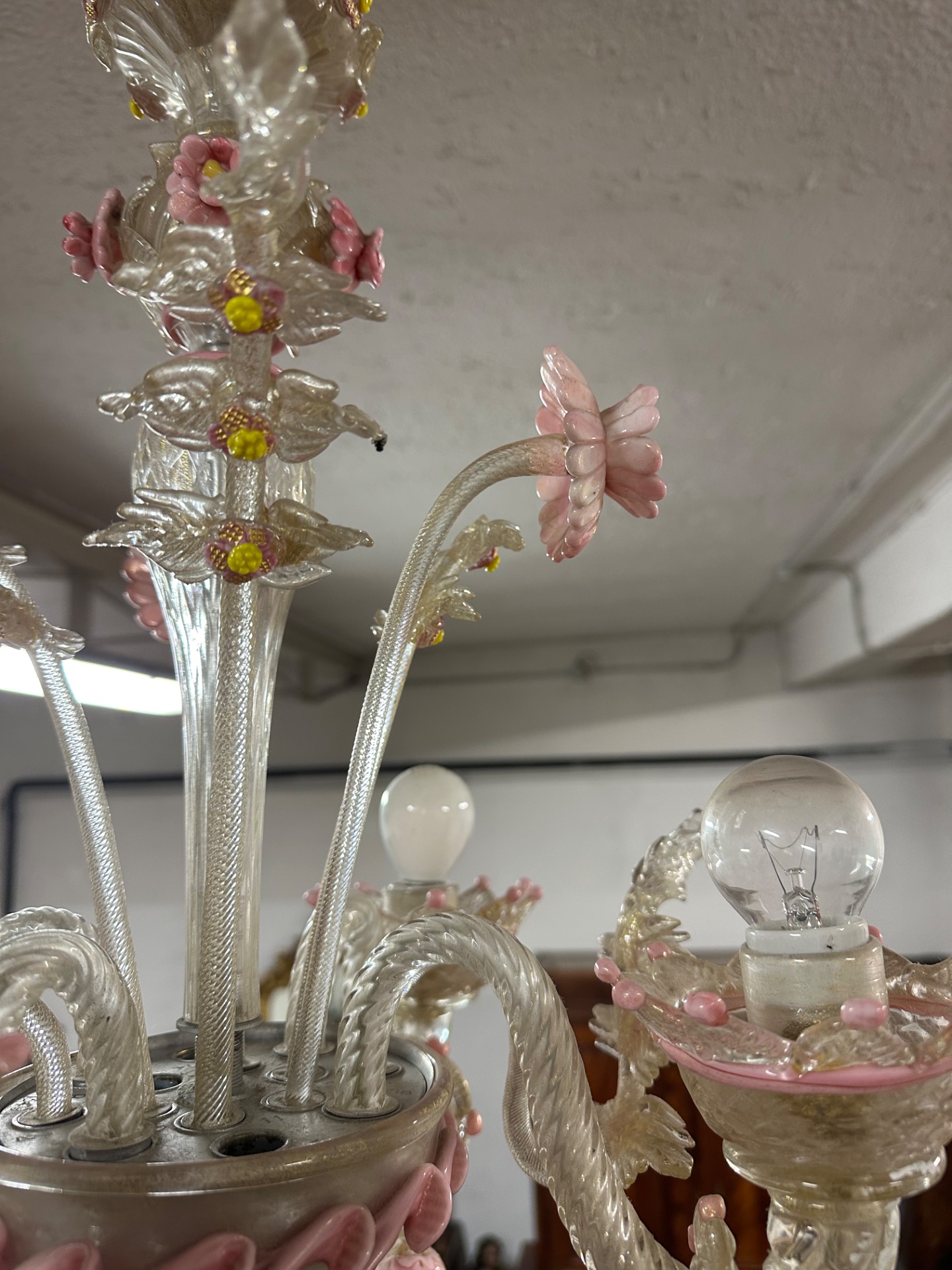 Late 19th century Murano four-light chandelier in blown glass, made like a floral bouquet in colorless glass with hot applications in shades of pink and yellow.