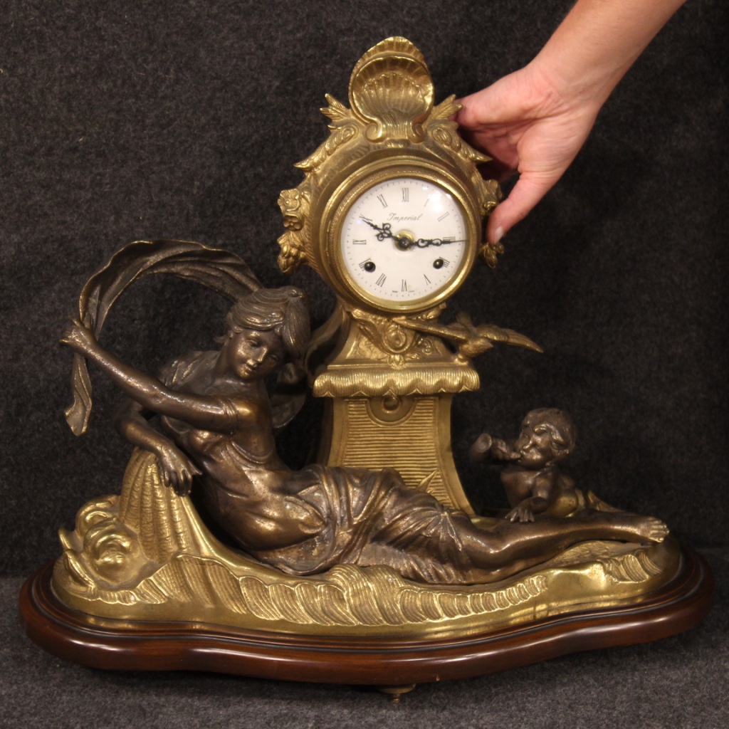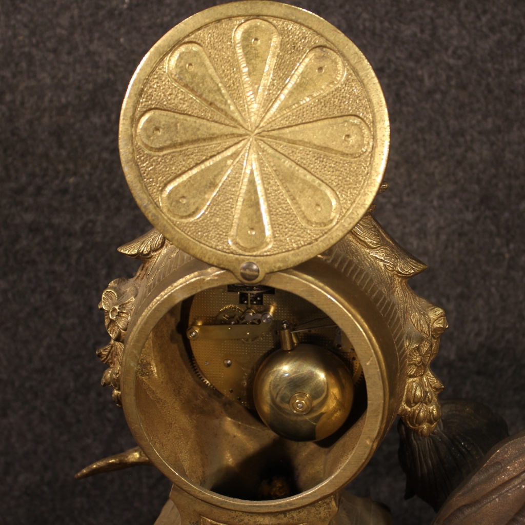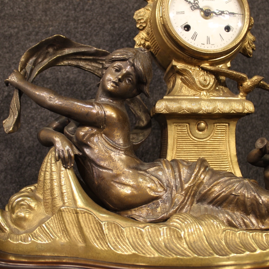 French clock from the first half of the 20th century. Gilt bronze and antimony object, patinated and chiseled adorned with sculptures, mahogany-colored lacquered wooden base. Clock supported by four feet positioned under the base, of good solidity. Non-original dial and mechanism (see photo) replaced during the 20th century. NOT WORKING watch, for antique dealers, restorers and collectors signed on the back (see photo) F. Moreau. Beautiful object and decoration, in patina. Structurally healthy, overall in good state of conservation. Mechanism to be revised.
