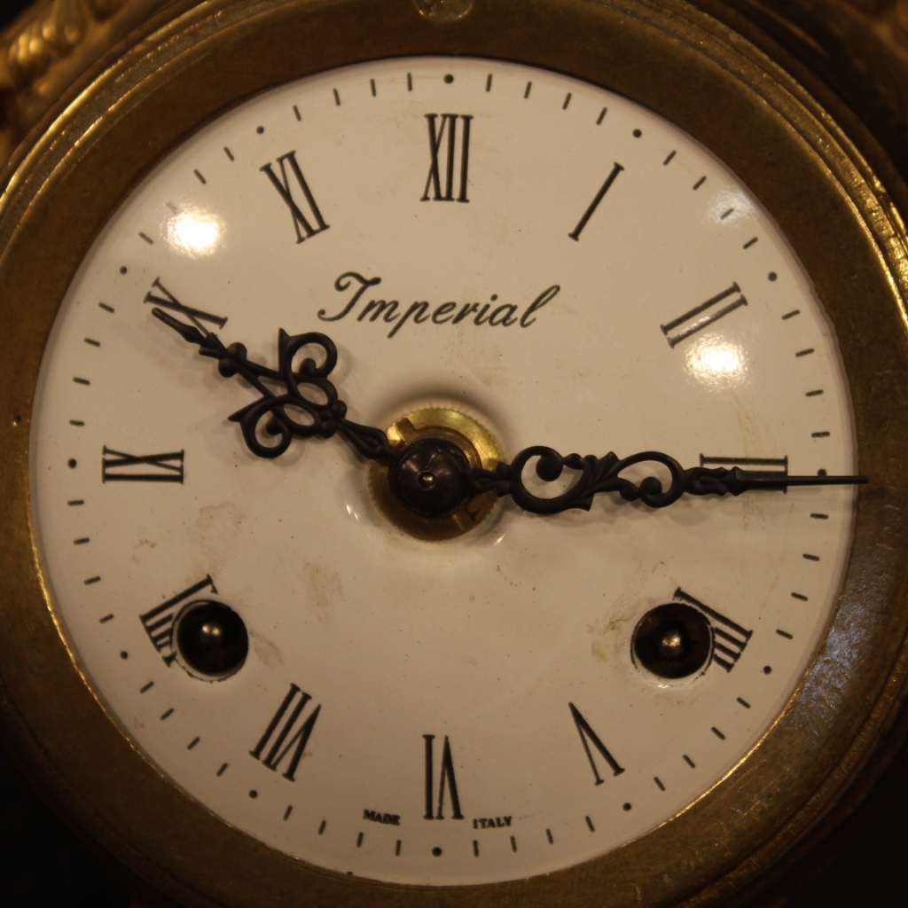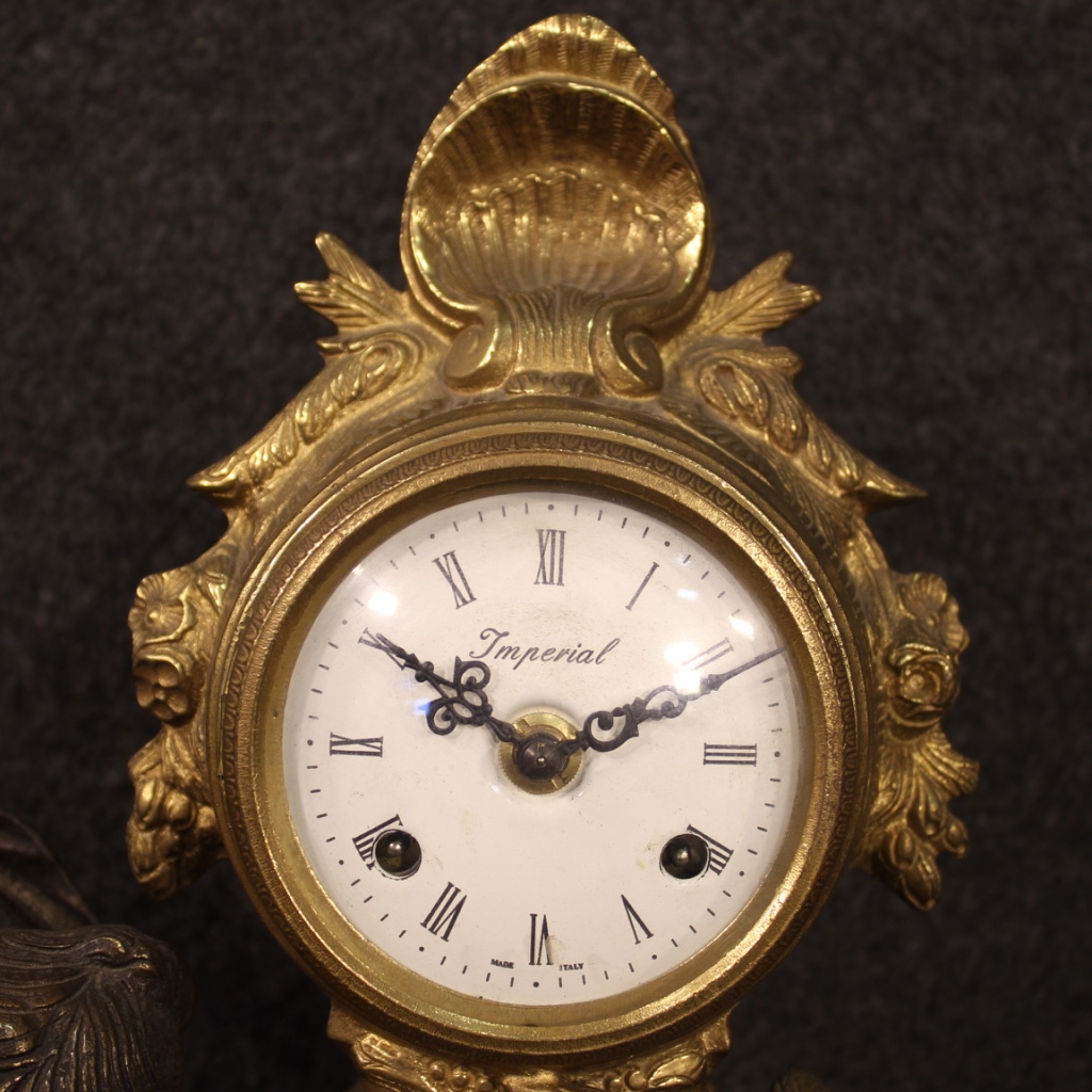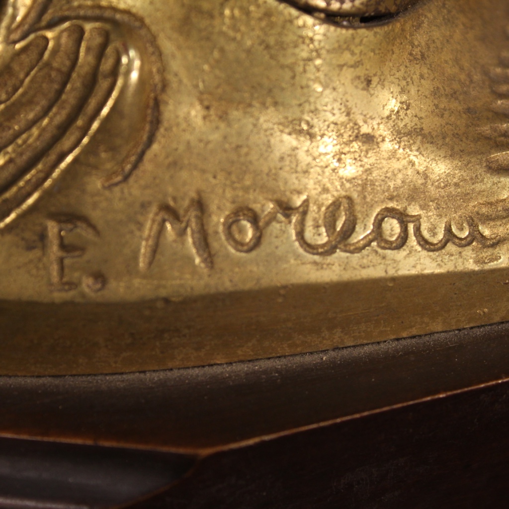French clock from the first half of the 20th century. Gilt bronze and antimony object, patinated and chiseled adorned with sculptures, mahogany-colored lacquered wooden base. Clock supported by four feet positioned under the base, of good solidity. Non-original dial and mechanism (see photo) replaced during the 20th century. NOT WORKING watch, for antique dealers, restorers and collectors signed on the back (see photo) F. Moreau. Beautiful object and decoration, in patina. Structurally healthy, overall in good state of conservation. Mechanism to be revised.