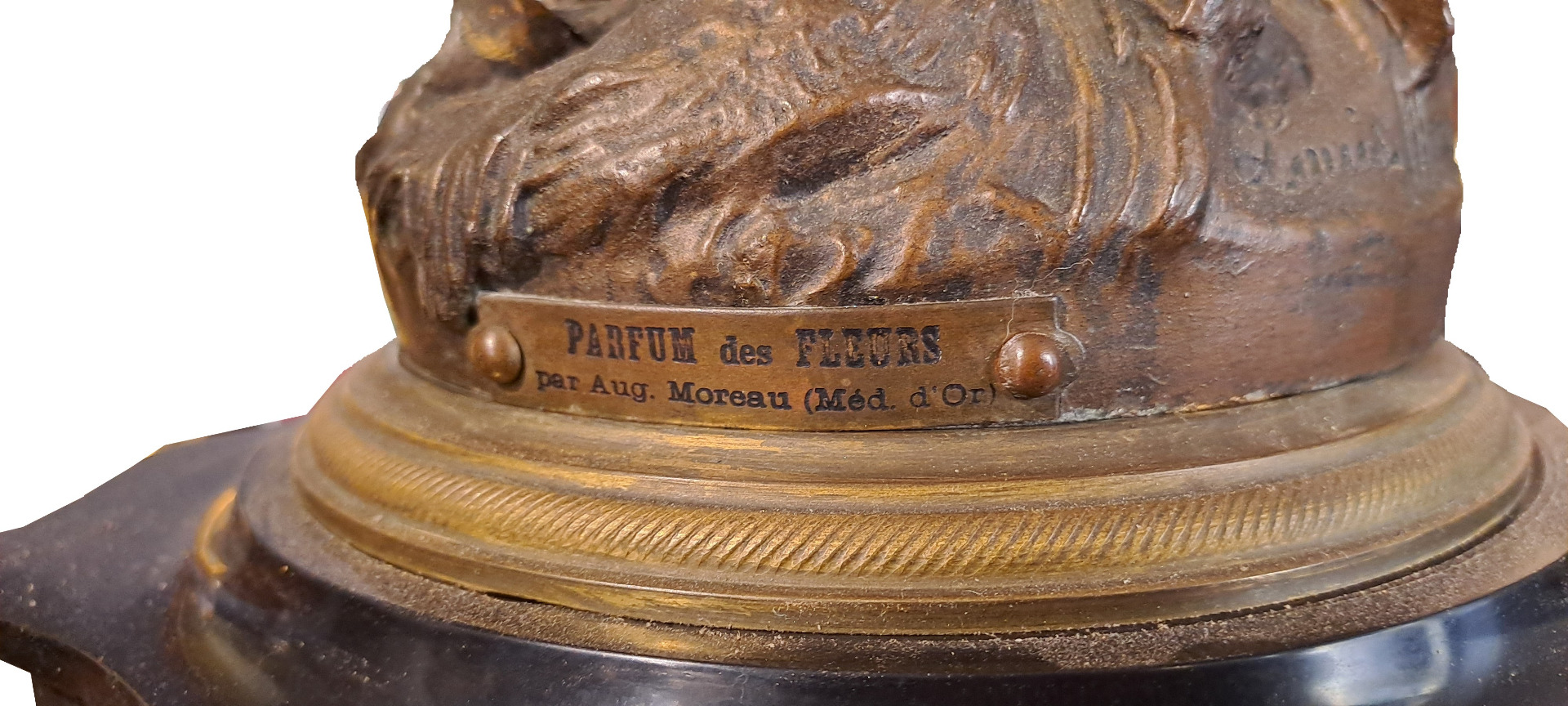 * Artist Details: Auguste Moreau, a member of the celebrated Moreau family of sculptors, is known for his allegorical and graceful figures, typical of the Belle Époque taste. The mention "Méd. d’Or" (Gold Medal) on the cartouche indicates the success and recognition of the artist's work during his lifetime, often during the exhibitions of the Paris Salon.