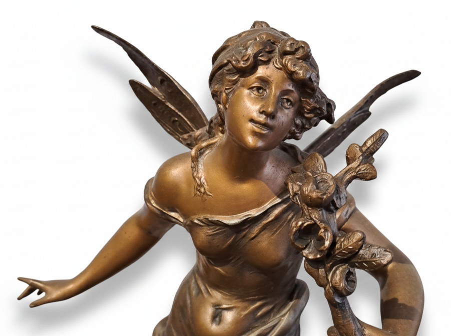 * Style and Details: The work combines the neoclassical harmony of the female figure with the dynamism and floral grace typical of Art Nouveau. The wings, the flowing robe, and the flower motif are all distinctive elements of his art. The base of the sculpture features the sculptor's signature.