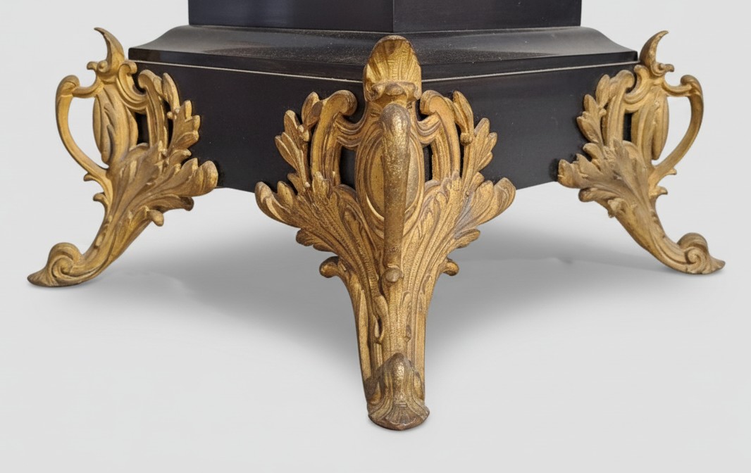 * The clock case is a plinth base in black marble, resting on elegant Louis XV style gilded bronze volute feet, adding a touch of great refinement.