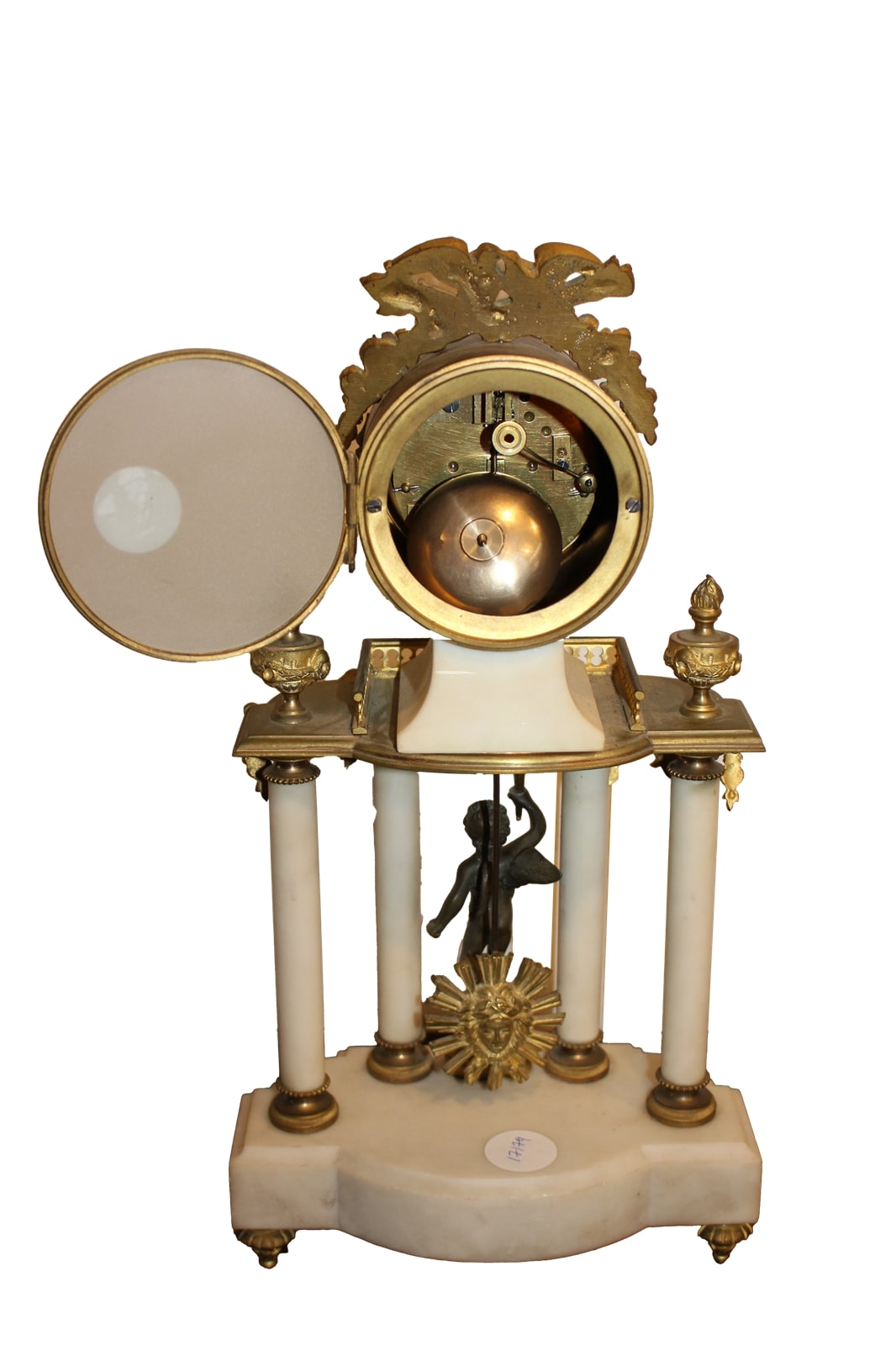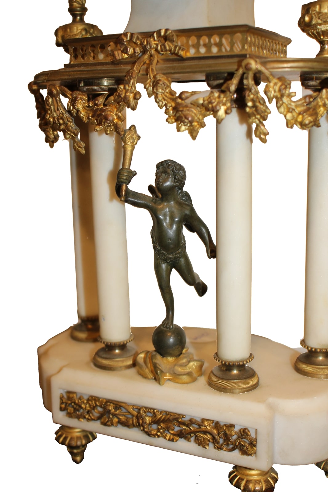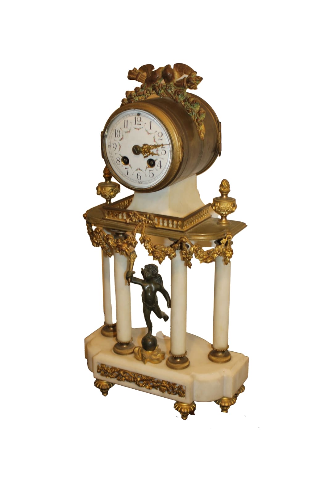 The architectural structure, supported by four marble columns with gilded bases and capitals, is embellished with festoon, bow and finely crafted urn decorations. Under the body of the clock stands a burnished bronze putto figure, symbol of grace and lightness, holding a torch.