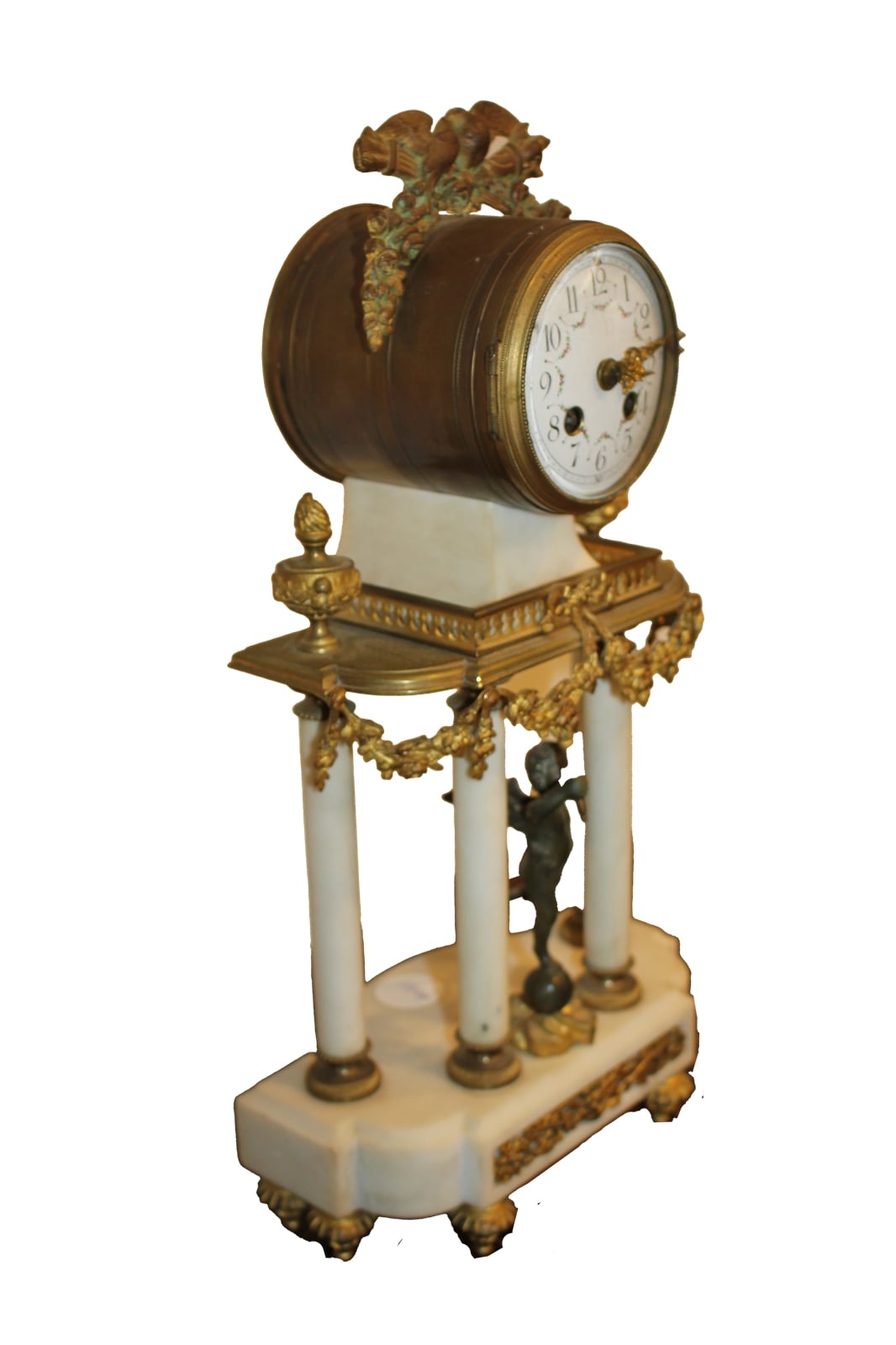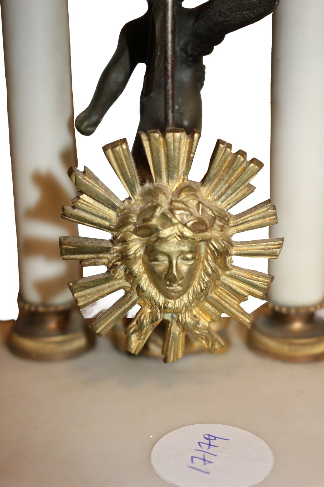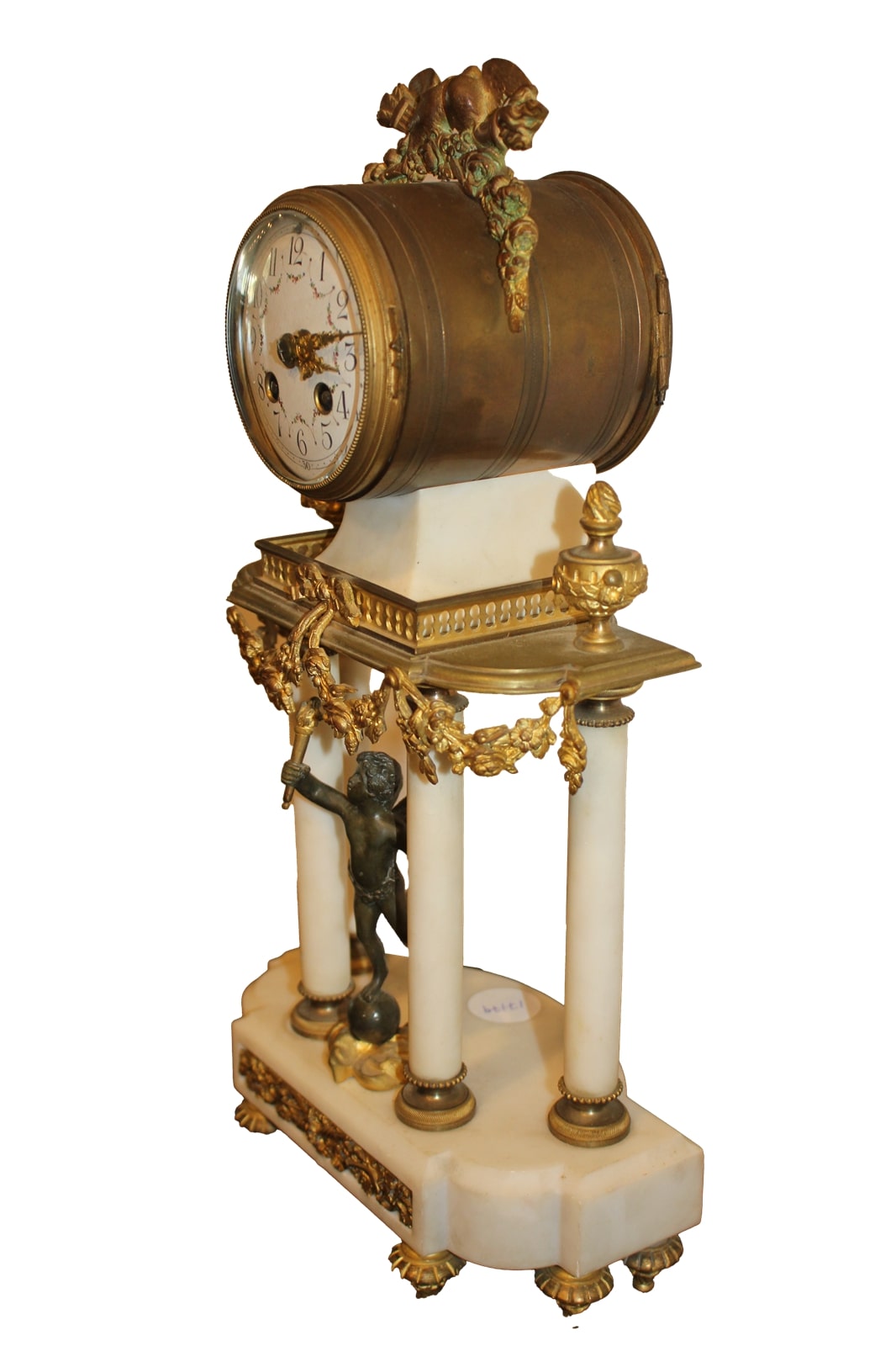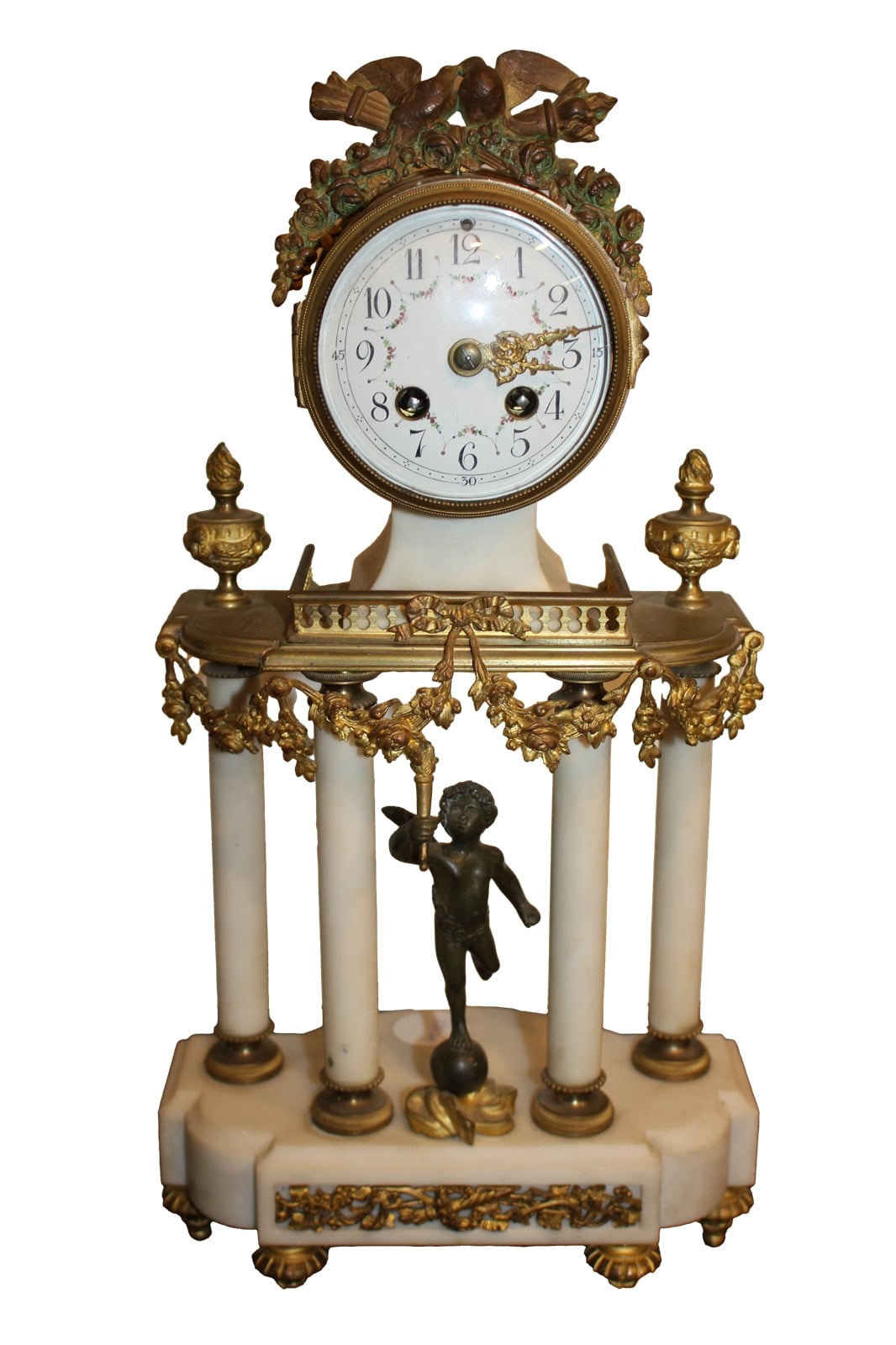 The architectural structure, supported by four marble columns with gilded bases and capitals, is embellished with festoon, bow and finely crafted urn decorations. Under the body of the clock stands a burnished bronze putto figure, symbol of grace and lightness, holding a torch.