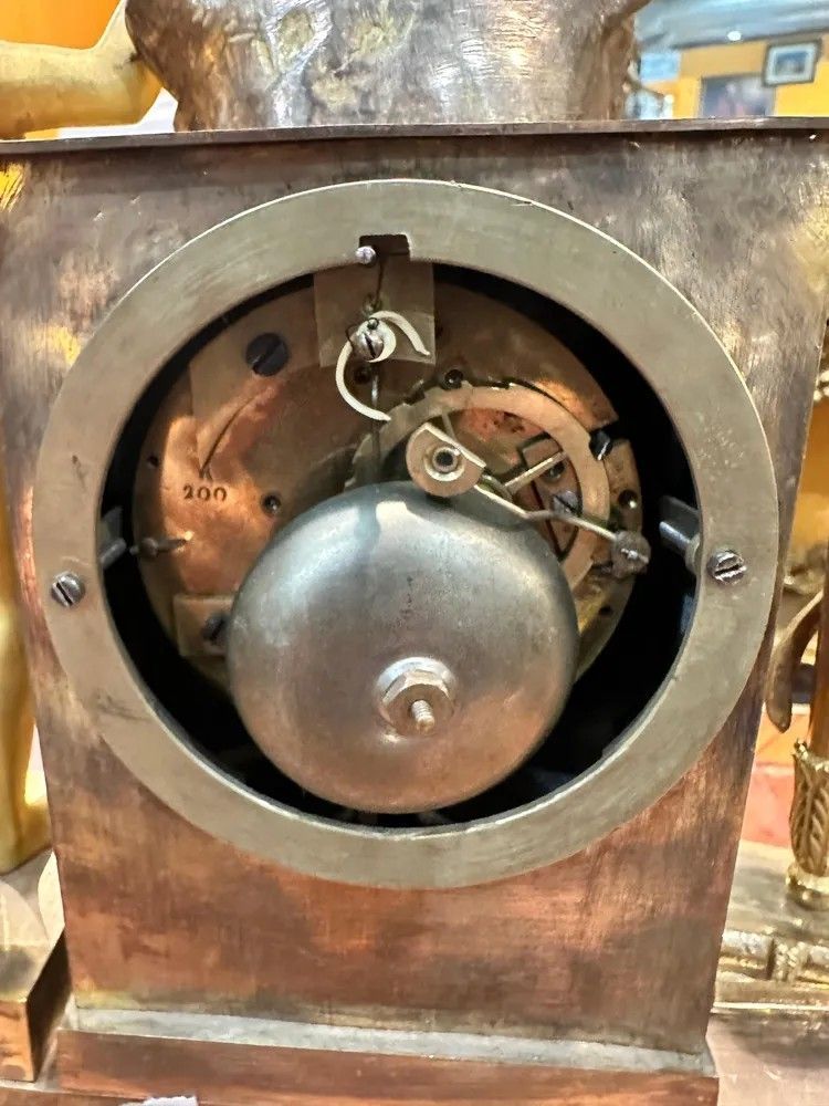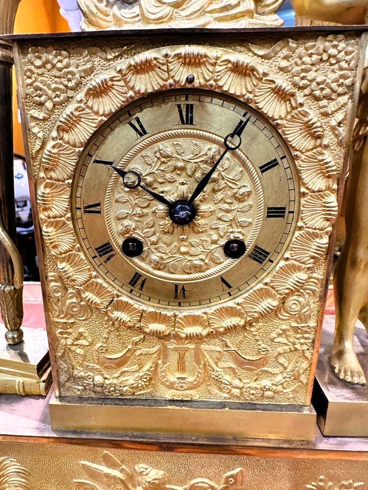 Questo straordinario orologio da tavolo Impero in bronzo dorato al mercurio porta in casa tutta la magnificenza del gusto neoclassico francese dei primi anni dell’800. La cassa è articolata su un basamento rettangolare poggiante su piedi a plinto decorati da corone d’alloro, mentre il fronte è impreziosito da un raffinato rilievo: una Nike alata che vola portando una corona di alloro, un tempietto ionico, palme e libri sparsi, simboli di vittoria, sapere e virtù.Sul corpo centrale campeggia il quadrante dorato con numeri romani, riccamente incorniciato da ghirlande, conchiglie e motivi floreali incisi a bulino. A sinistra un’ardente torcia della conoscenza avvolta da un ramo di lauro; a destra una figura scolpita a tutto tondo di un giovane alato – probabilmente Eros o la Vittoria – che solleva un rotolo. Al di sopra si erge una stele fra le nuvole recante le iscrizioni “PLINE – TASE – PLATON”, omaggio agli autori classici Plinio, Tacito e Platone e dunque alla sapienza antica tanto cara all’Impero.Epoca: Primo quarto del XIX secolo (c. 1810-1820)Stile: Impero franceseMateriale: Bronzo dorato al mercurio, parti bruniteMeccanismo: Movimento a pendolo con sospensione a seta, suoneria ore e mezze su campanello (8 giorni di autonomia)Condizioni: Doratura originale molto ben conservata; funzionamento revisionato da maestro orologiaioProvenienza: Collezione privata, ItaliaOggetto di grande fascino decorativo, ideale per studio, sala o libreria, ma anche pezzo da collezione per appassionati di orologeria antica e design neoclassico. Un simbolo di prestigio destinato a impreziosire qualsiasi ambiente contemporaneo.Stile: Impero Materiale: BronzoAltezza (cm): 43Larghezza (cm): 29Profondità (cm): 10Epoca: XIX Secolo - 1800