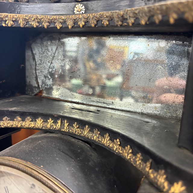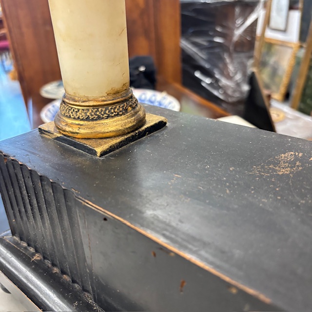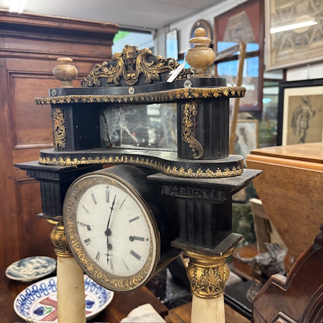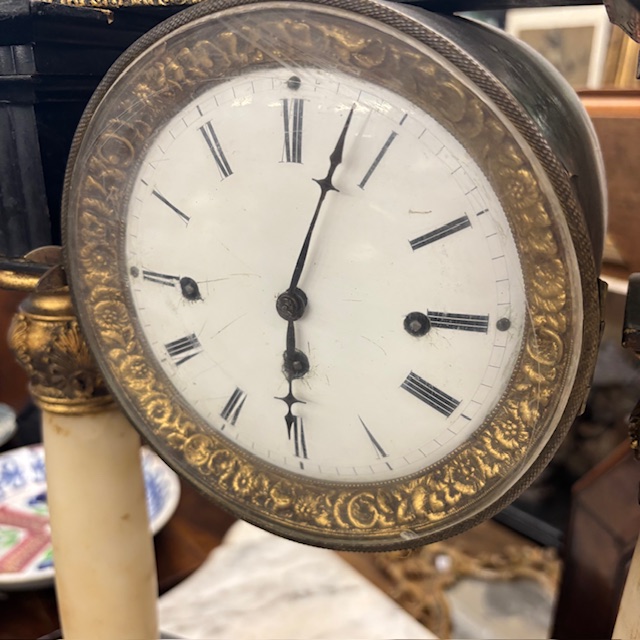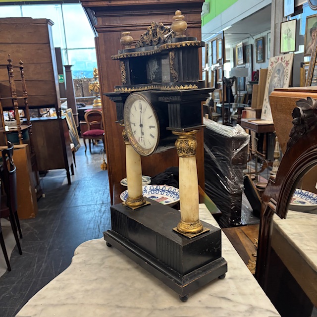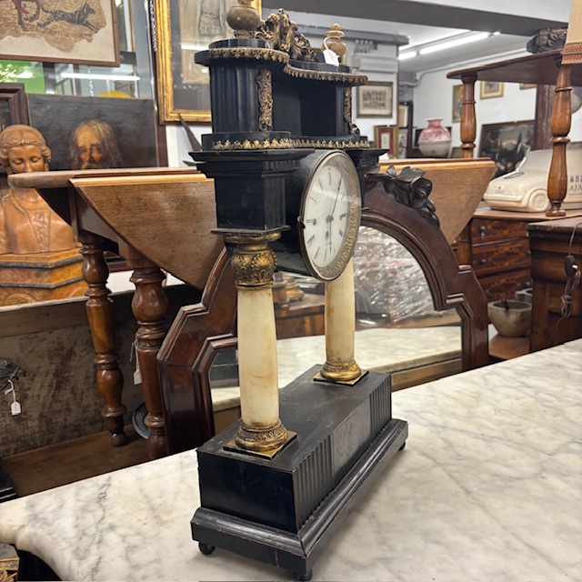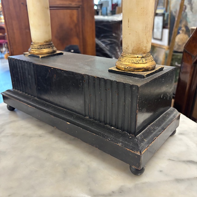 Antique Empire clock from the early 1800s in lacquered wood, marble columns. Dimensions: 36 x 15, H 63 cm.
